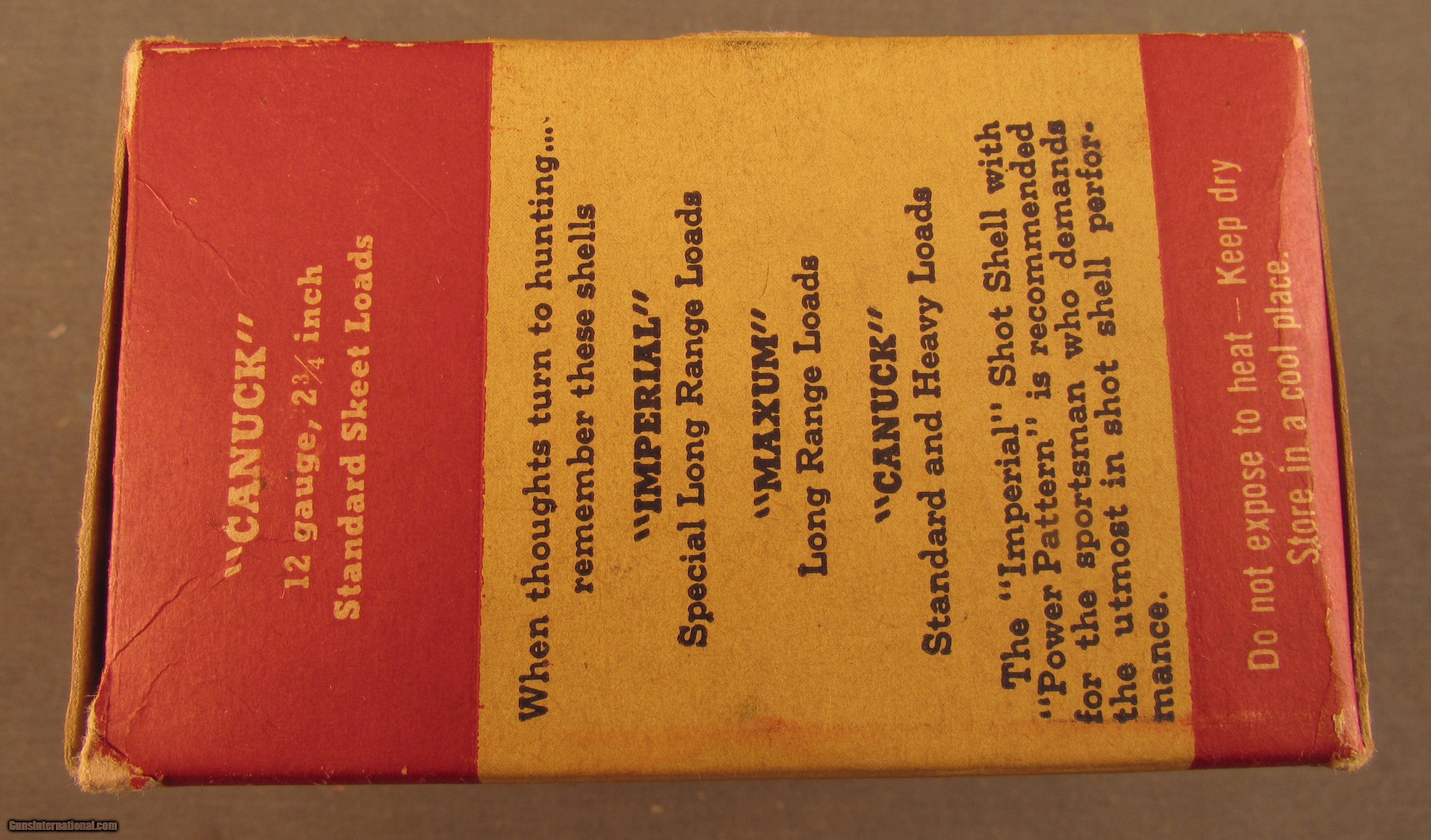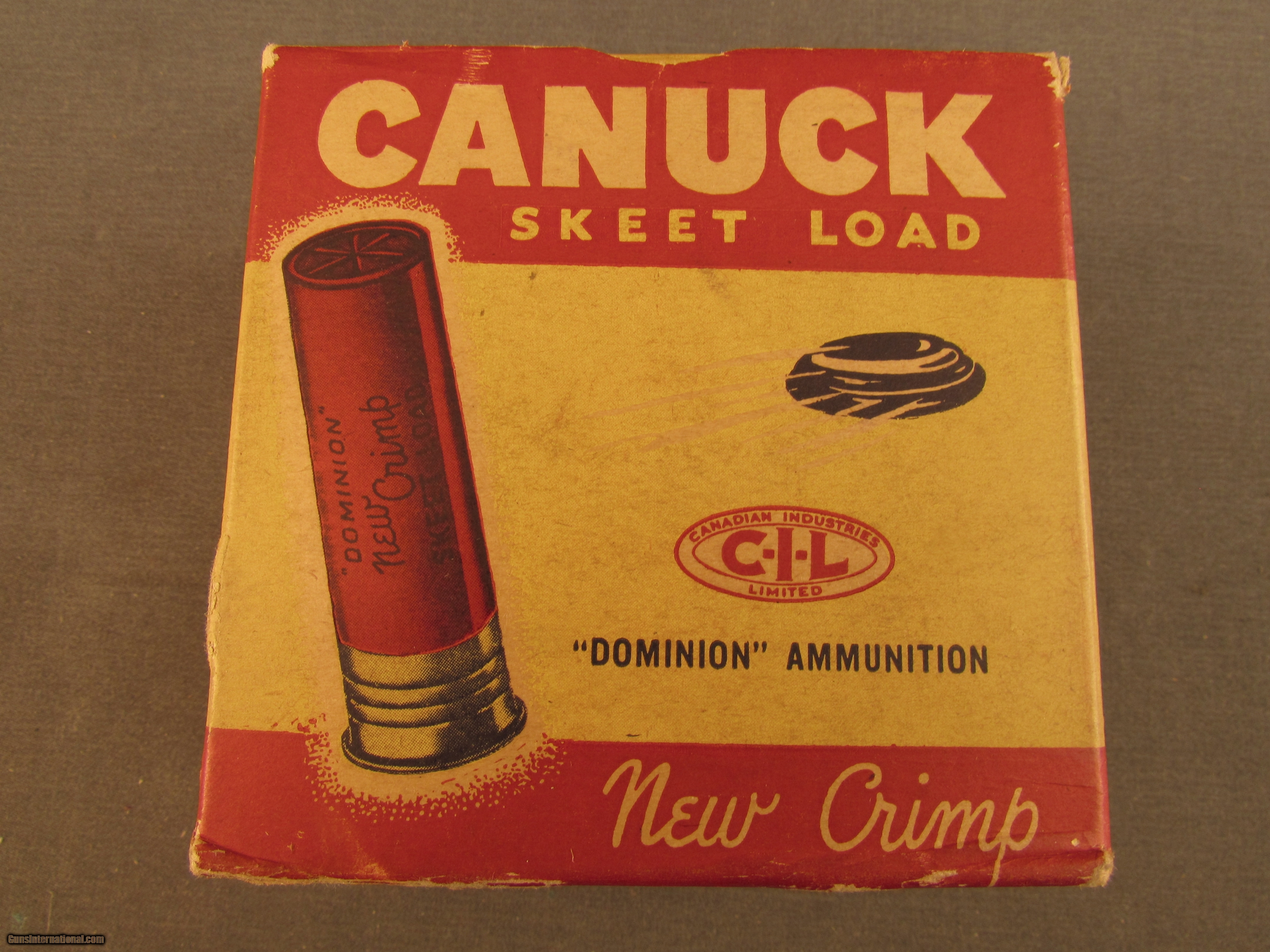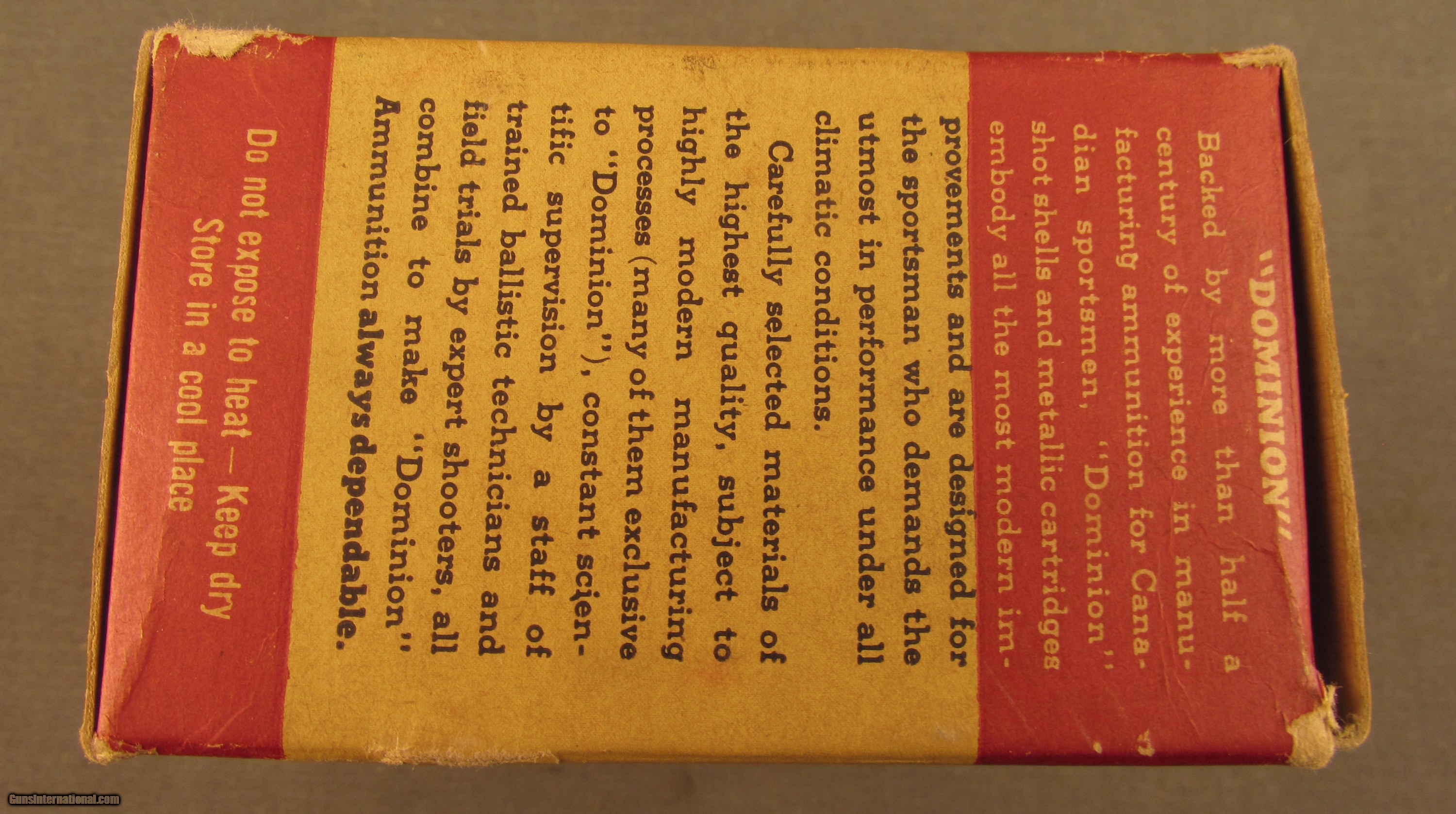 Description: This full box is coded "BAHF6WX" indicating Feb 18, 1948 loading date. Features include the short lived double oval logo with company name in border, Dominion ammunition and new crimp callouts . The red paper rose crimped shells are marked on side "Dominion New Crimp Skeet load No 9 Shot" in the reverse direction from shell on box label. Box shows some light shelf wear and a few small scuffs. SOLD Manufacturer: CIL Model: Ammo Caliber Info: 12ga Gauge Info: 12ga |