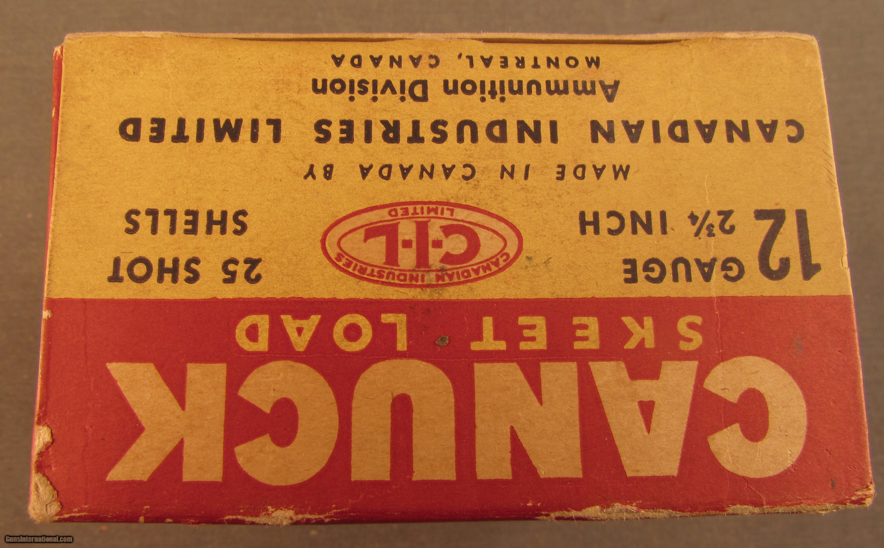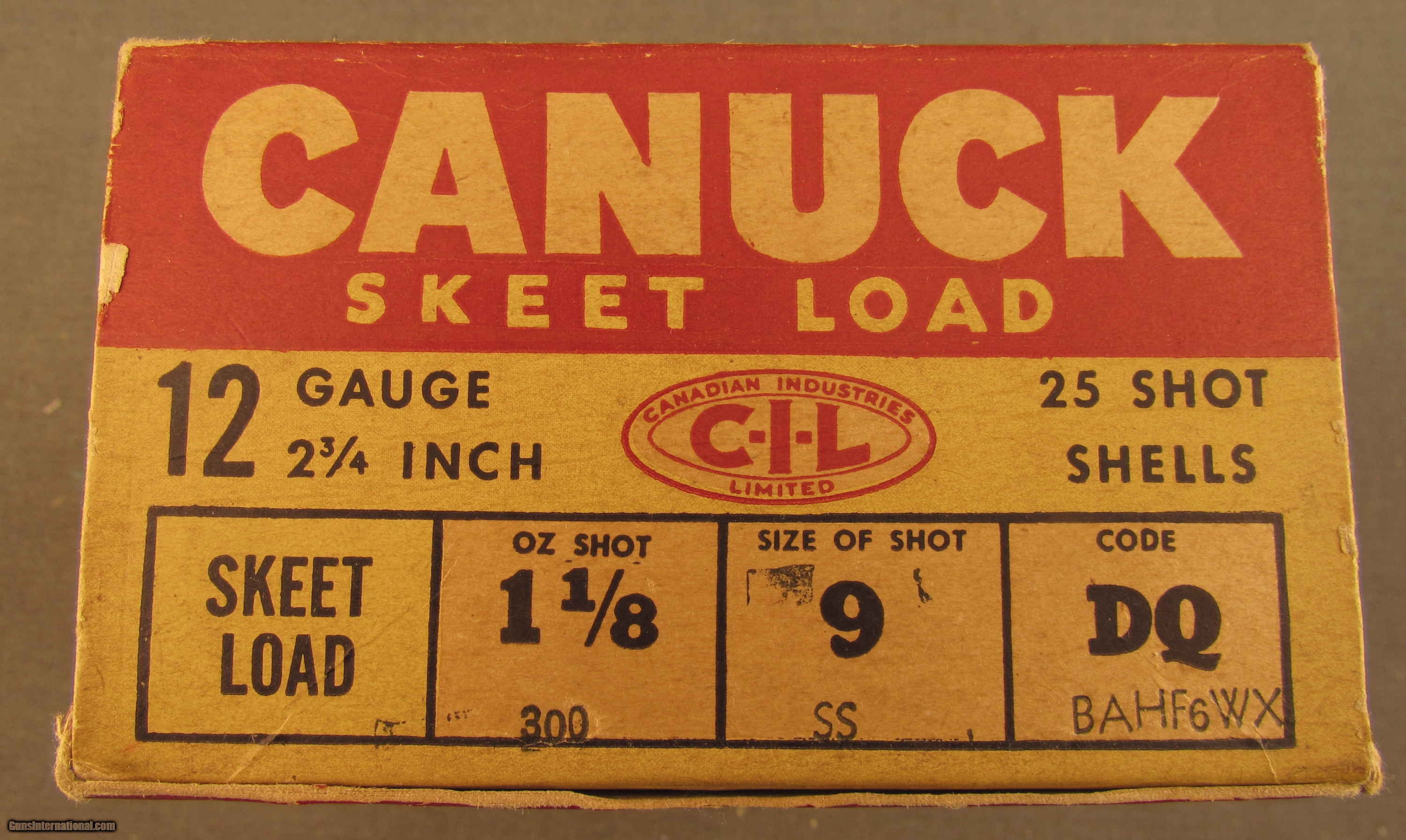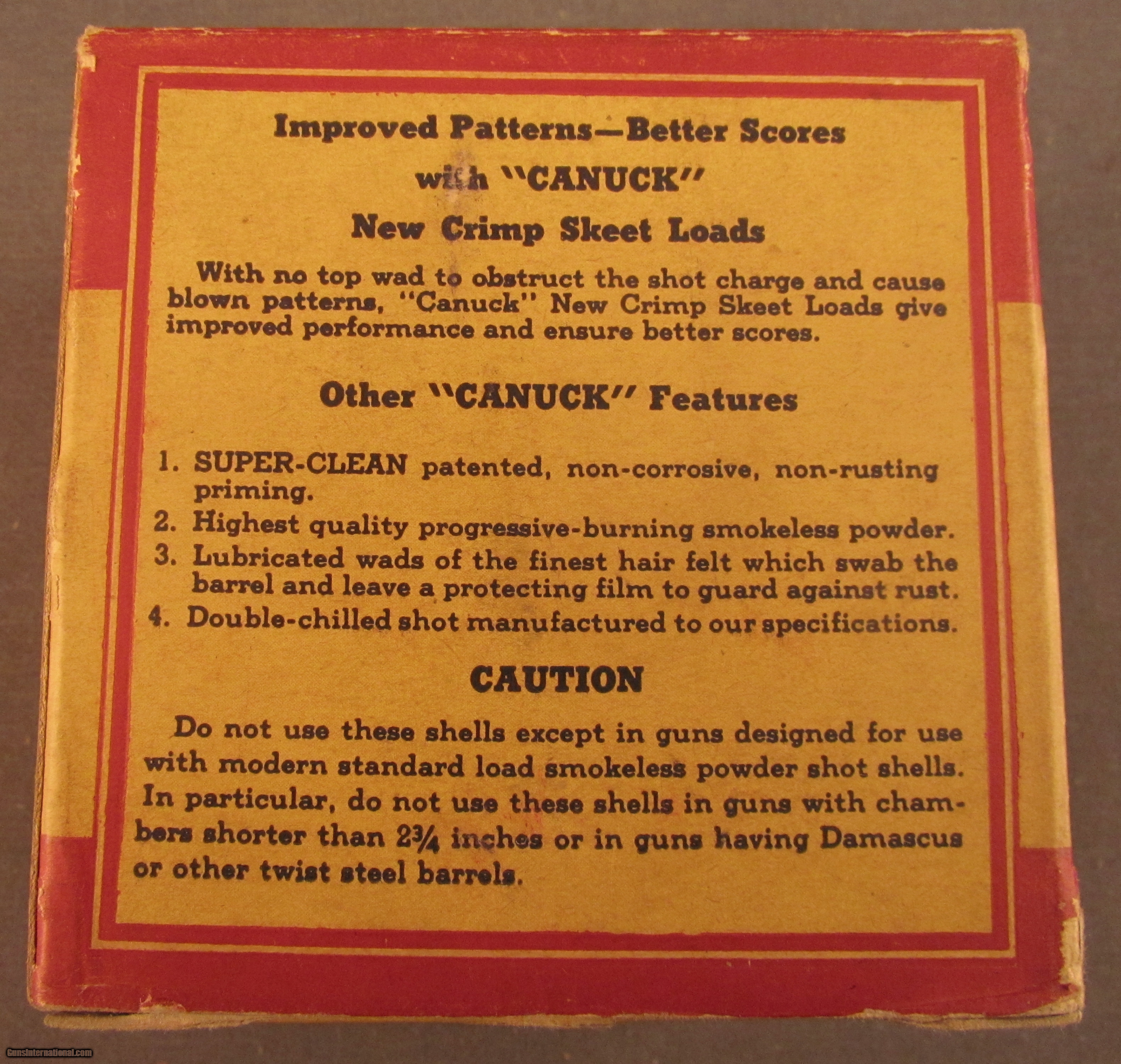 Description: This full box is coded "BAHF6WX" indicating Feb 18, 1948 loading date. Features include the short lived double oval logo with company name in border, Dominion ammunition and new crimp callouts . The red paper rose crimped shells are marked on side "Dominion New Crimp Skeet load No 9 Shot" in the reverse direction from shell on box label. Box shows some light shelf wear and a few small scuffs. SOLD Manufacturer: CIL Model: Ammo Caliber Info: 12ga Gauge Info: 12ga |