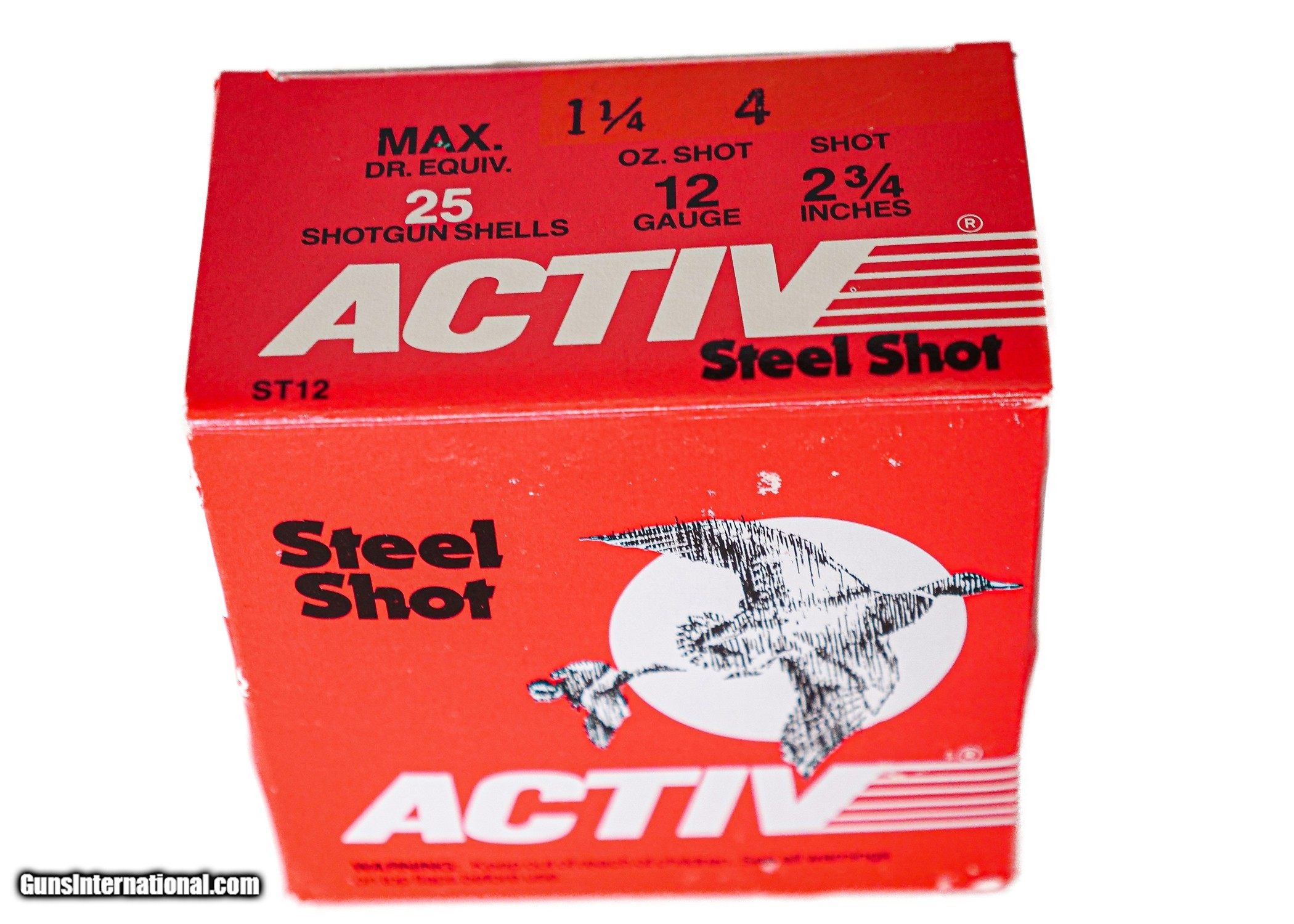 Description: A 25-Pack of Activ Steel Shot Shells, 12ga, 2 3/4" Shell, 1 1/4 Oz Shot, 4 Shot. SOLD |