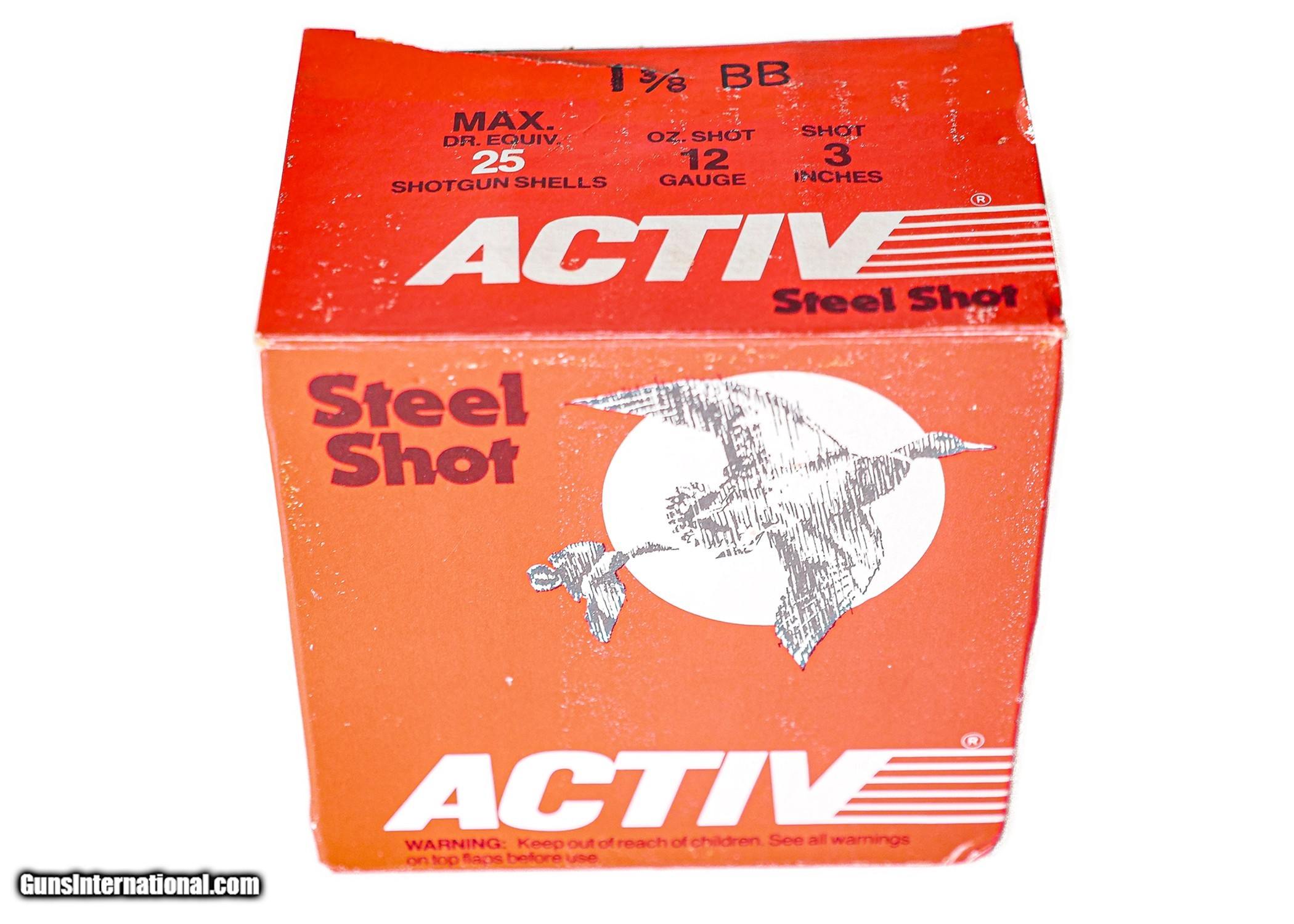 Description: A 25-Pack of Activ Steel Shot Shells, 12ga, 3", 1 3/8 Oz Shot, BB. SOLD |