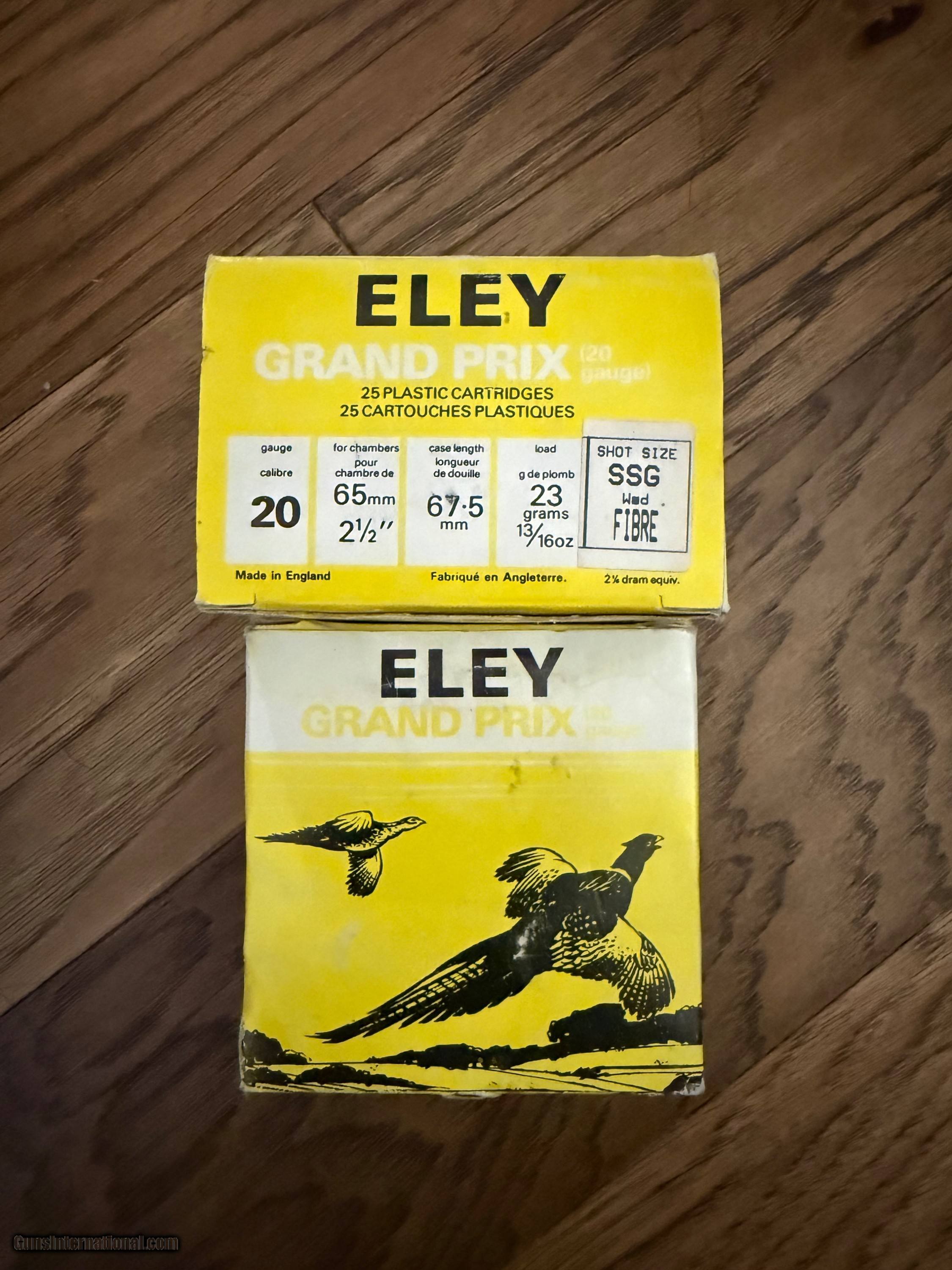 Description: I have two boxes of Eley Grand Prix 20ga 2.5" ssg shot size. This is hard to come by so get it while you can. $50 for both boxes. Shotgun Gauge: 20 Gauge Price: $50.00 Shipping: $15.00 Pay with