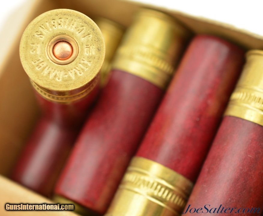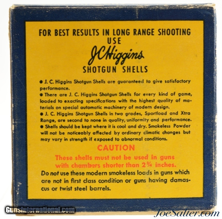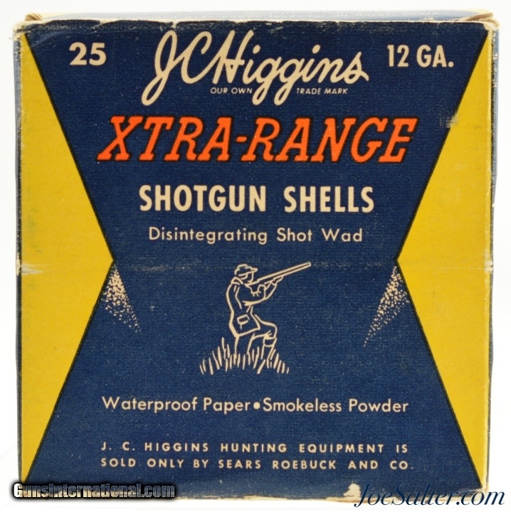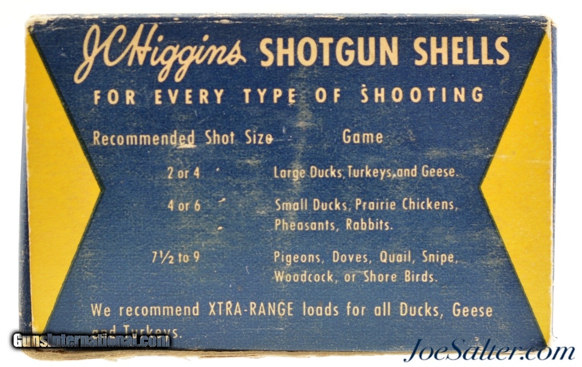 Description: This is a partial box, 24 original rounds, of J.C. Higgins 12 Gauge paper hull shotgun shells sold by Sears, Roebuck & Co. with #7 ½ shot. The yellow, blue and orange box is in excellent condition with some minor edge and corner wear. The paper hull shotgun shells are in excellent condition. A great looking box to display with your old Sears shotgun. SOLD |