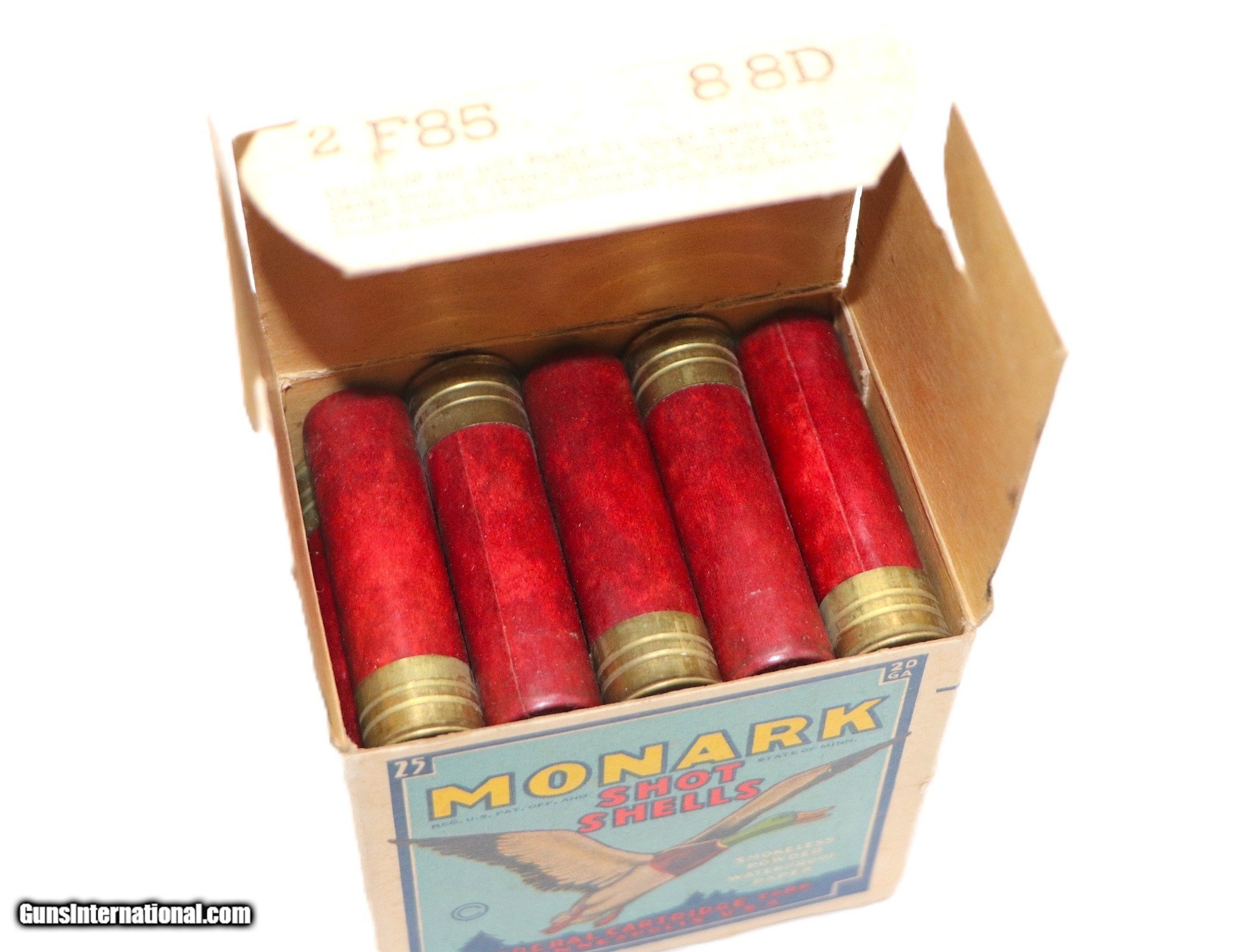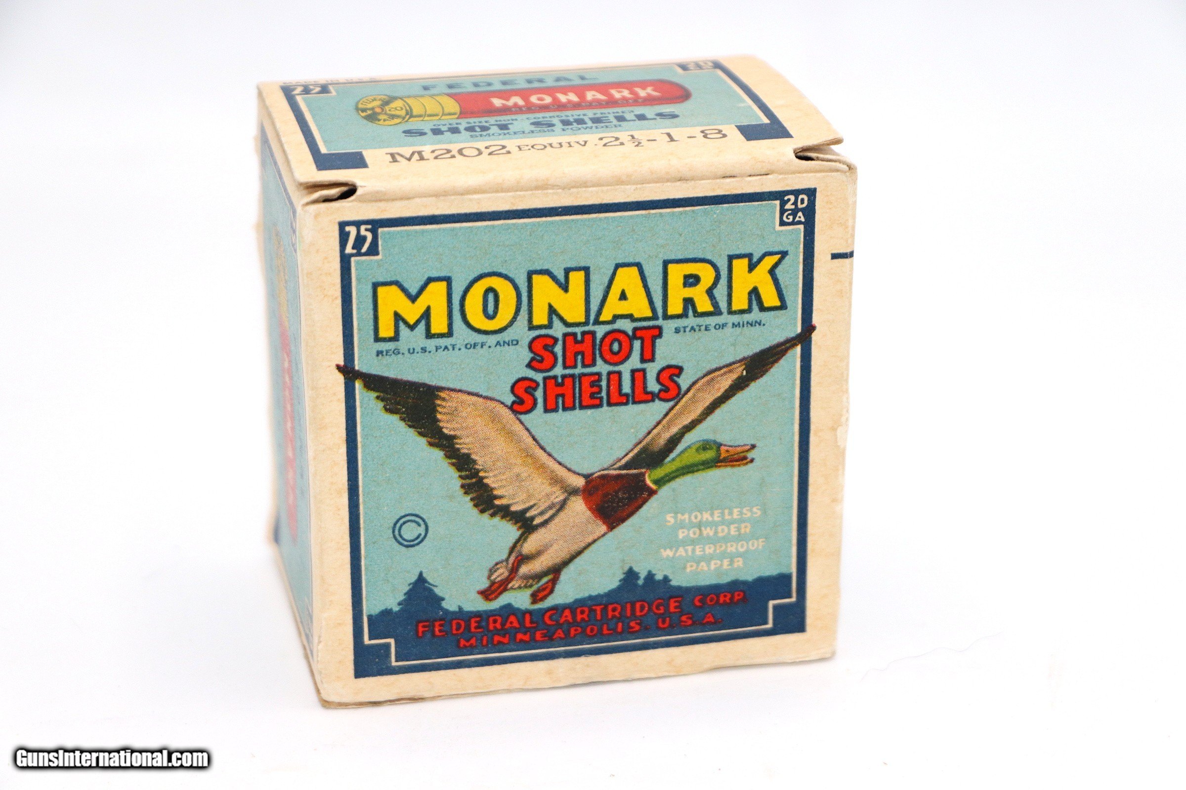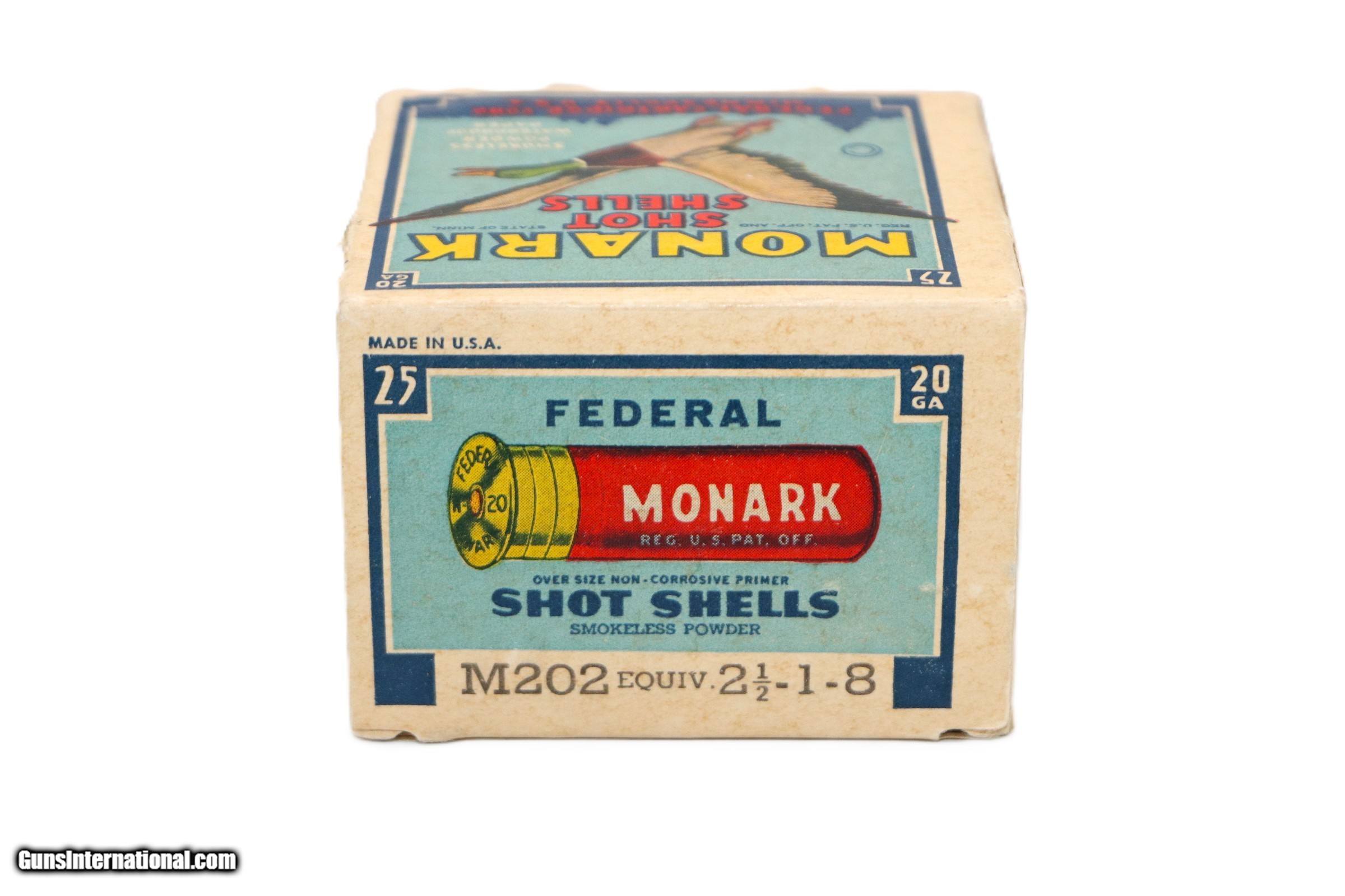 Description: Federal Cart. Co., MONARK, 20ga., 1pc., Full, shot size 8, Blue border, box solid with great color, paper shells are excellent. Shotgun Gauge: 20 Gauge Price: $60.00 Shipping: $13.50 Contact Seller |