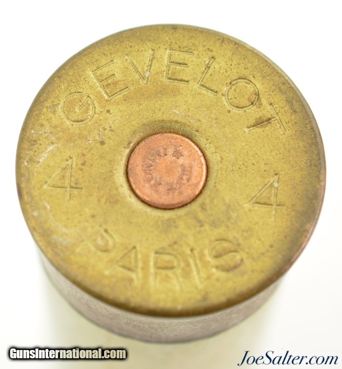 Description: This is an empty, primed 4 Gauge shotgun shell with paper hull and brass base manufactured by Gevelot in Paris. The massive, unused shell measures just shy of 4" in length and is 1.02" in diameter. SOLD |