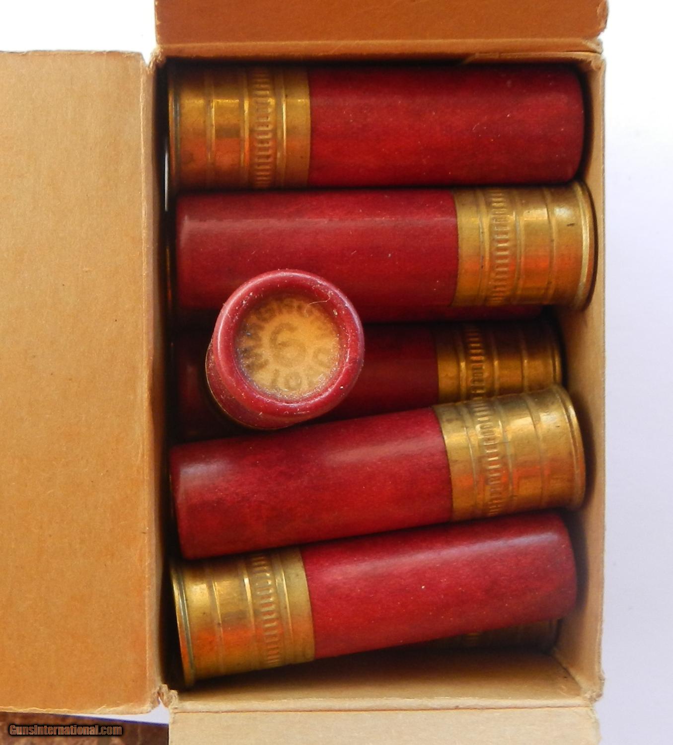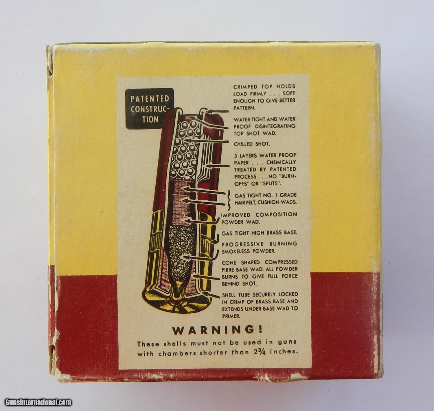 Description: Here is a somewhat different type of one piece shotgun shell box. Instead of opening at the top, this one opens on the left side. Hiawatha "ACE" Maxium Load shot shells, sold by Gambles, Gambles-Skogmo, Inc. and Western Auto Supply Co. These were loaded by the Federal Cartridge Corp, 1958 with the old style rolled crimp, 1 1/4 ounce number 6 shot. Both bottom and top locking flaps fully attached. All sides photographed for your review, full and correct, sold as collector ammo only. Price does not include UPS ground shipping. Thanks SOLD |