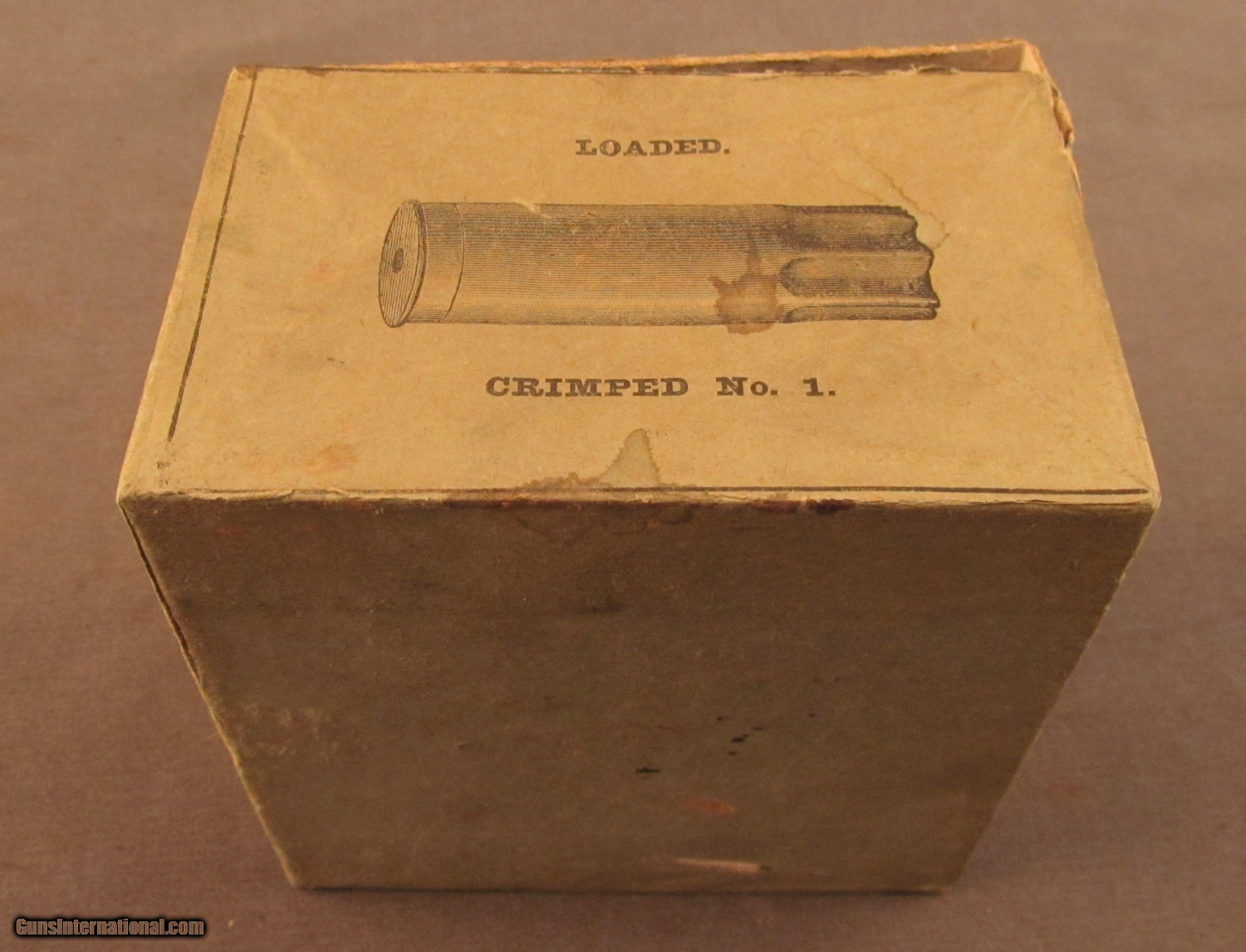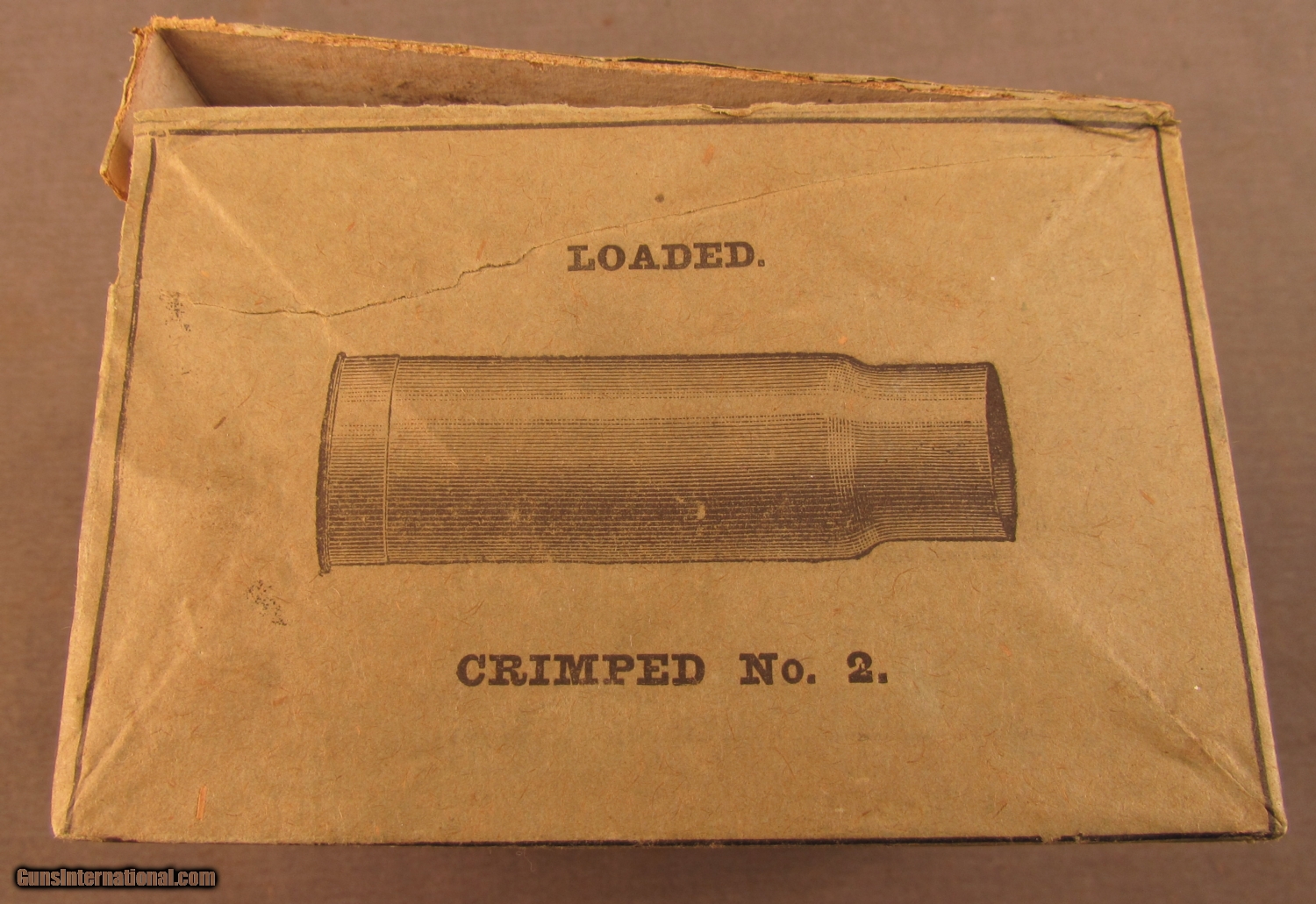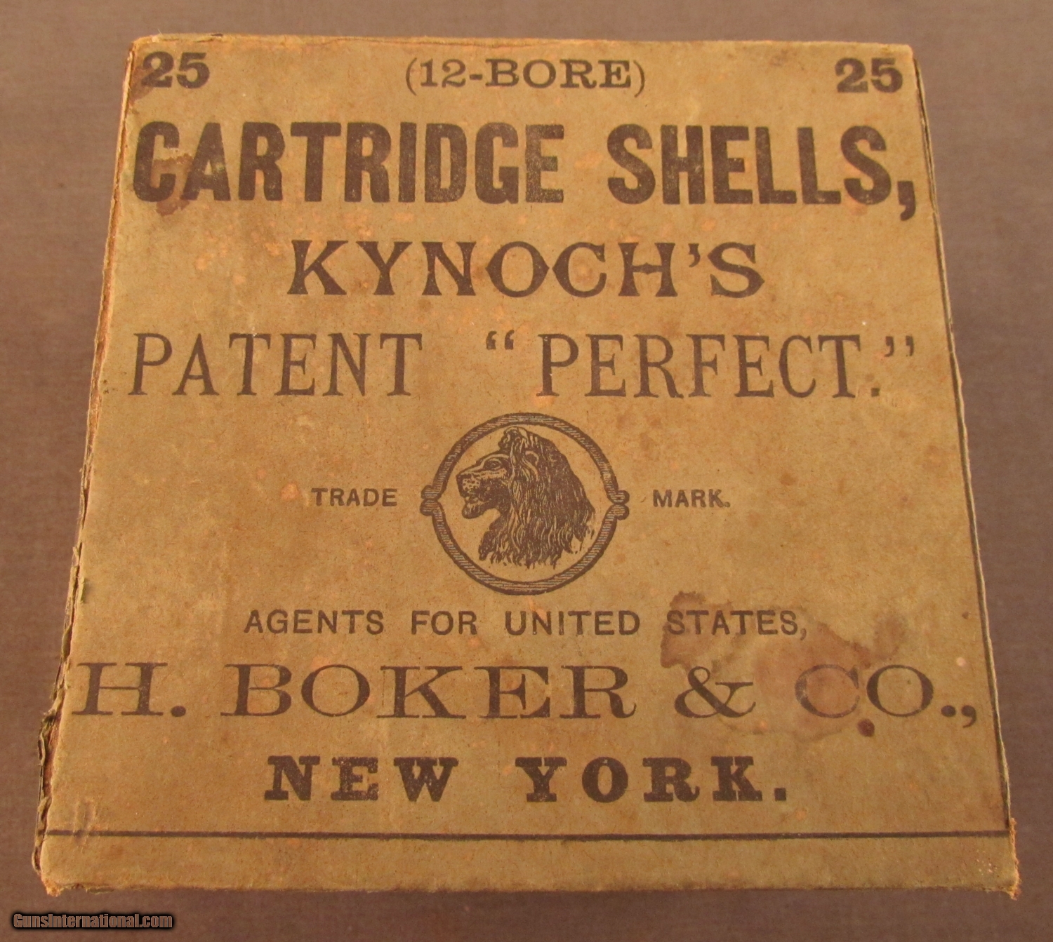 Description: This dark green one piece box has a cloth reinforcement on box shows light soiling and a couple stains on top with Kynoch Lion trademark and H. Boker importers names. Sides of box show large cuts with crimped No 1 and crimped No 2 shells. Nox contains eleven primed brass two piece shells with "Kynoch's Patent No 12" headstmap. H. Boker of New York was part of the famous cutler family known for importing German knives and scissors. SOLD Manufacturer: Kynoch Model: Ammo Caliber Info: 12ga Gauge Info: 12ga |