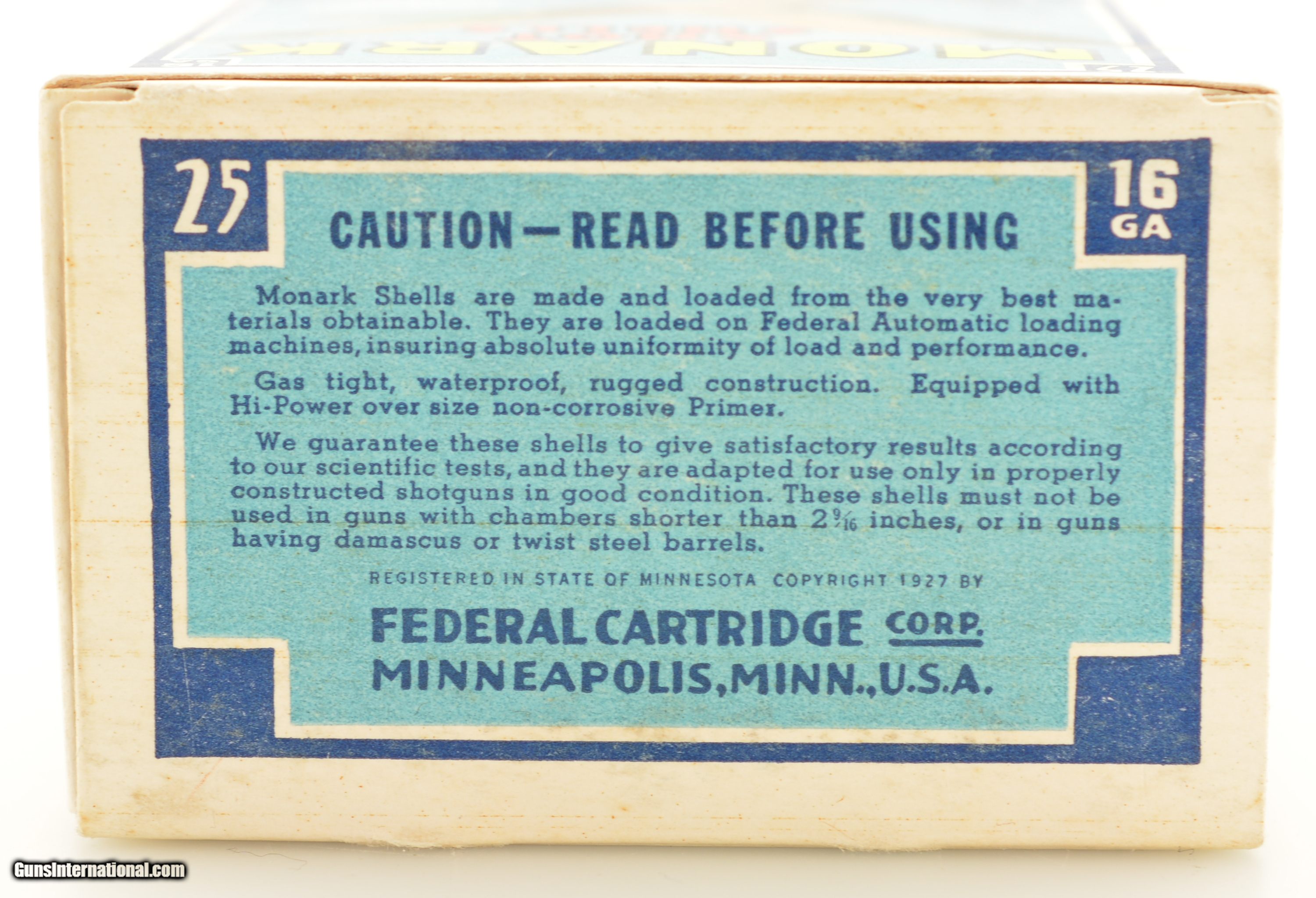 Description: This is a full box of the iconic Mallard box of Federal Monark paper 16 Gage Shotgun shells with 2 1/2" #8 shells. The colorful box features a flying drake Mallard and is in excellent condition with excellent graphics, crisp edges and corners with slight rub wear and a small 1/8 inch start of separation on the top tab with excellent, as new shot shells. A great looking box that will display well. SOLD Manufacturer: Federal Model: Ammo Caliber Info: 16ga Gauge Info: 16ga |