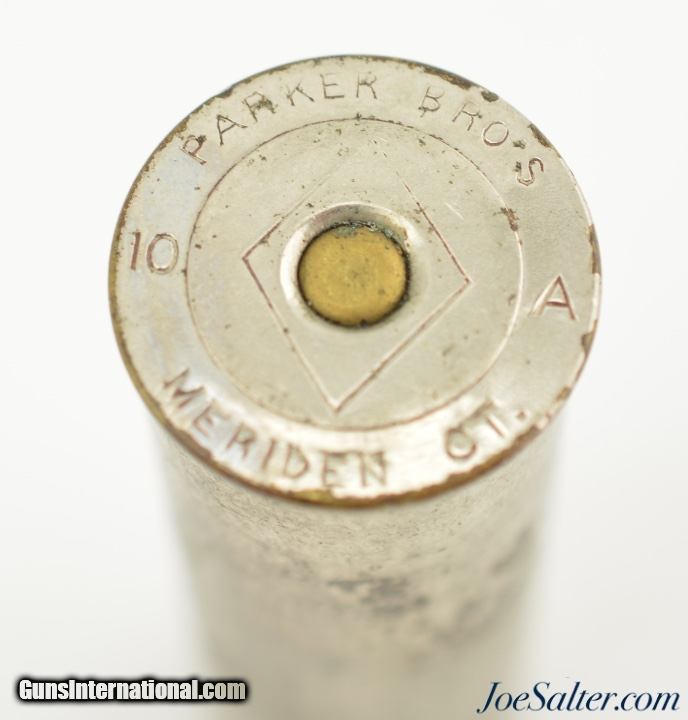 Description: This is an original, primed nickel plated brass 10 Gauge shotgun shell which measures 2 7/8". It is marked "PARKER BRO'S / 10 A / MERIDEN CT" on the head. It remains in near excellent condition with some light flaking on the sides. A great original shell to pair with your Antique Parker. SOLD |