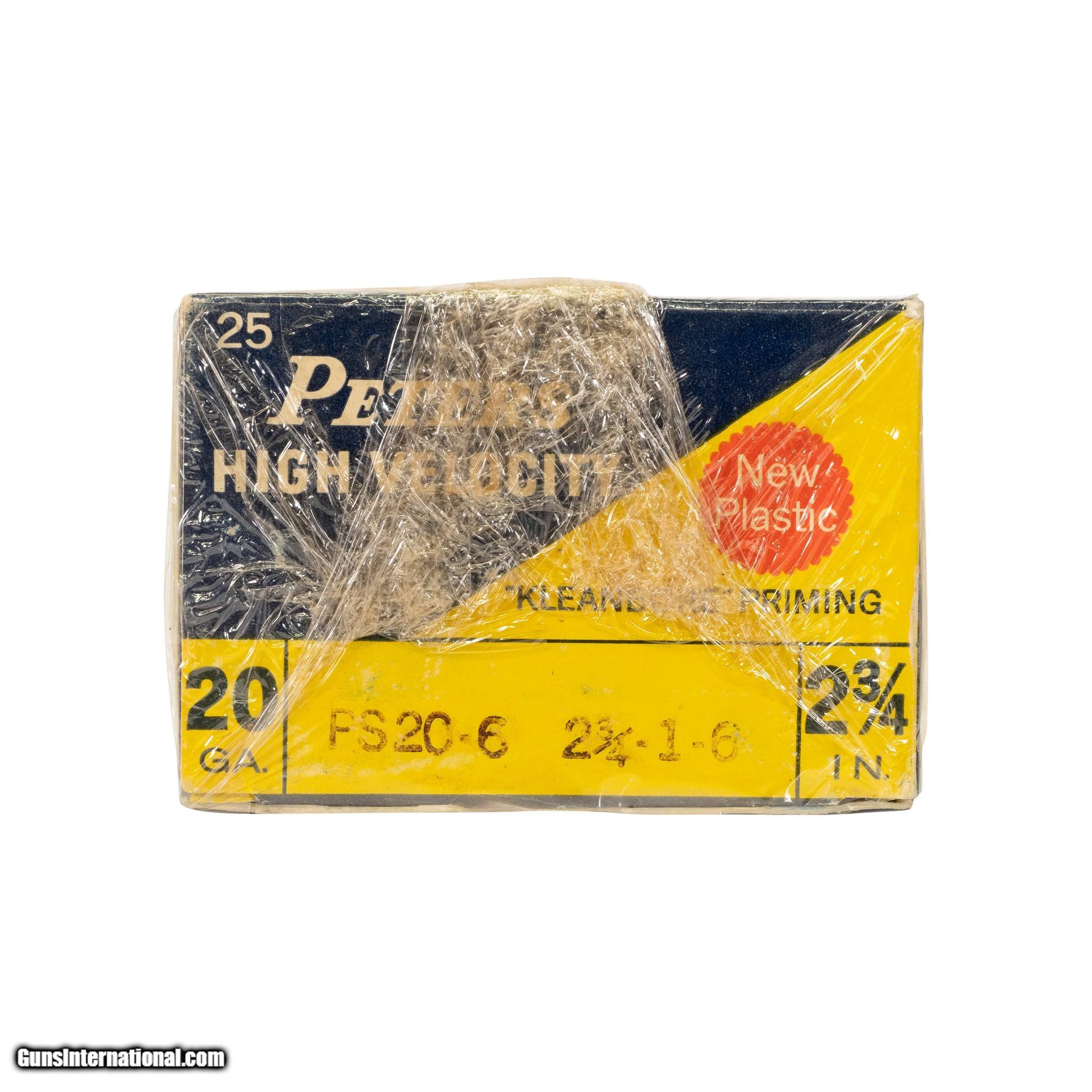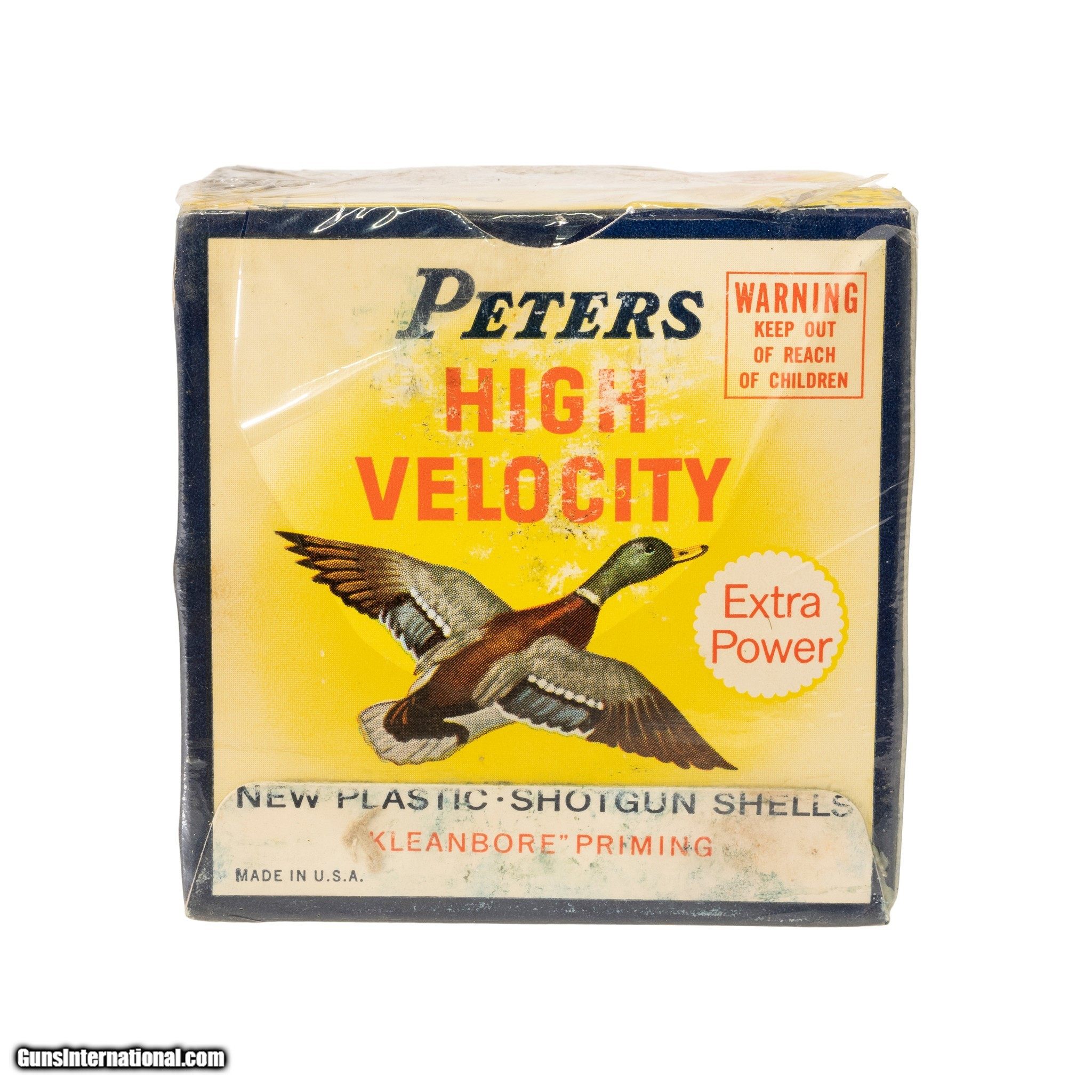 Description: Peter's high velocity extra power new plastic shotgun shells. Kleanbore priming. 20 Gauge. Full box. 3 1/2" x 3 1/2" x 2 1/2". SOLD |