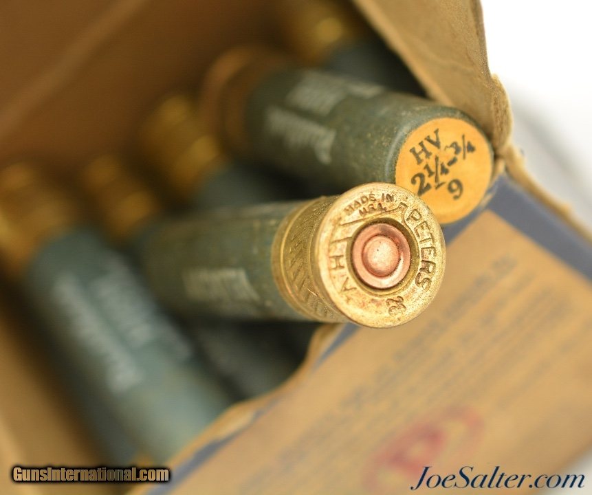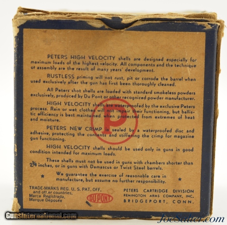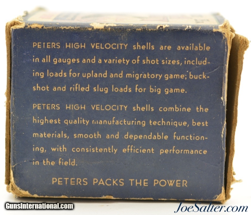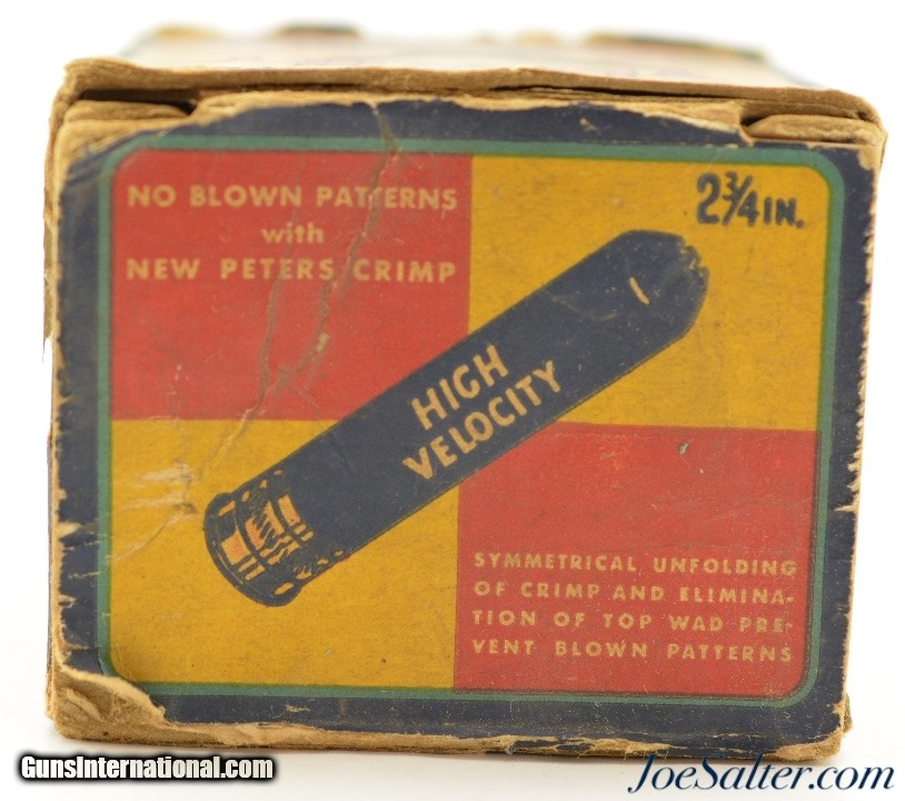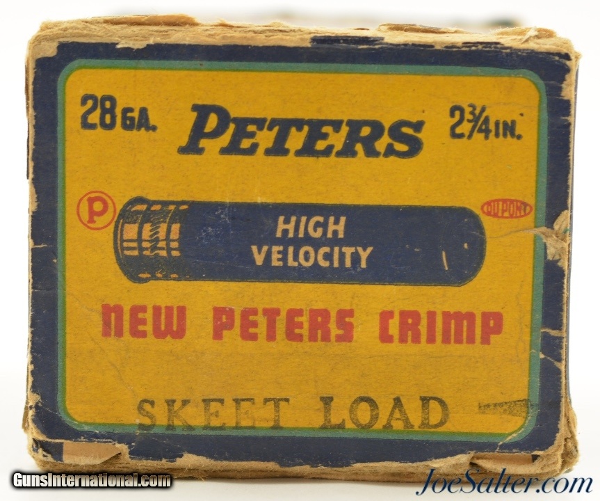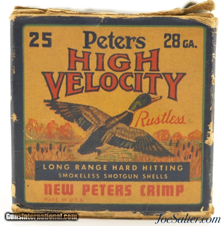Description: Peters High Velocity 28 ga Duck box in 3/4oz no 9 shot Skeet load Box of 21. Nice box of 21 factory shells of old Peters in the classic duck box. Box show wear form age and being in storage. All shells are in good shape and are individually marked.; SOLD |