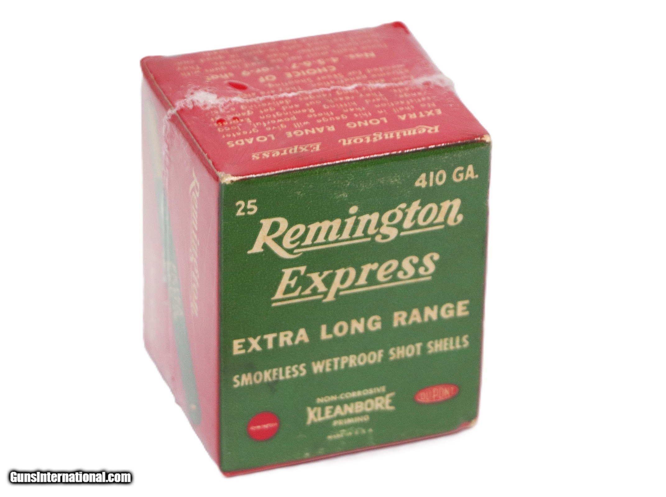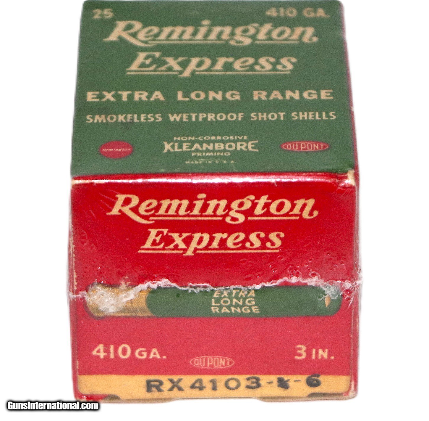 Description: Remington Express, Kleanbore, .410 Gauge, Extra LR, Shot Size 6, 25 Rounds. Box and ammo are mint Shotgun Gauge: .410 Gauge Price: $65.00 Shipping: $13.50 Contact Seller |