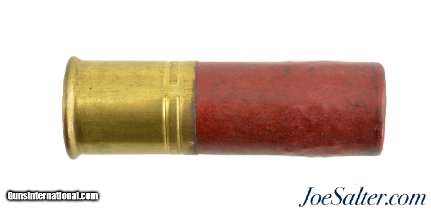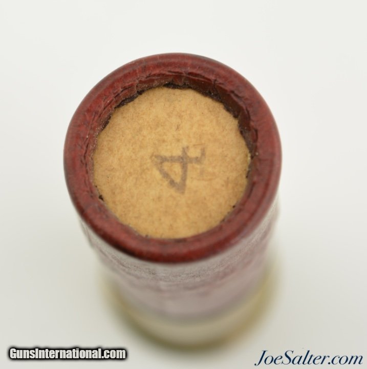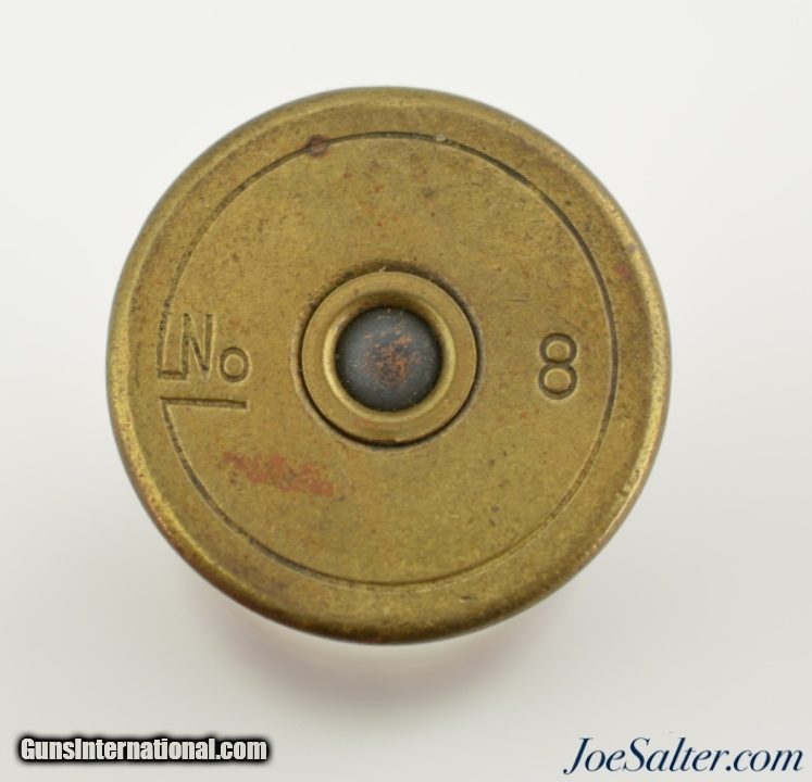 Description: This is a single live round of high brass paper hull, factory loaded 8 gauge shotgun ammunition, #4 shot. The manufacturer is Kirkwood and the headstamp has "No. 8" marking with a line circle. In near excellent condition a nice example of these massive shotgun cartridges great for display. SOLD |