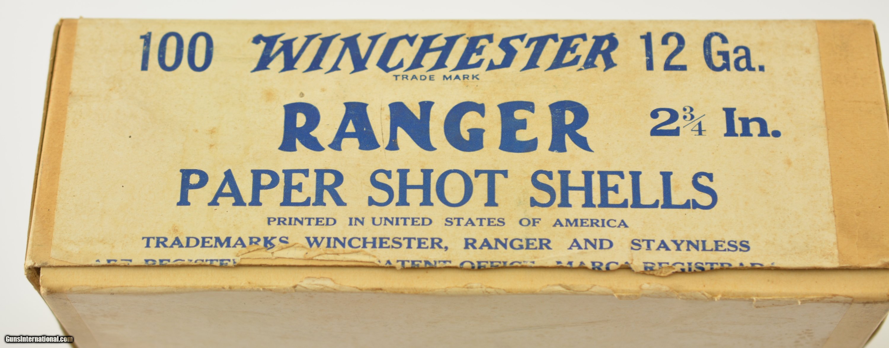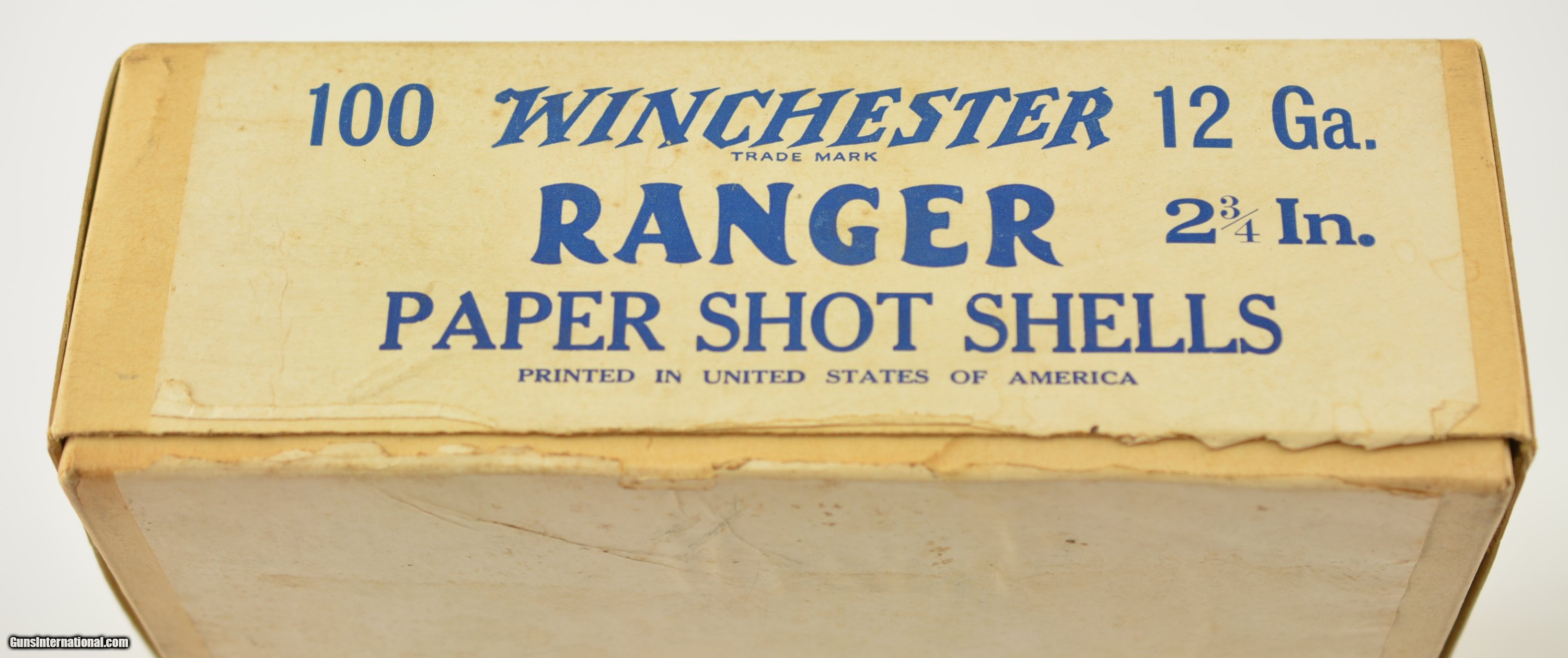 Description: This is a scarce, full box (100 count) of 12 Gage, 2 ¾ inch, Winchester Ranger Paper Shot Shells. The two piece, blue and white labeled box is in excellent condition with some light soiling and is filled with 100 primed original paper hulls that all appear native to the box with scattered light oxidation. The box is in sound condition with strong edges and only light staining on the left side. A great looking display piece. SOLD Manufacturer: Winchester Model: Ammo Caliber Info: 12ga Gauge Info: 12ga |