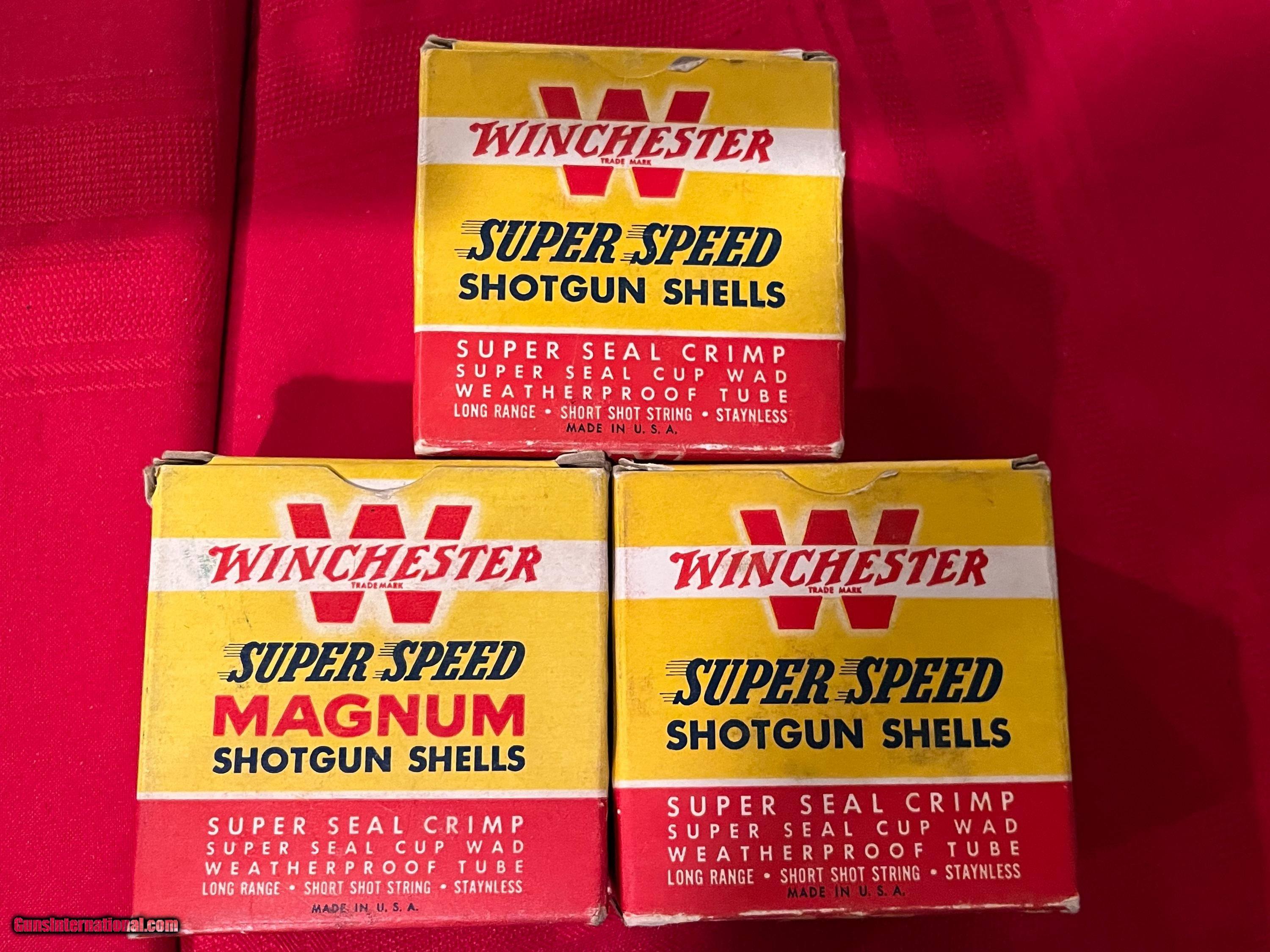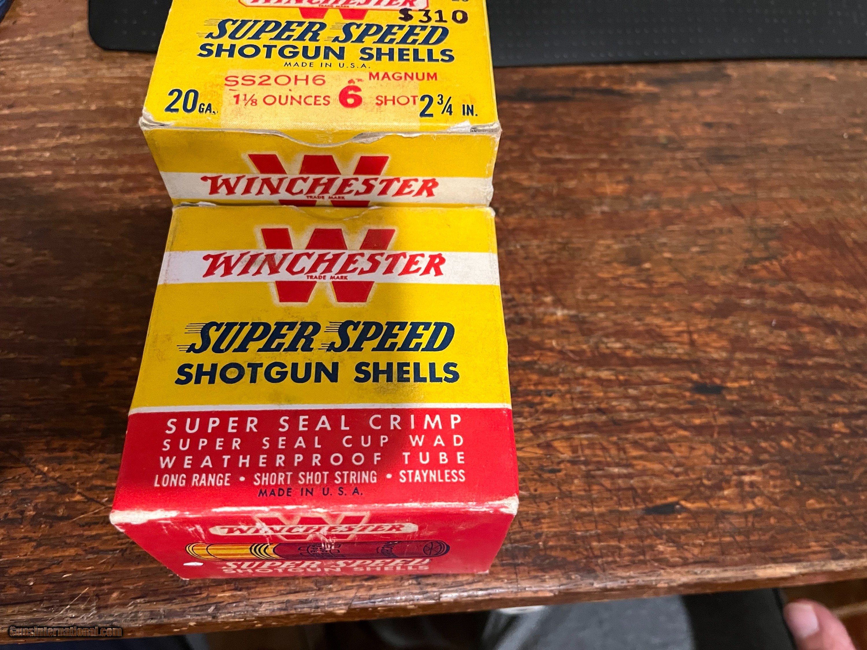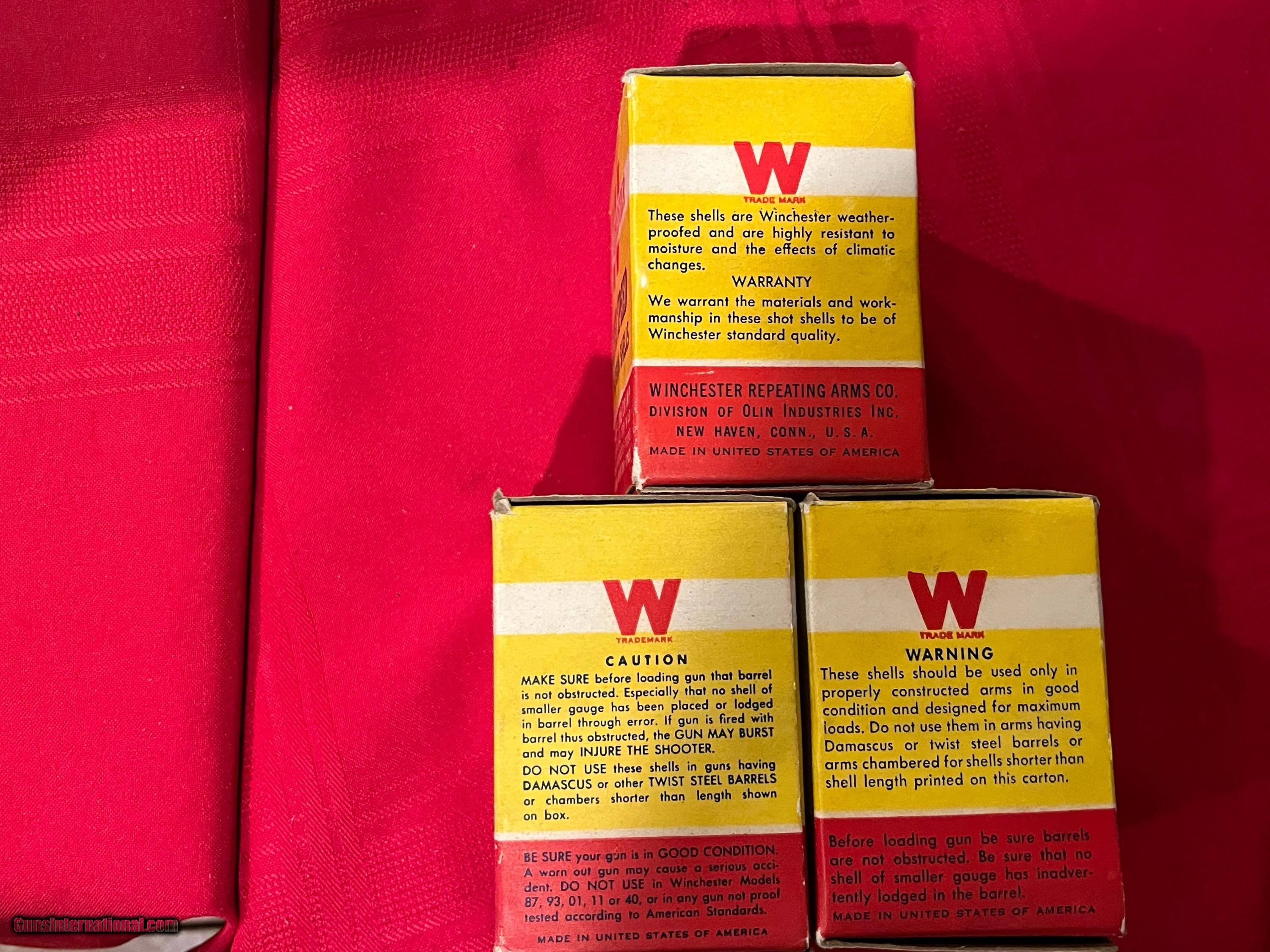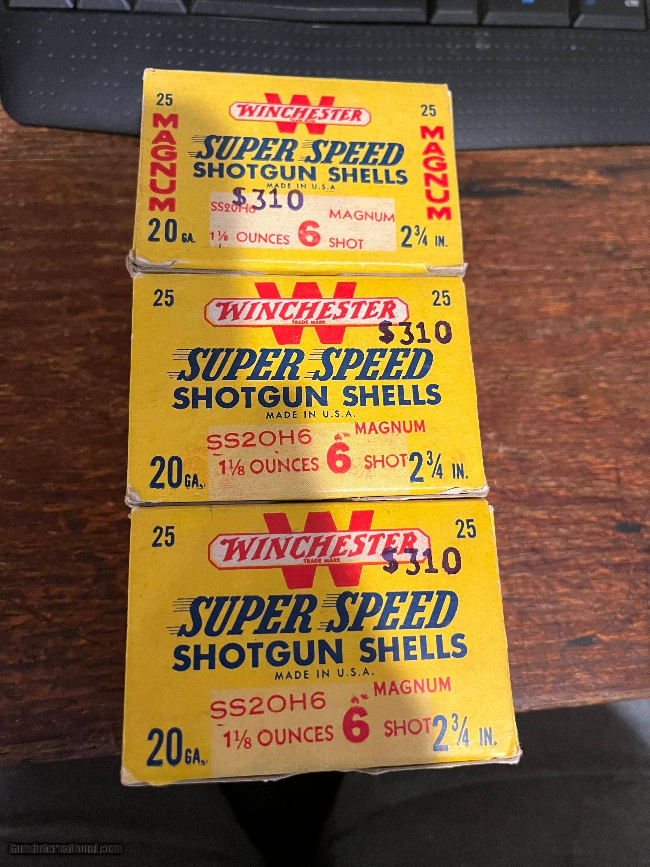 Description: 3 full and correct boxes of 20 gauge 2 3/4" Magnum paper shot shells. 20 gauge 1 1/8 oz. 6 shot. Nice boxes, nicer ammo. $40 per box. 1 box 7 1/2 shot 1 missing. $35 1 box 6 shot 23 rds $25 BUY ALL--FREE SHIPPING SOLD Shotgun Gauge: 20 Gauge |