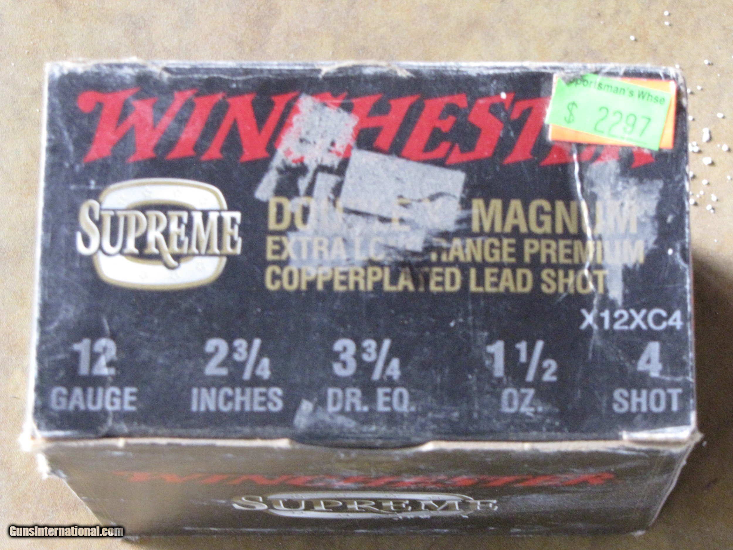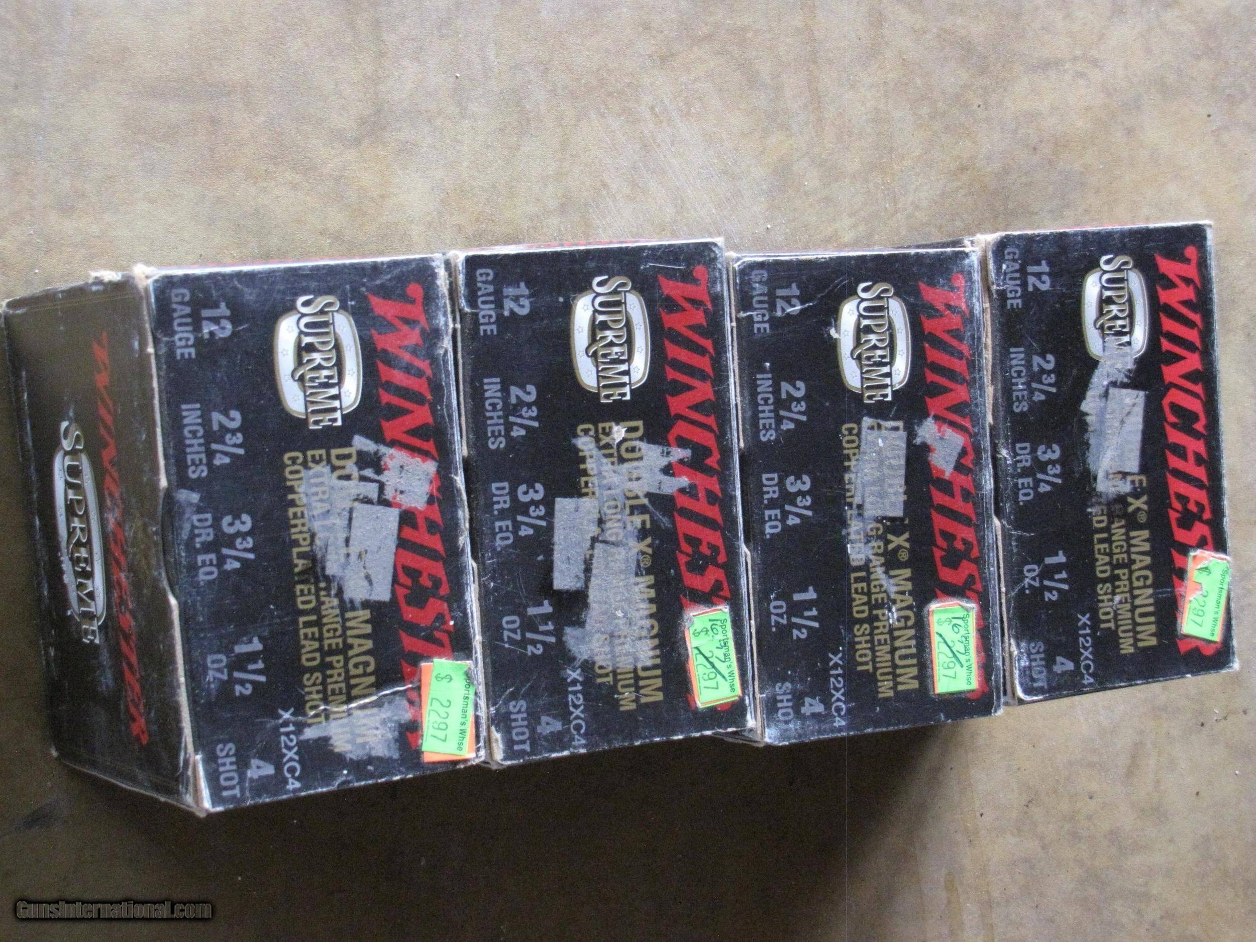 Description: Winchester 12 gauge supreme shotshells 2 3/4 inch 1 1/2 ounce copper plated #4. Four boxes of 25 shells each. SOLD Shotgun Gauge: 12 Gauge |