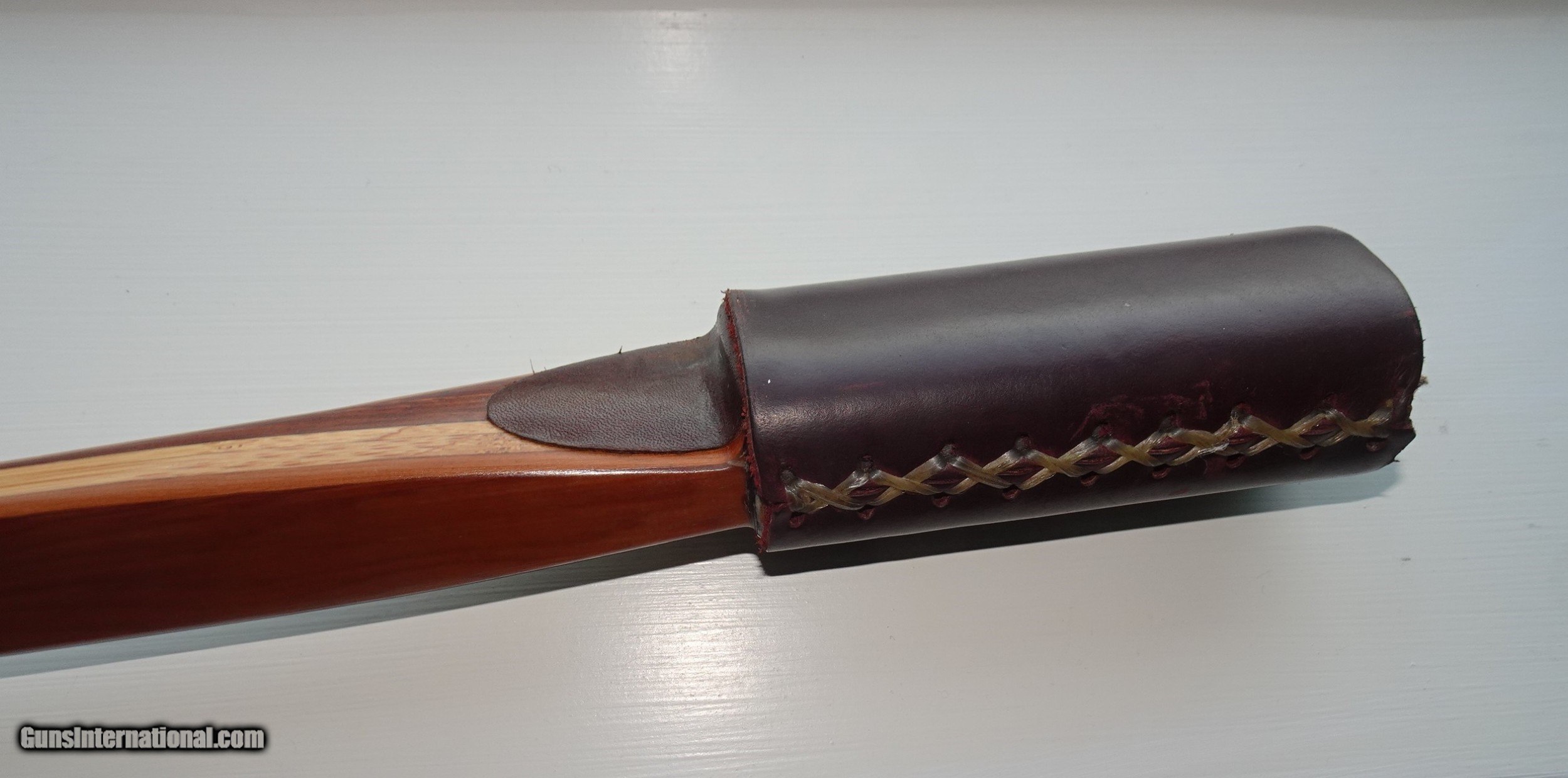 Description: Howard Hill "Half-Breed" take-down longbow. 68" - 49# 28" Note the bow draw wt is not marked on limbs. Determined by checking with HH and using a bow wt. scale. Bow was built December 2011. Presents in near new condition. Comes with genuine Cape Buffalo take-down case, string, and stringer. Price includes includes USPS Priority Mail shipping. Bow is right-hand. Construction is bamboo core with yew overlays and clear glass on the limbs. Sold. SOLD |