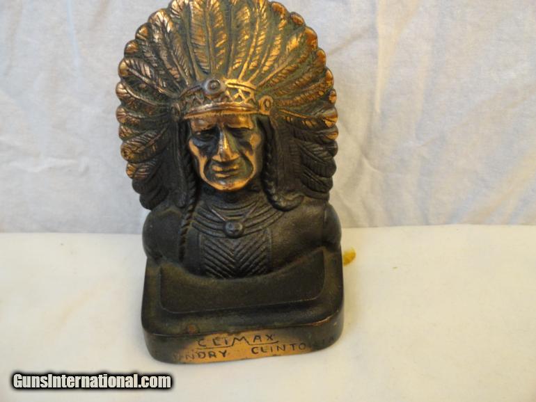 The first 6" bank is cast and missing bottom plug. Second is complete with bottom and a plaque for Prudential Savings in Utah while the last is a heavy solid bronze Indian that is 6" tall and marked Climax Foundry Clinton.