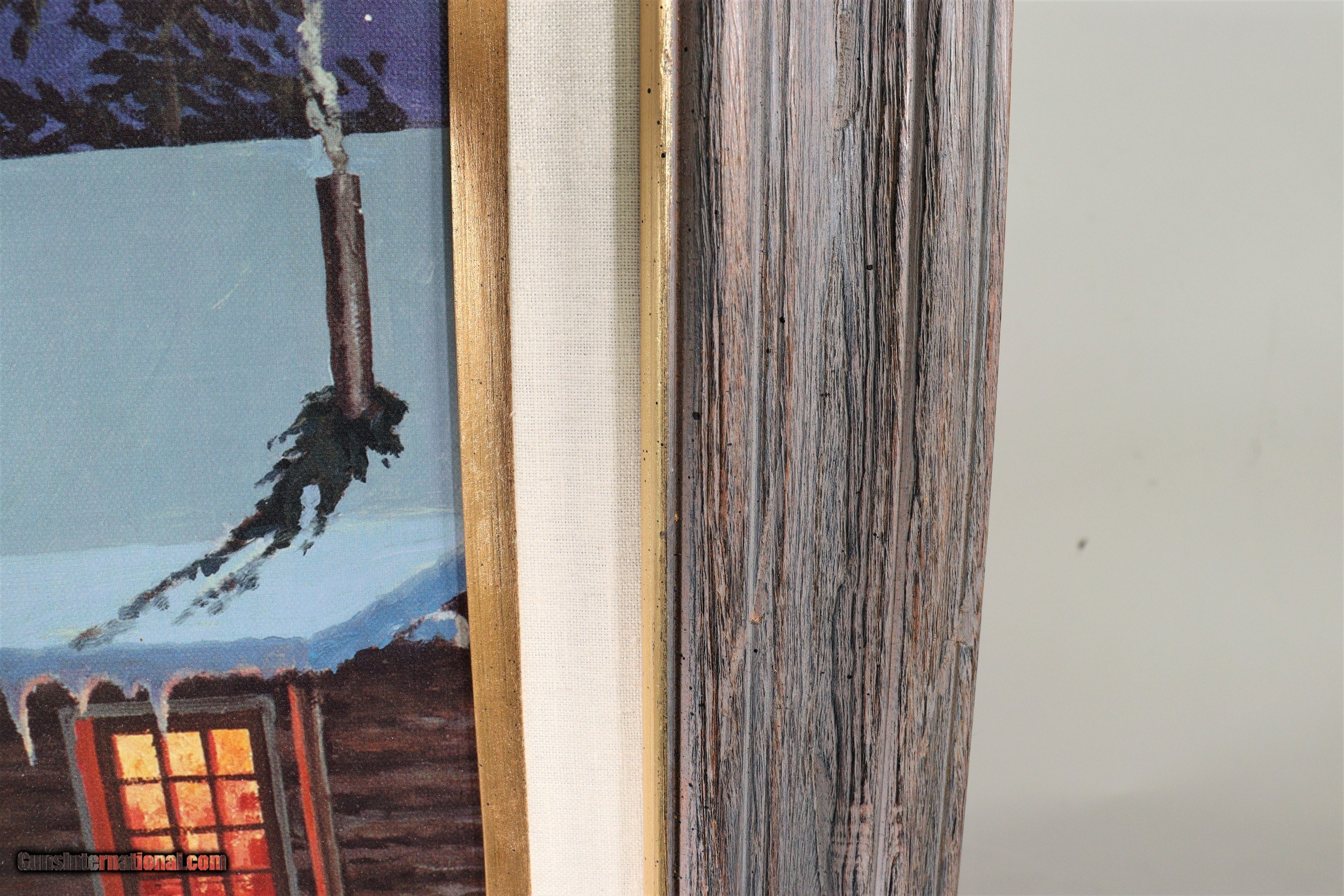 Description: Beautiful limited edition numbered giclee print of "Cabin Scene" by Ron Smith. This piece of Western American cowboy art is framed and matted. The painting features a snowy scene of two horses outside of a cabin that is warmly lit by fire from inside. Frame is a nice grey color that would perfectly accent a modern or traditional home. Size of print: 20" x 16" with frame: 28" x 25" SOLD |