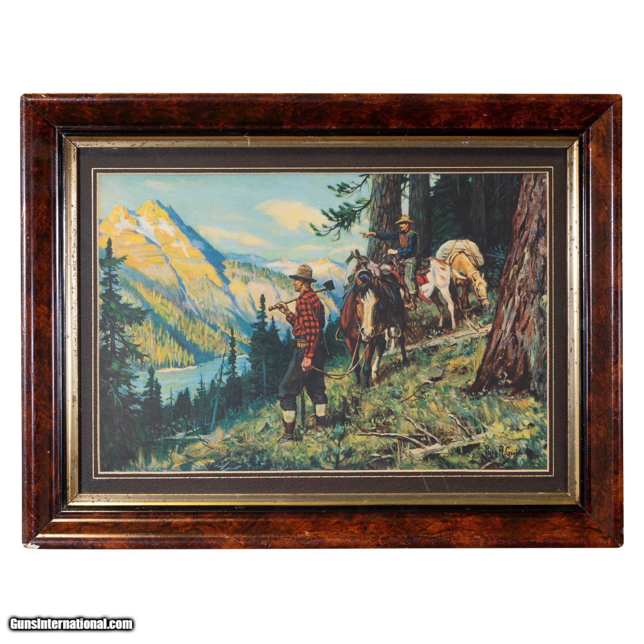 Description: "Blaze the Trail" by Phillip Goodwin Framed Phillip Goodwin calendar print; 15" x 10 1/2". Origin- Minnesota Period- First Quarter 20th Century SOLD |