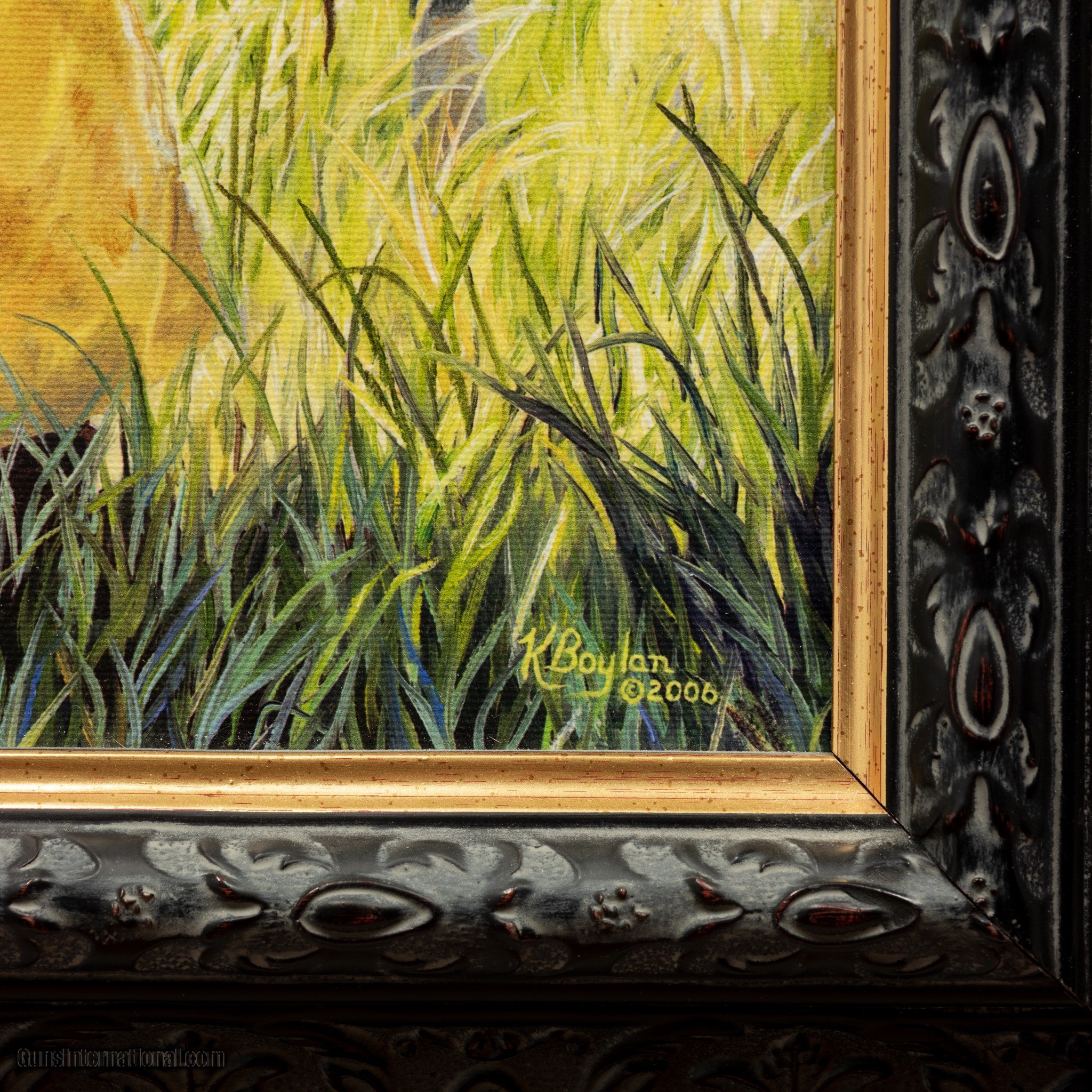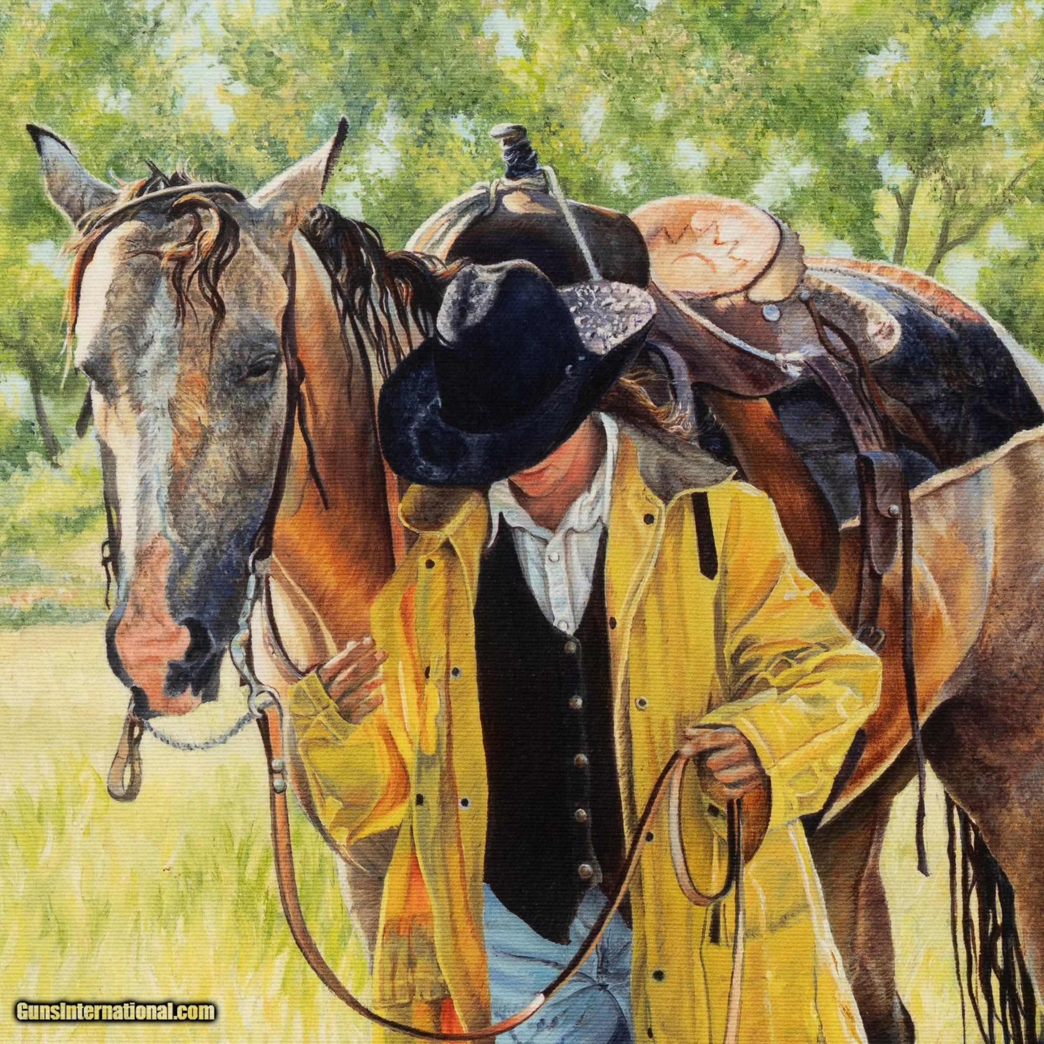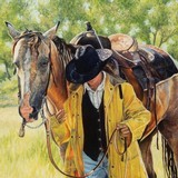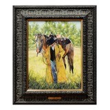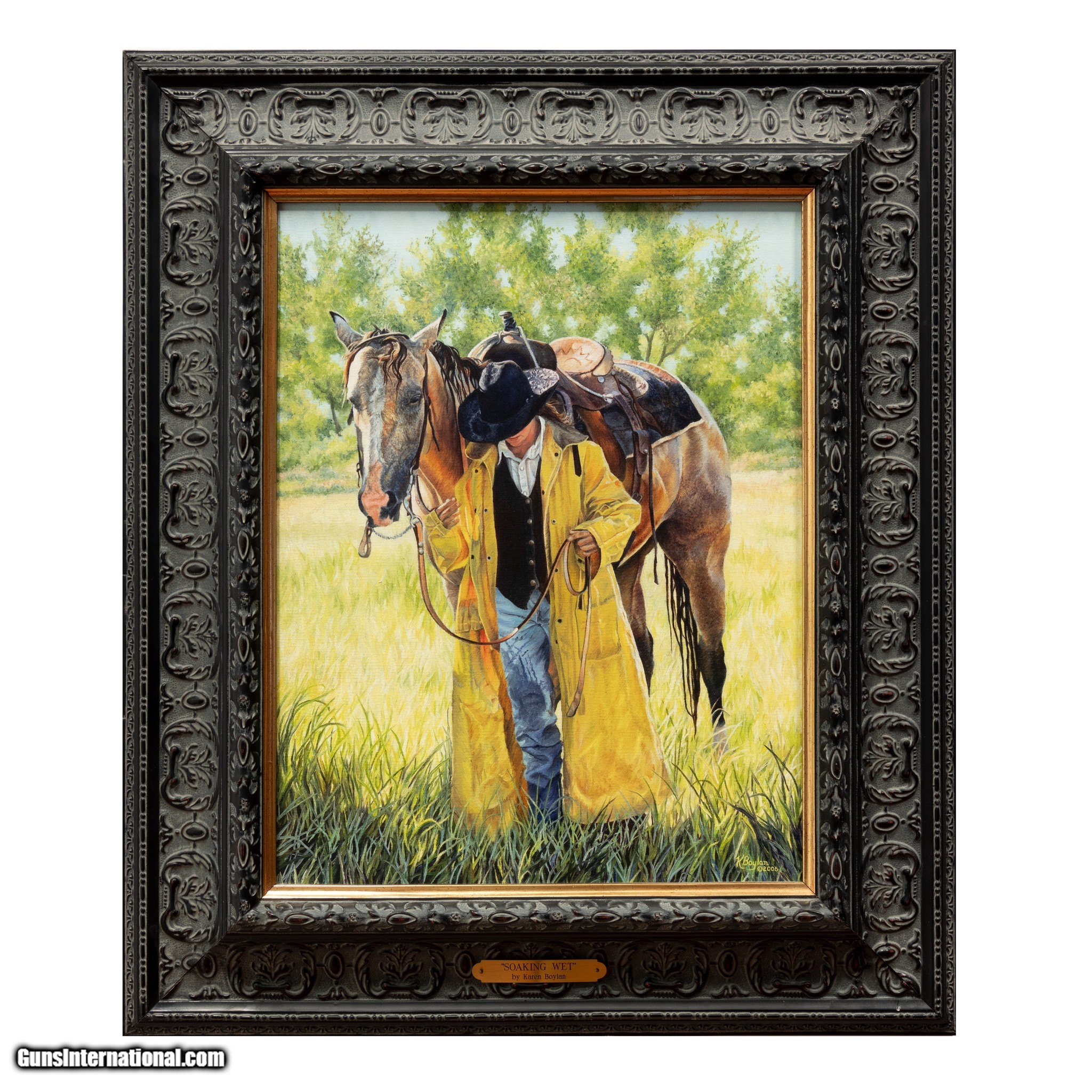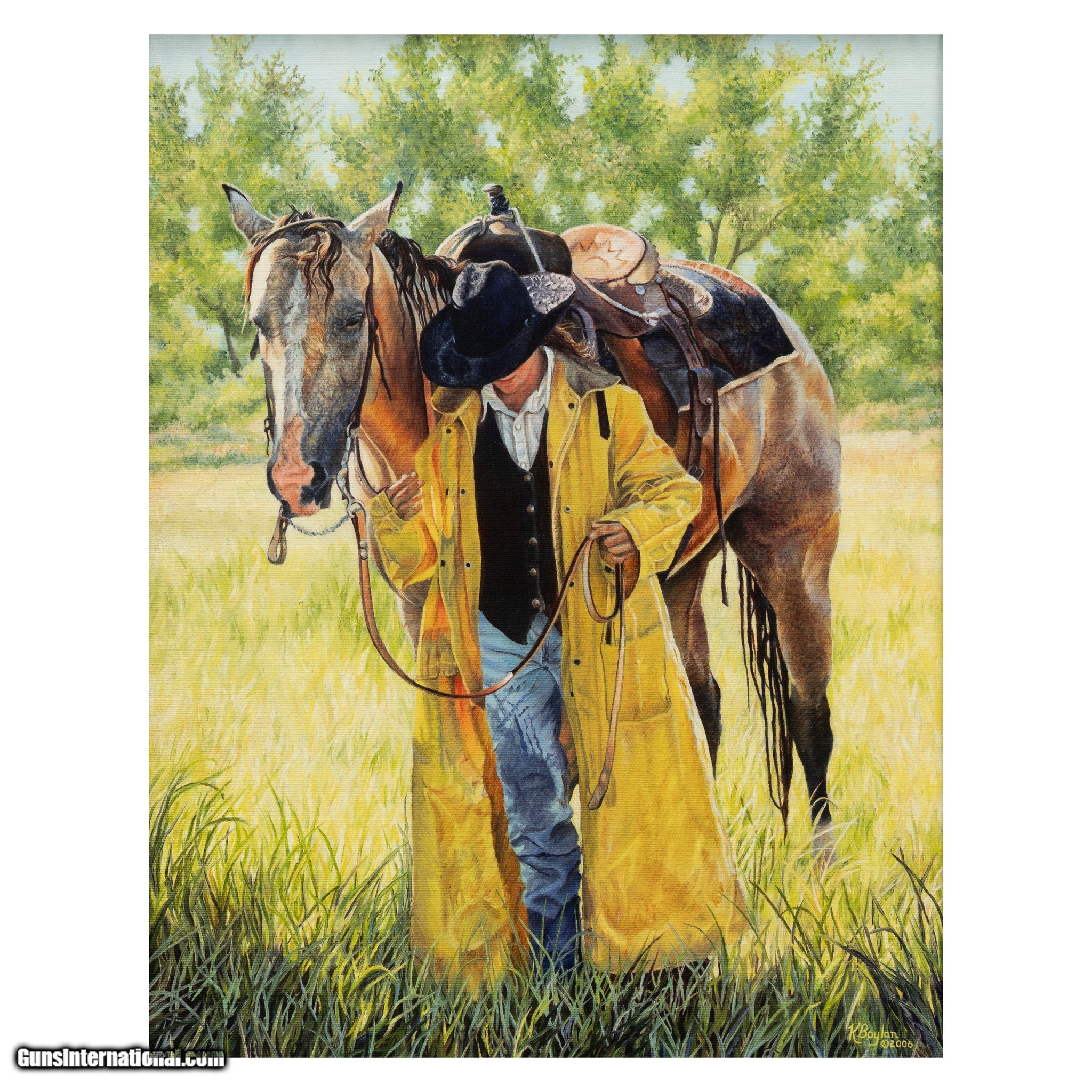 Description: Framed giclee by Montana artist Karen Boylan. This exceptionally well frame dpiece portrays a woman in a yellow slicker, western clothes, and cowboy hate, leading her wet horse through the grass. The sky is now clear and blue, thought it's clear that the horse and rider have been through some rain. Lovely piece that would compliment any collection and would look stunning in a Western, cowboy, or equestrian home. Size: 14" x 18" Frame 22" x 25" Artist bio: Boylan has received numerous awards, her images have been produced on numerous posters and several magazine covers, has had several articles on her work and life published in magazines, and has been included in three coffee table books on Northwest Artists. In 2006, Boylan was featured artist at the the Firearms, Engravers, and Gunsmiths Exhibition held in Reno, Nv., had a one-woman show at the Clymer Museum in Ellensburg, Wa, was honored as Grand marshal of the Ellensburg Rodeo Parade in 2010. Boylan’s painting “Two of a Kind” was the cover image for The Western Horseman Magazine in the 2018 April Issue and “Let ‘er Buck” is the poster image for the Ellensburg, Wa. rodeo in 2019 over Labor Day weekend. Family Owned & Operated Cisco’s Gallery deals in the rare, exceptional, and one-of-a-kind pieces that define the history of America and the Old West. Our pieces range from American Indian to Cowboy Western and include original items of everyday life, commerce, art, and warfare that tamed America’s frontier. We have been selling on eBay since 2008 with over 2,000 positive reviews. Our 14,000 square foot gallery is located in beautiful Coeur d’Alene, Idaho. Personal Service Cisco’s operates on old fashioned values – honesty and integrity, and all of our items are backed by our money back guarantee. We appreciate the opportunity to earn your business. Whether you desire assistance with a jewelry purchase, choosing a gift, identification, or even selling – we hope to be your trusted source. SOLD |