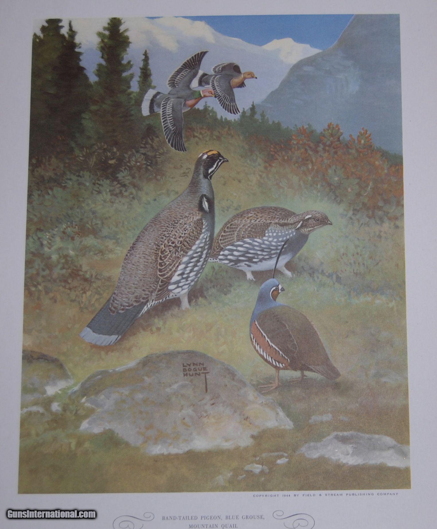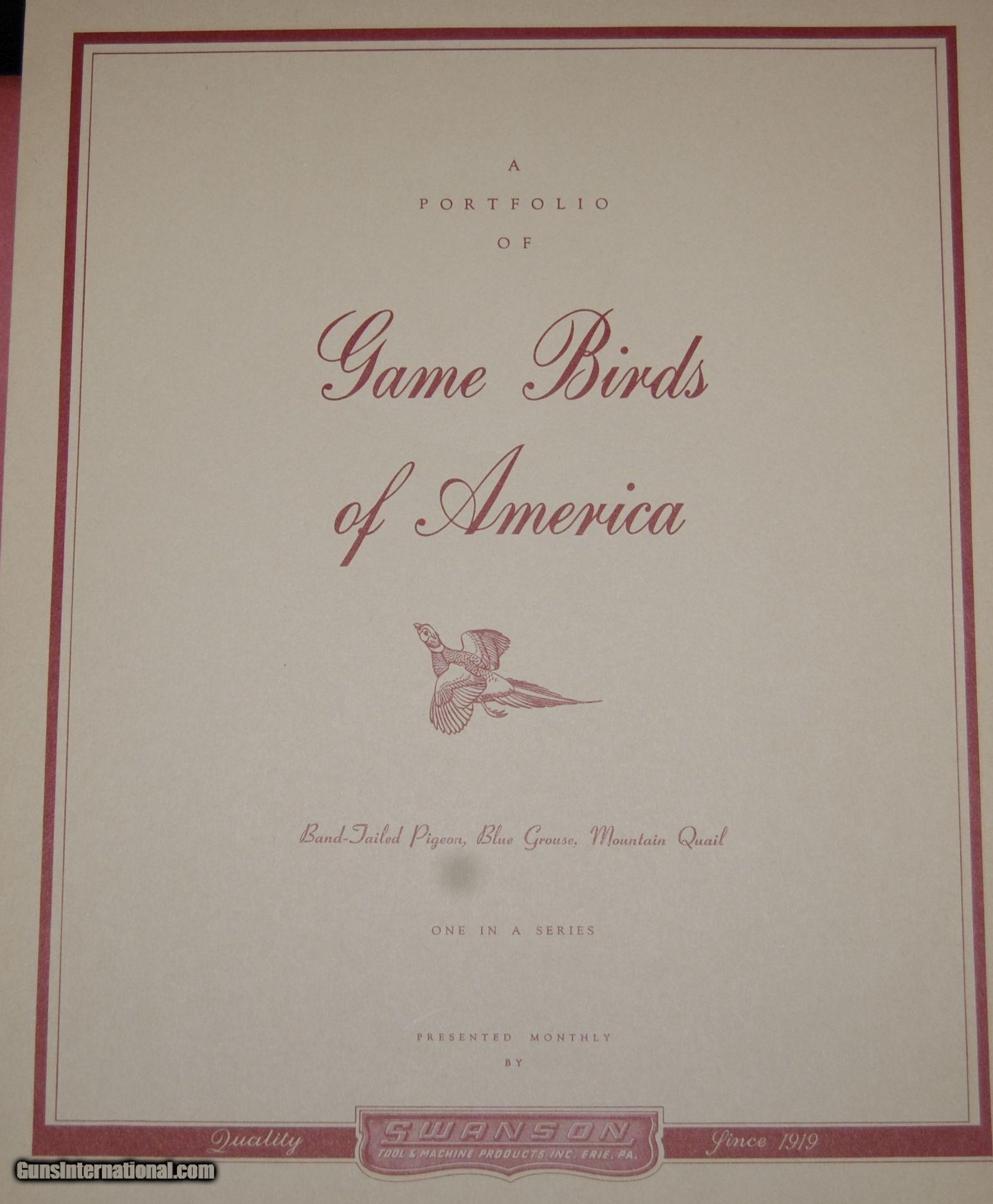 Description: A part of the "Game Birds of America" series published by Swanson Tool and Machine of Erie,Pa.in the mid 1940s.This print features Mountain Quail,Blue Grouse,and Band Tailed Pigeons.It comes in the origina folder with vellum cover.Like new and ready to frame.A classic addition to den,gun room,or huntiing cabin or a great Christmans gift. SOLD |