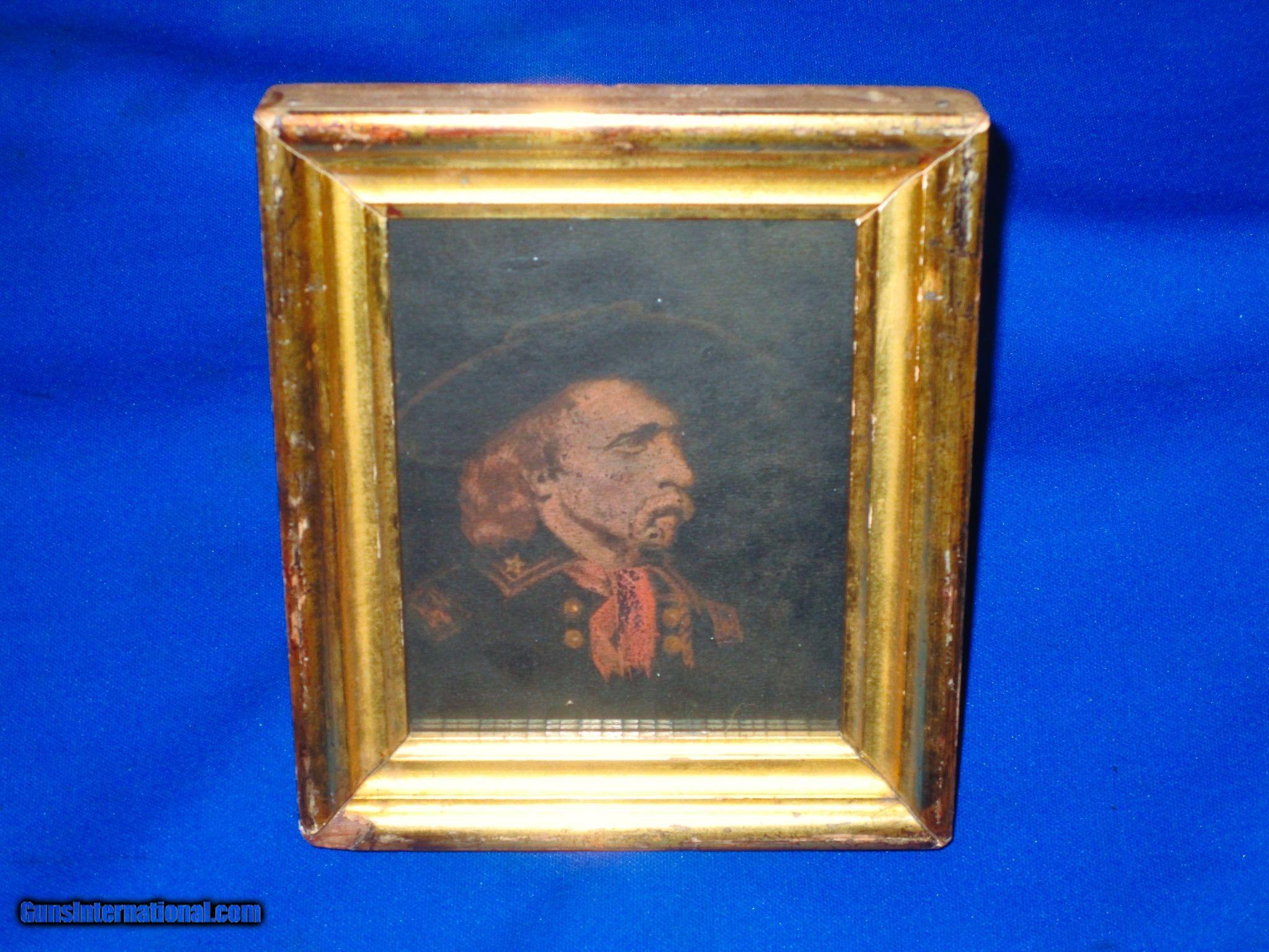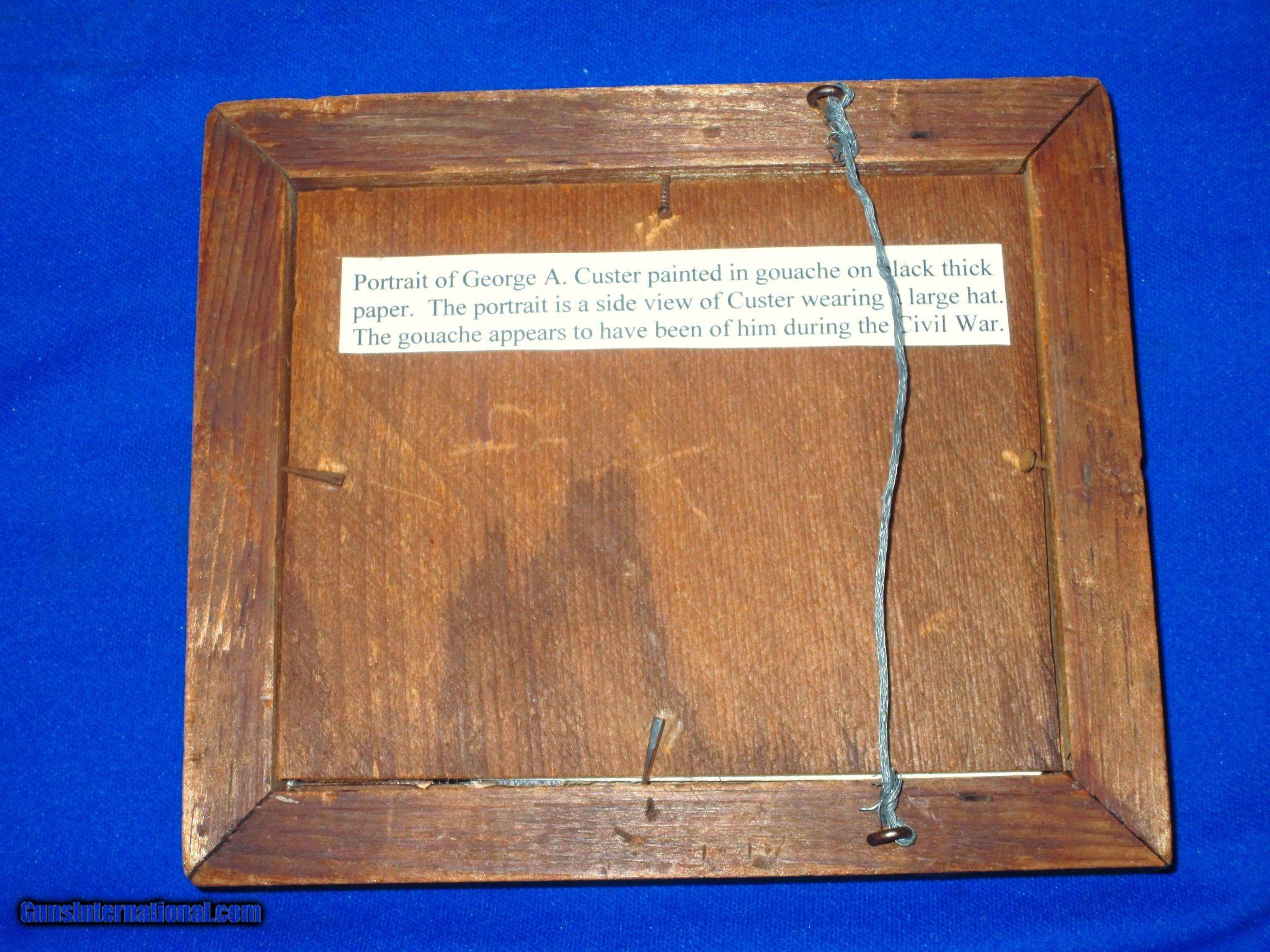 Description: An Early And Rare Original Civil War Period Painting Of George A. Custer As A General In Fine Untouched Condition. All Original and complete. The period painting has him dressed in his Generals Uniform and Large Slouch Hat. This early painting is painted in an early gouache on thick black paper style. The painting itself measures 5 5/8 inches by 4 3/4 inches. The original period frame measures 7 inches by 6 inches. This Is A Very Rare Period Painting Of General George A. Custer During The Civil War. Very Few Of These Exist. It Would Be A Wonderful Addition To Any Collection! SOLD |