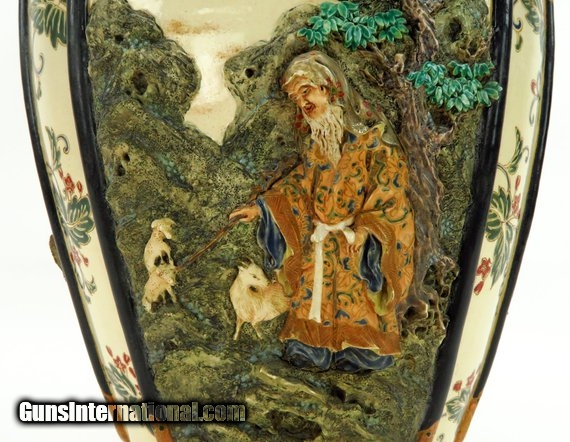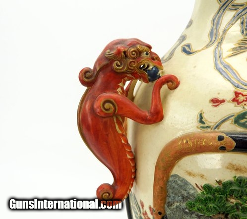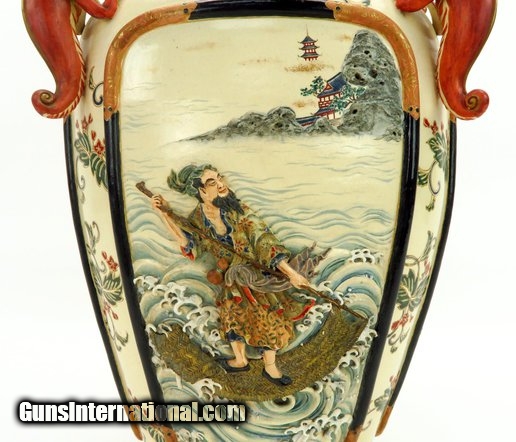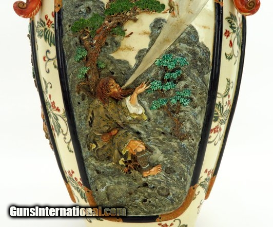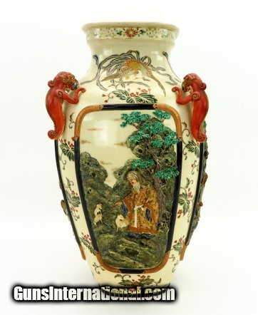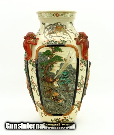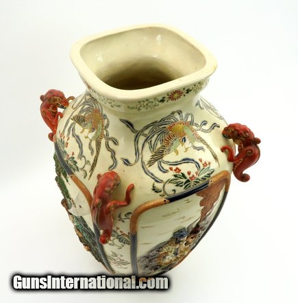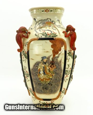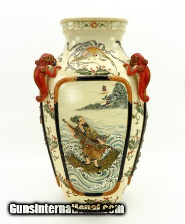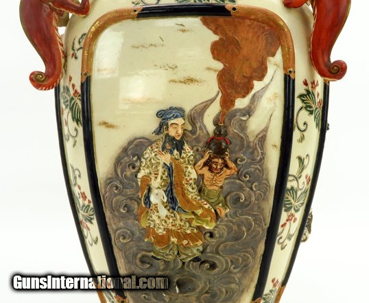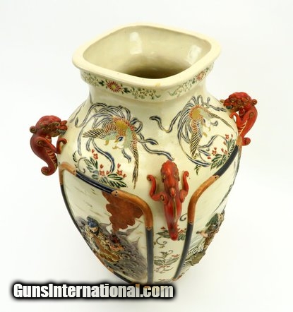Description: Beautiful Earthenware Satsuma Vase with depictions of mythological scenes in high relief & masterfully crafted. Four red dragons act as handles. 20"" tall. SOLD |
