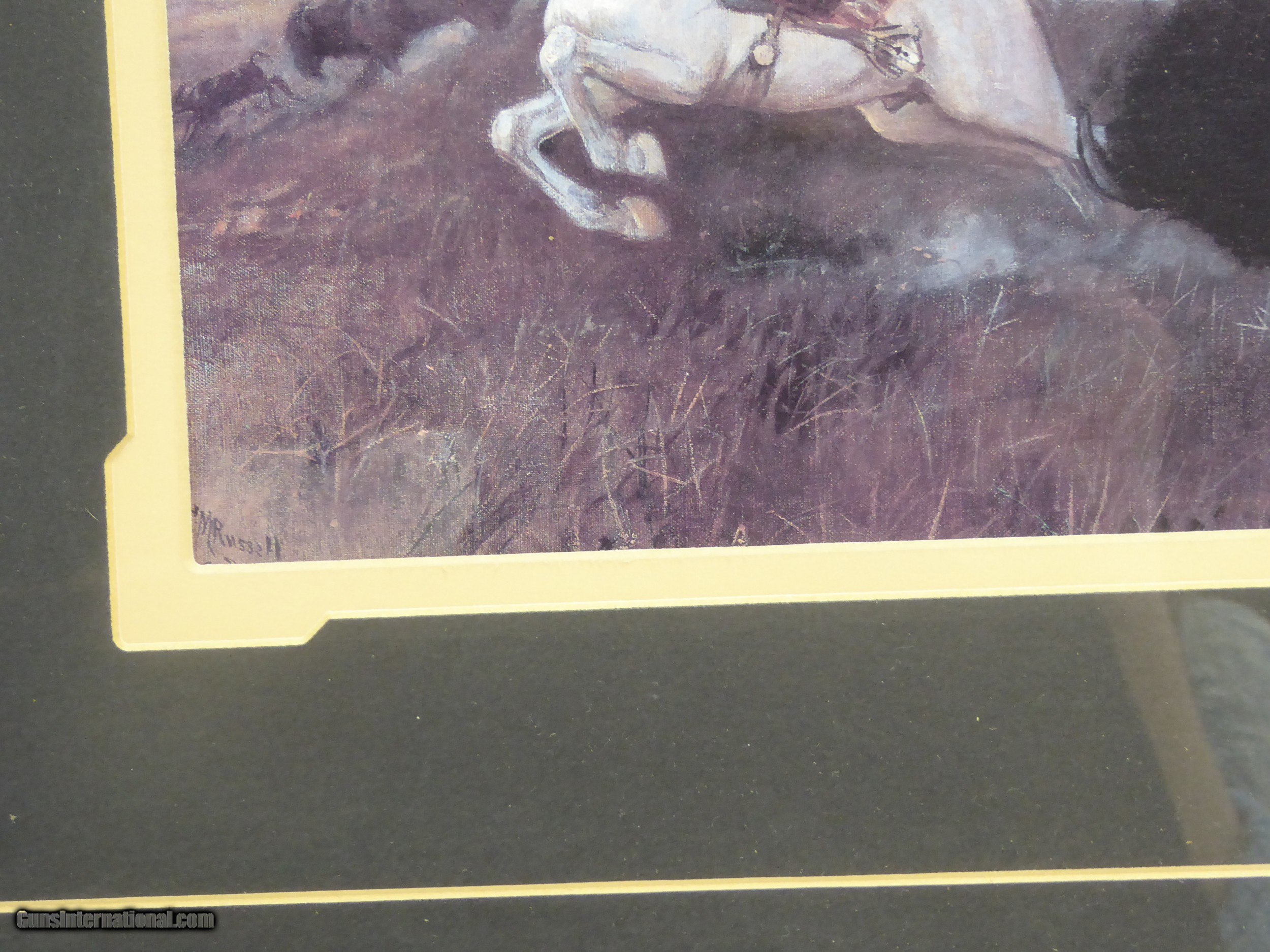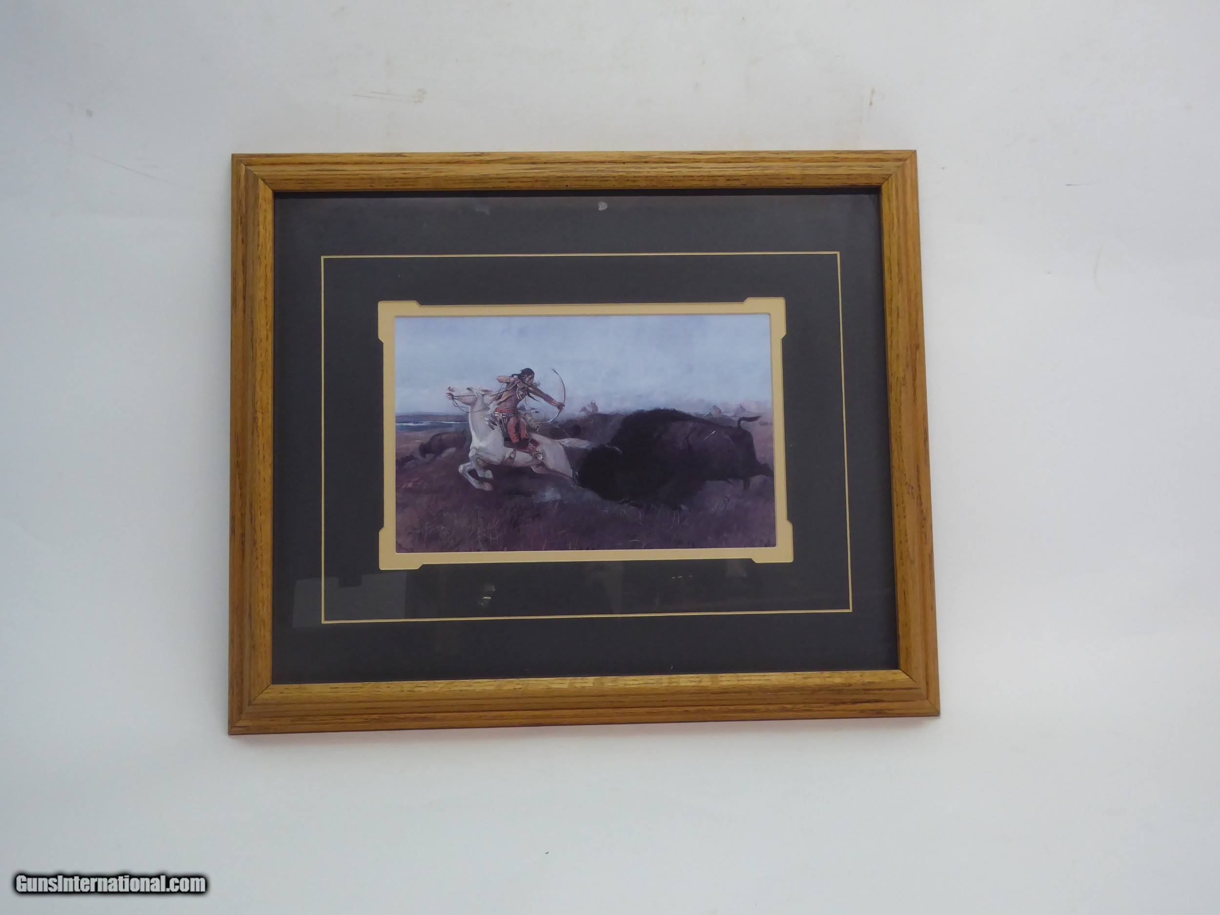 Description: Bison Hunt print by C.M. Russell. Well Frames and Matted. 12" x 7 1/2", Frame 22 1/2" 18 1/2". SOLD |