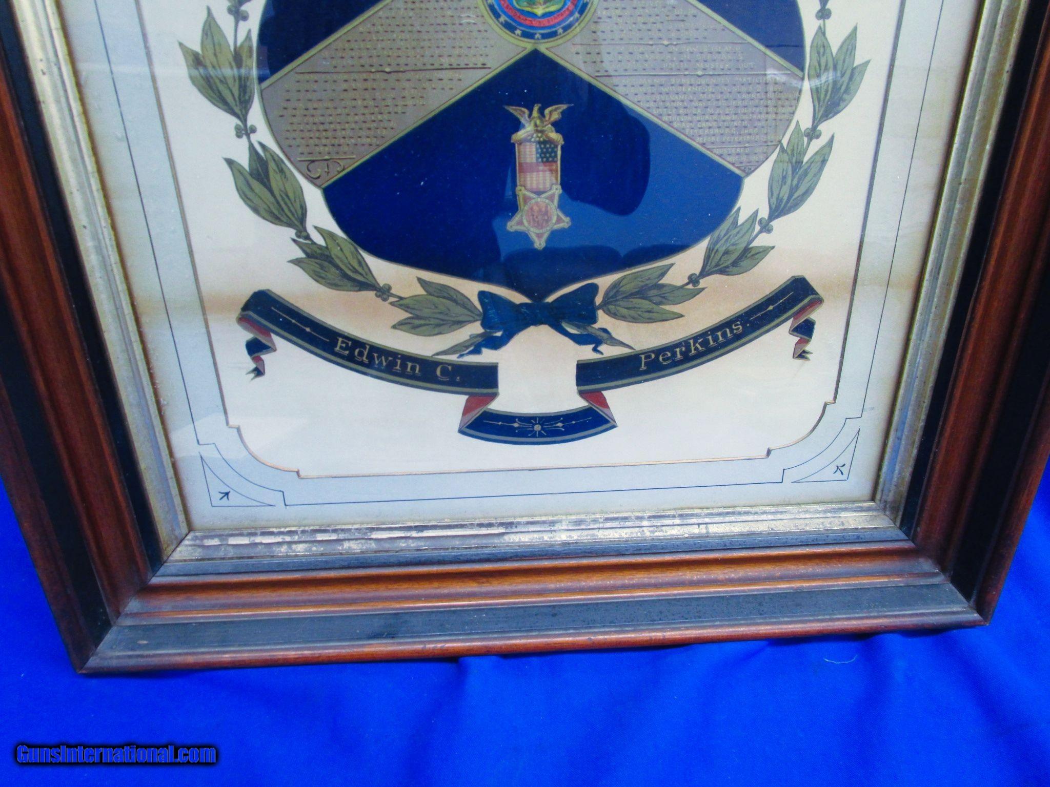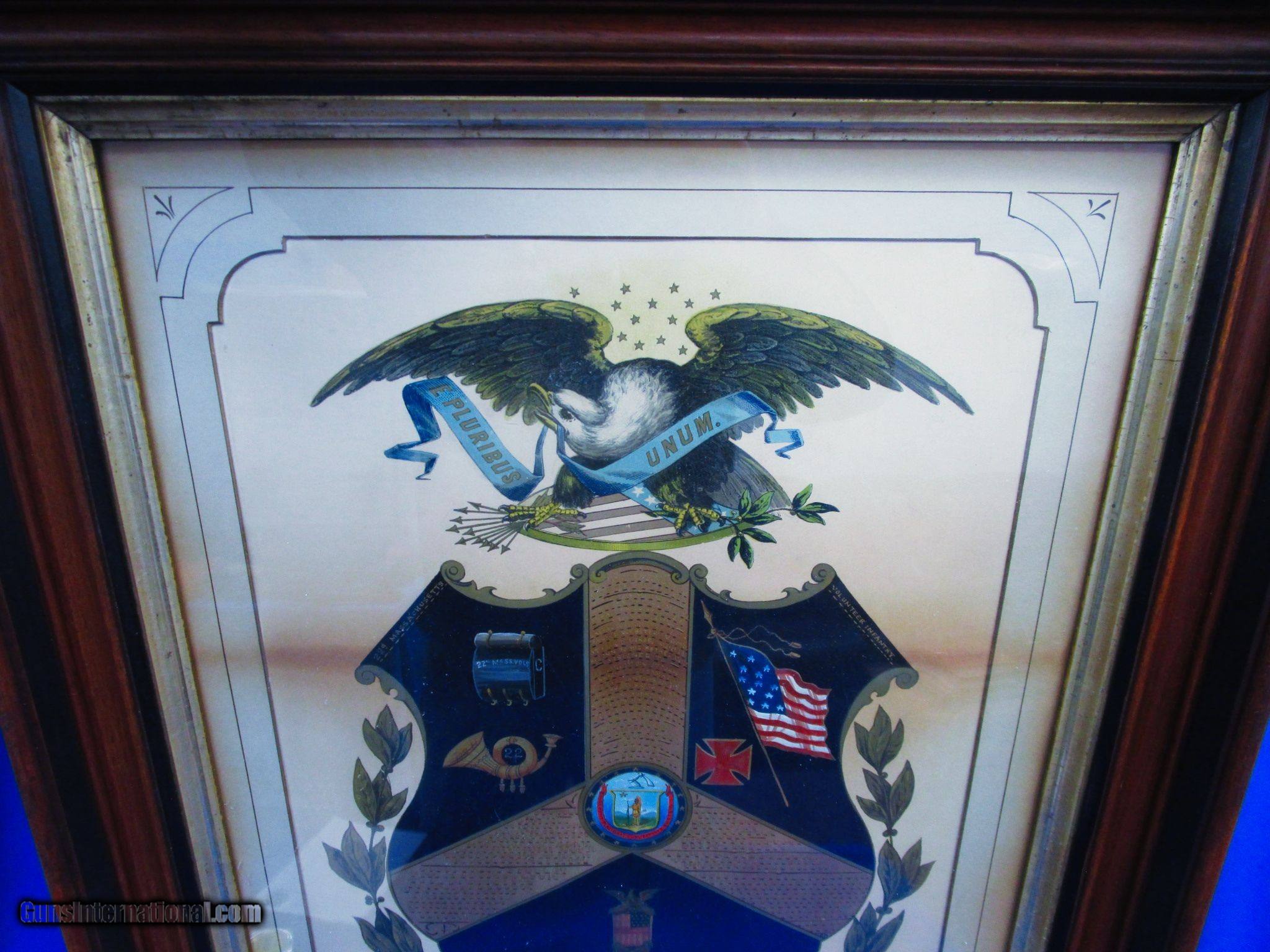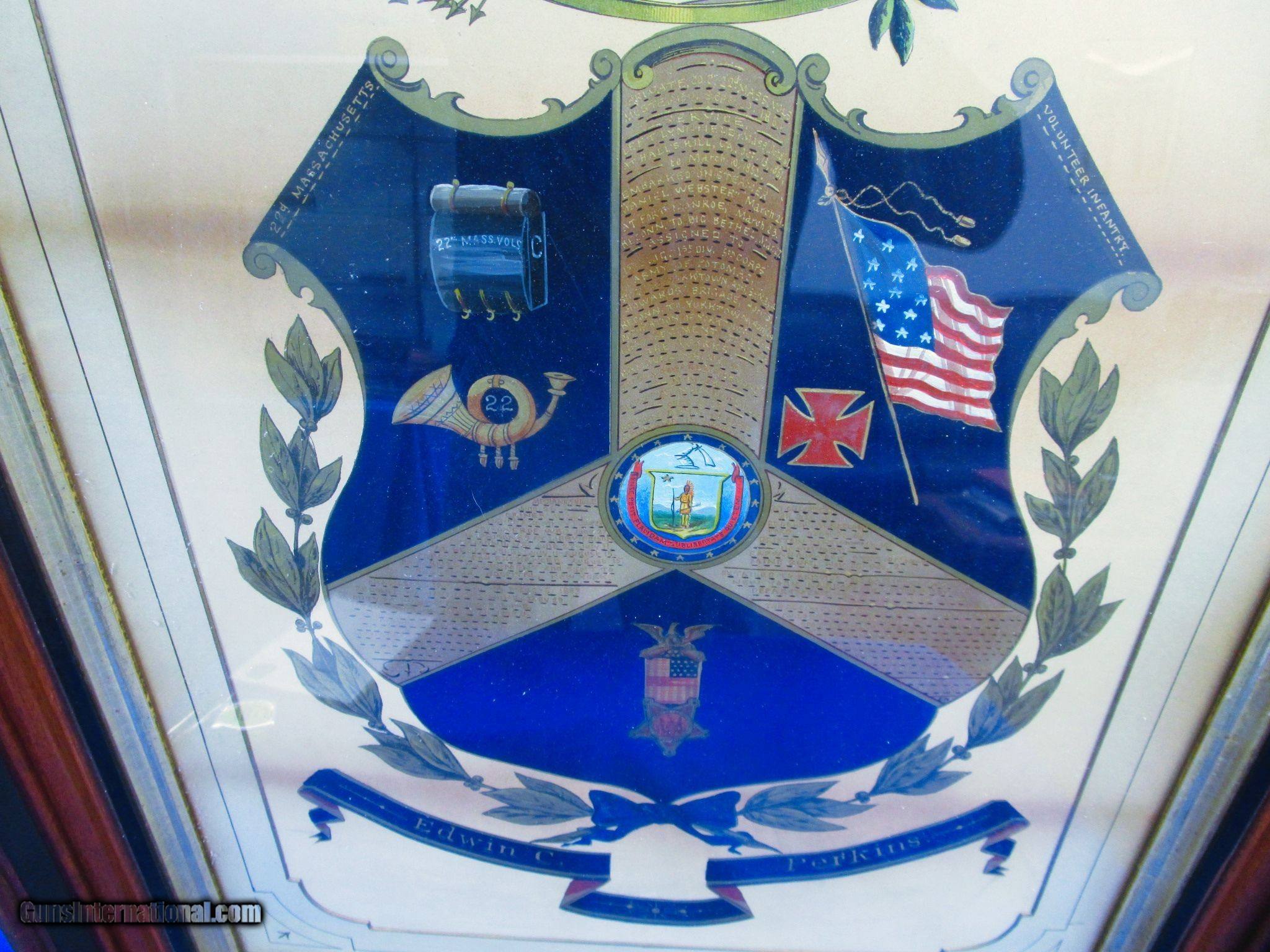 Description: An Early & All Original Large Civil War Painted Escutcheon Named To "Private Edwin C. Perkins" Of "Co. C. Mass. 22nd Infantry" In Fine Untouched Condition. All original and complete. Private Perkins Mustered into Co. C. Mass. 22nd Infantry On Sept. 20, 1861 and did not muster out until September 19, 1864. Edwin and his Company C. Regiment were in just about every major battle or picket there was in Virginia & PA. Theses included Yorktown, Hanover, Mechanicsville, Gaines Mills, Chancelloraville, Gettysburg, Colpeper, Wilderness, Spottsylvania, Cold Harbor, Petersburg, and many more' He was also captured & was in prison from June 21, 1862 to Aug. 15, 1862, when he was Paroled and returned to his regiment. The large escutcheon is very ornate and has all of his battles and information hand painted on it. This includes every battle or picket he was in during the war. It is very colorful as shown in the photo and has a large American Eagle on the top. It is glass covered and framed. The entire escutcheon measures 31 inches by 23 inches. It Has A Wonderful Look To It And Would Be a Great Addition To Any Civil War Collection. This Early & All Original Large Civil War Painted Escutcheon Named To "Private Edwin C. Perkins" Of "Co. C. Mass. 22nd Infantry" Should Definitely Have More Research Done On It! Price: $995.00 Contact Seller |
