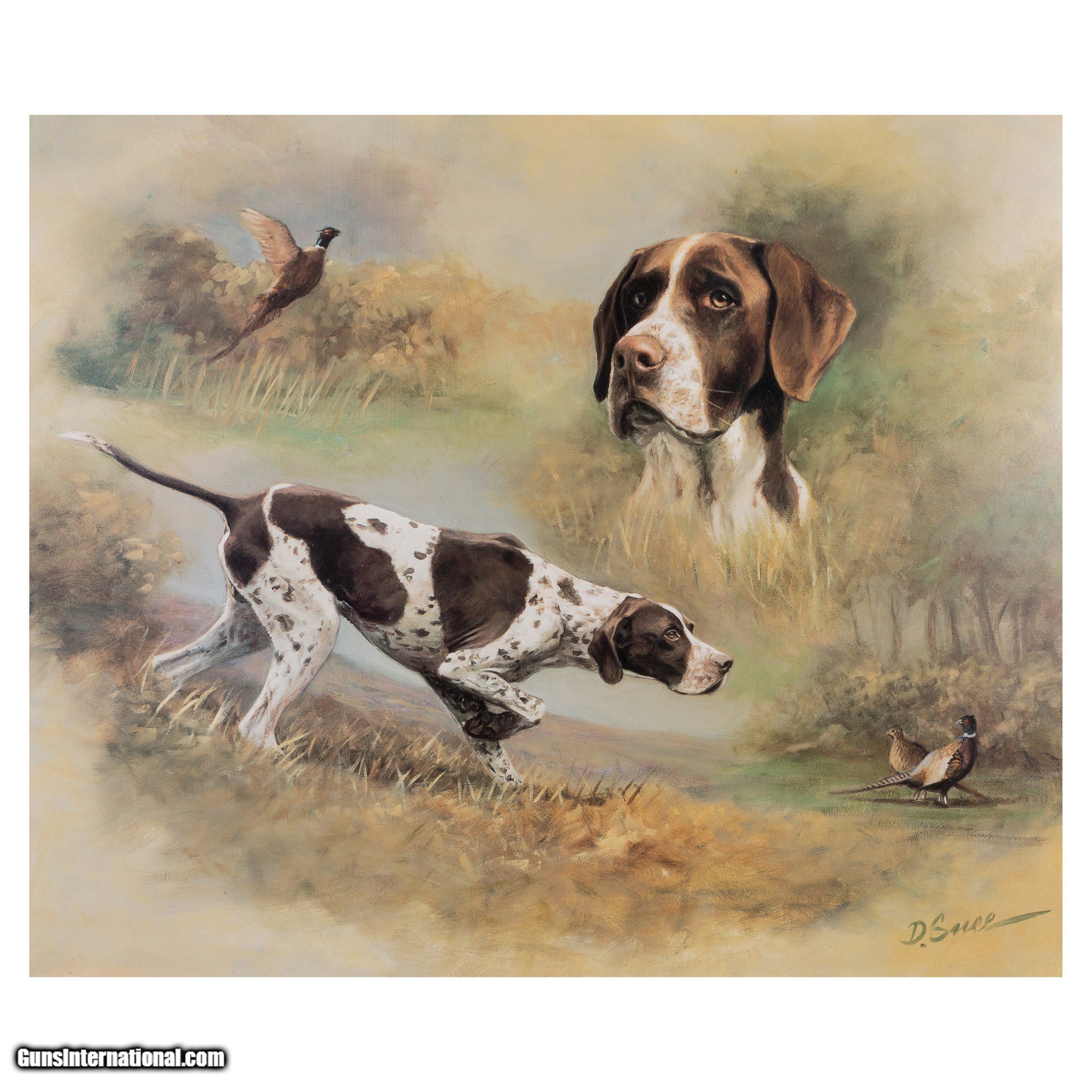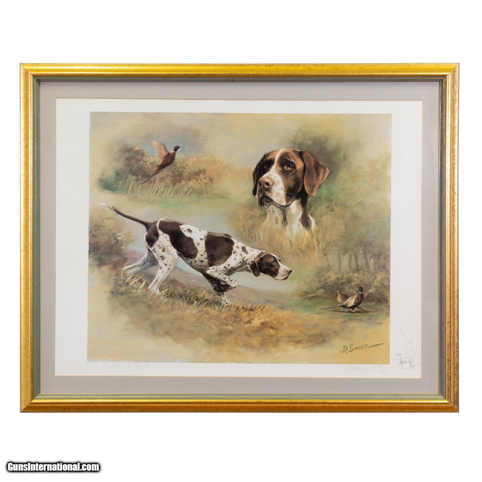 Description: Framed lithograph; 17" x 20". German shorthair pointer with pheasants. Limited edition print 1/800. Noted "For Dave Post July 1990." Pencil signed and remarked. Assume a commissioned piece for a field champion. Well framed and matted. SOLD |