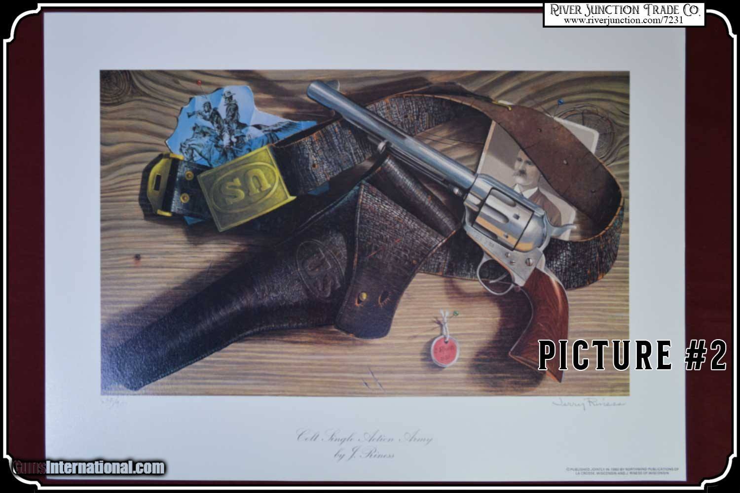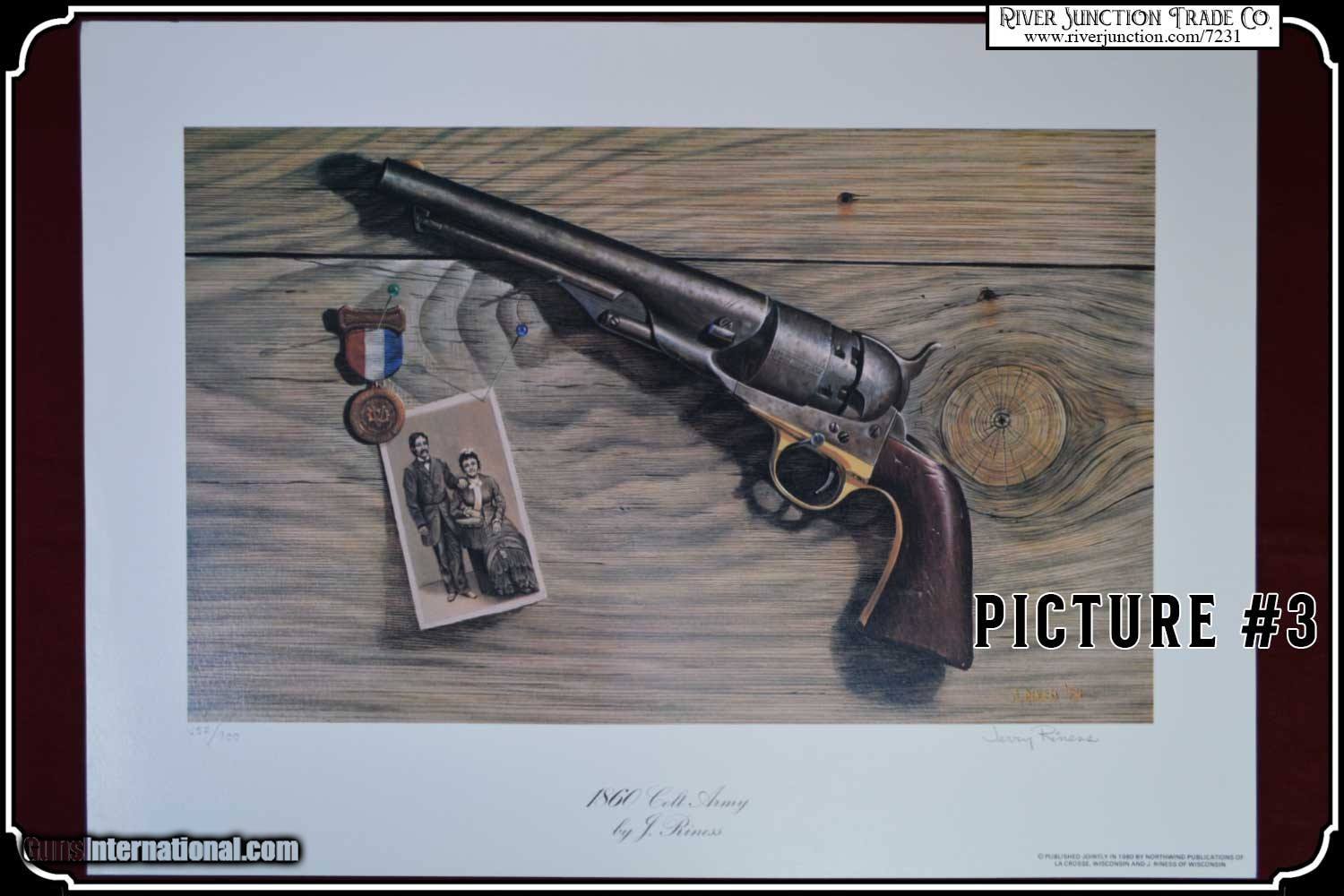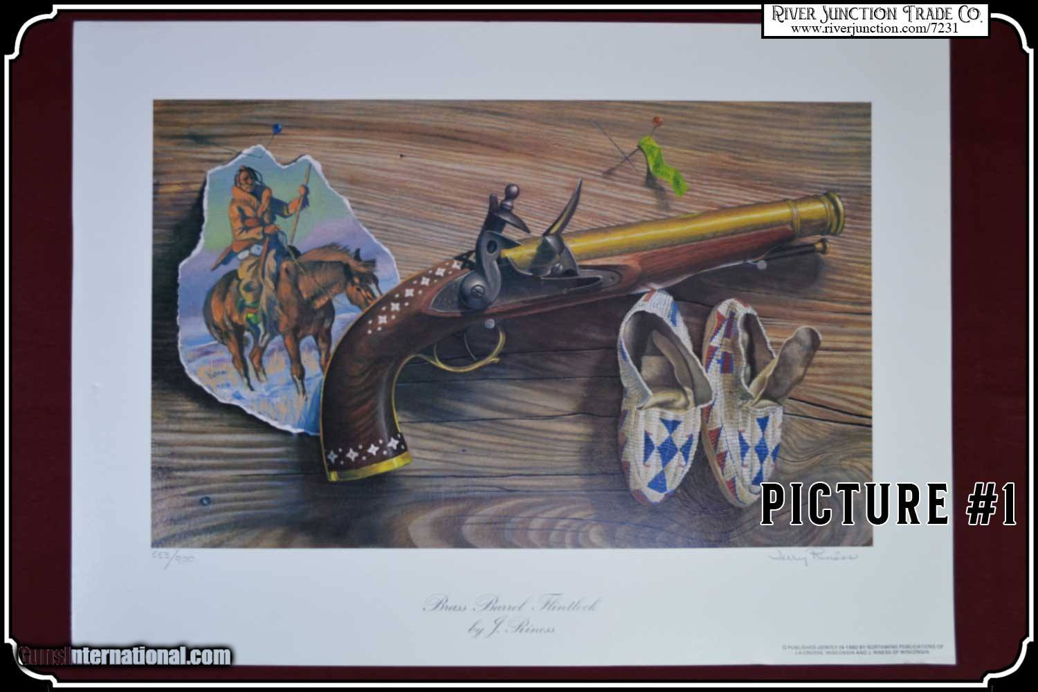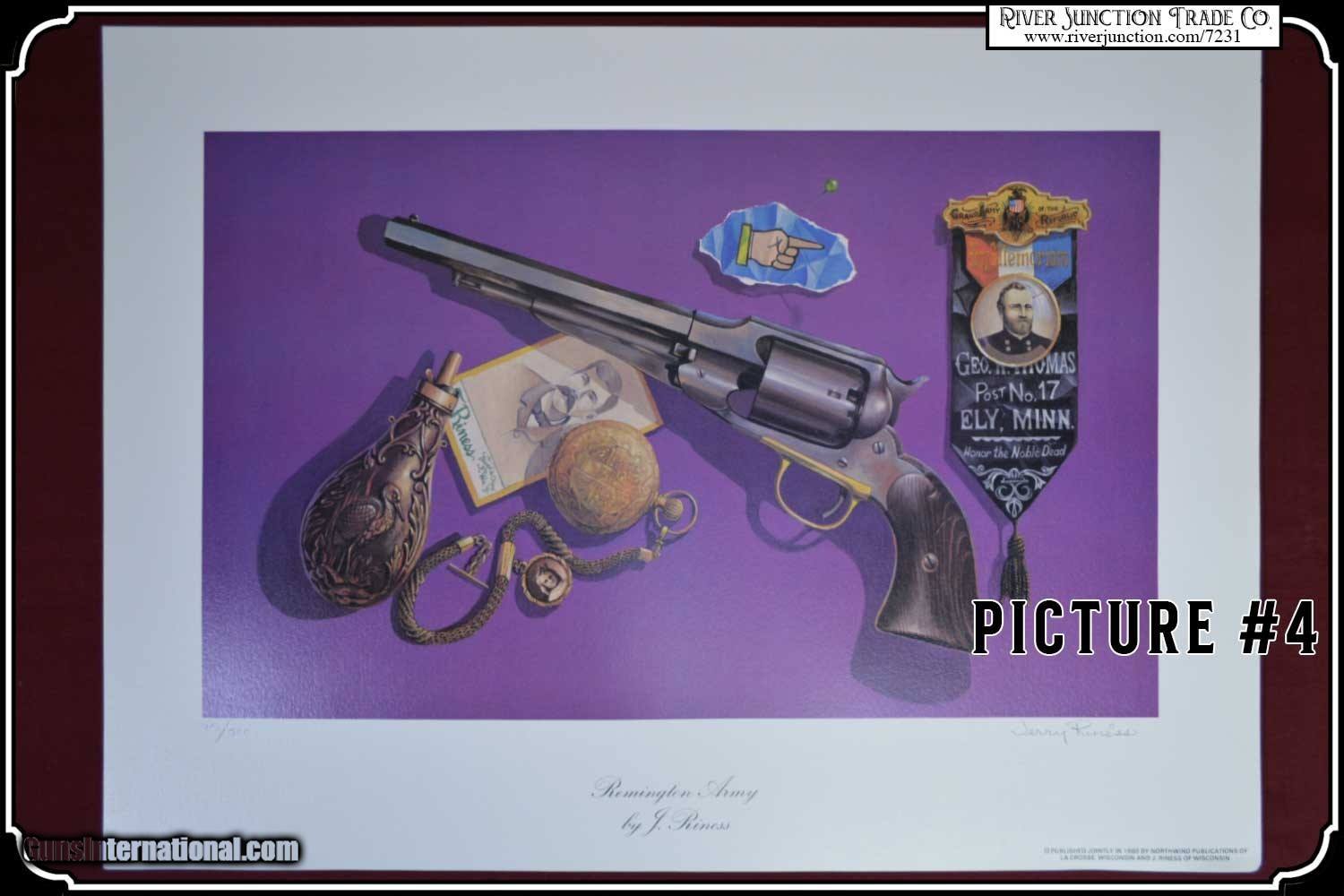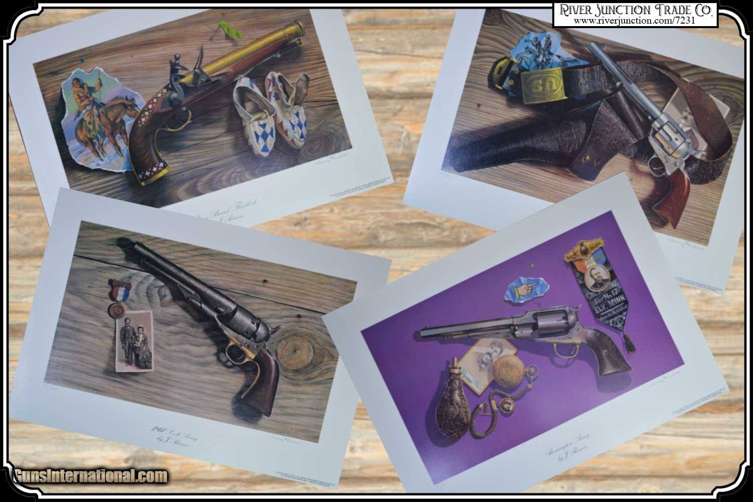 Description: All 4. Great Prints by The Artist, Jerry Riness featuring 4 different Frontier era Handguns. All numbered signed by the artist. (1) Brass Barreled Flintlock, (2) Colt Single Action Army, (3) 1860 Colt Army, and (4) Remington Army" These are perfect for your, Office, Back woods cabin ,Gun Rooms, Den, or as they say "man cave". River Junction Trade Co. was fortunate enough to find a small cache of these unique prints in the hands of a traveling entrepreneur from the days before the internet. They are all in first class excellent condition. Ready to frame. I understand a book of Jerry Riness art has now been published. We hope to be offering it soon. Price: $128.00 Buy Now Contact Seller |