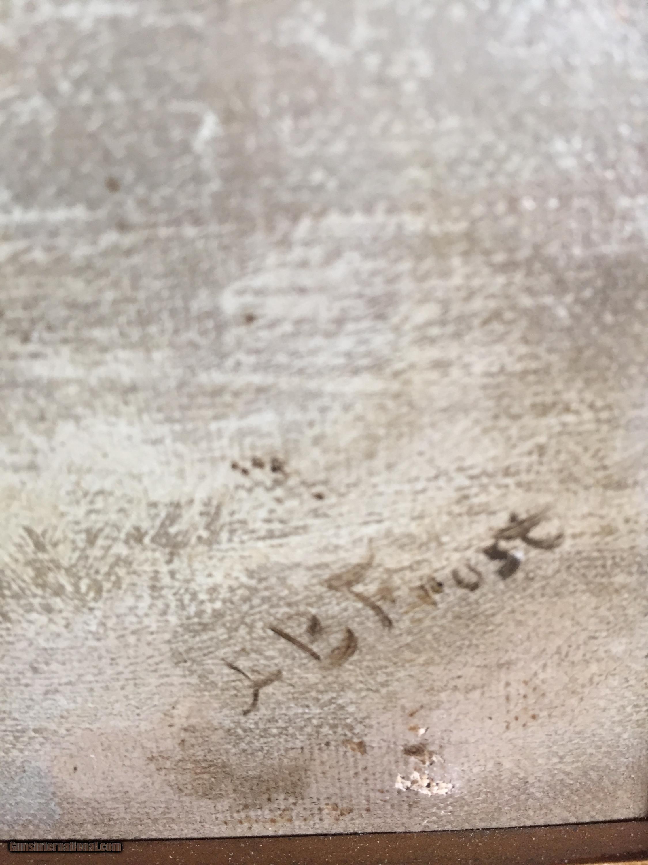 Description: PRICE REDUCED! Arthur Burdett Frost (1851-1928), known for not only his sporting art but also for being the initiator of the comic medium in the late1800's and early 1900's, was a pillar in American art history. Notable collections of the artist's work can be found at the Library of Congress, Smithsonian American Art Museum's Renwick Gallery, George Eastman House, University of California, Rice University, and the Carnegie Arts of the United States Collection. He studied at the Pennsylvania Academy of Fine Arts with the renouned Thomas Eakins later studying with Gilbert Tucker Margeson and William Merritt Chase. Initially Frost became known for his illustrations in Lewis Carroll's "Rhyme? and Reason?" (1883) and also "A Tangled Tale" (1885). He illustrated Joel Chandler Harris' well known "Tales of Uncle Remus" (1880). His illustrations greatly helped these books' success and gave the artist great notariety. Later in his career, Frost honed his ability to replicate scenes from real life in a pictorial realism. His authentic details of hunting and fishing became a cornerstone of his legacy, and many of his paintings have sold for more than $100,000. In this signed (lower right) and rare oil on canvas, "Hunter and Guide", of an Adirondack scene, there is an excitment of the instant when game is encountered, and this feeling is vividly brought to life. Interestingly, the hunter in this painting closely resembles the hunter in another of Frost's works, "Success", that sold for $72,000. This painting was probably painted in the 1880's or 1890's and has been in this owner's possession for about 40 years. It is in its original framing. There is a small repair shown in the photo of the back slighly right of center, but the rest of the painting remains in excellent condition. The painting is offered at a new bargain price and represents a huge opportunity to acquire a beautiful painting by one of the 19th century's top sporting art painters. Painting dimensions are 21.5 inches X 18.5 inches framed and 17.5 inches X 14.5 inches image size. SOLD |