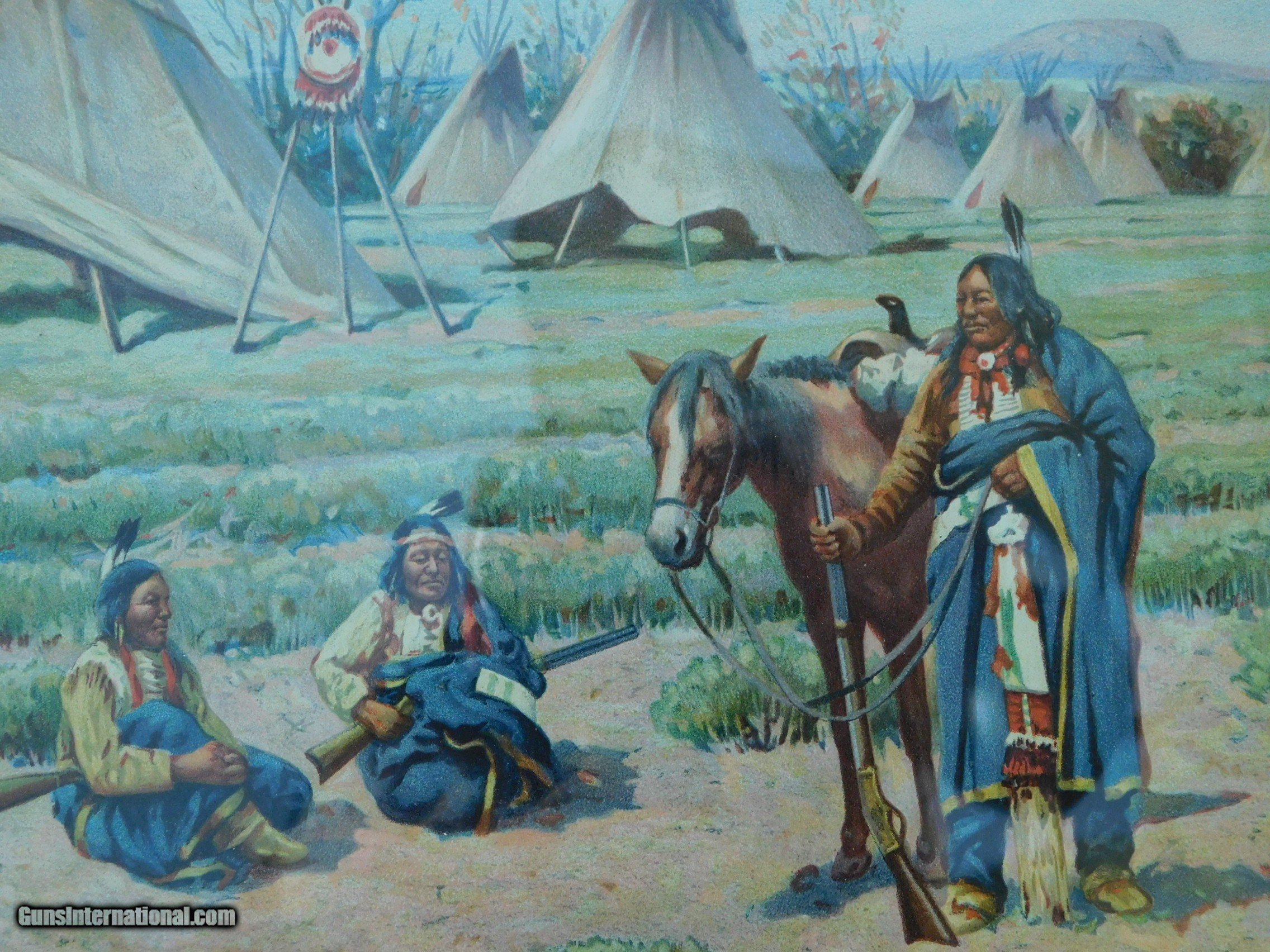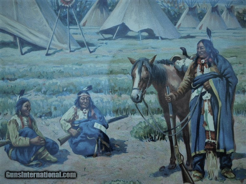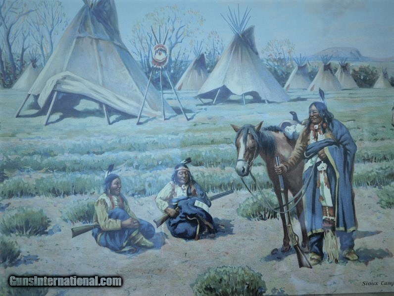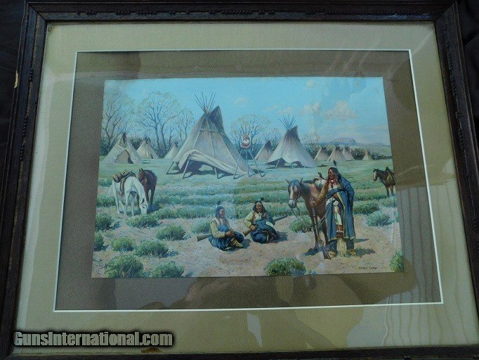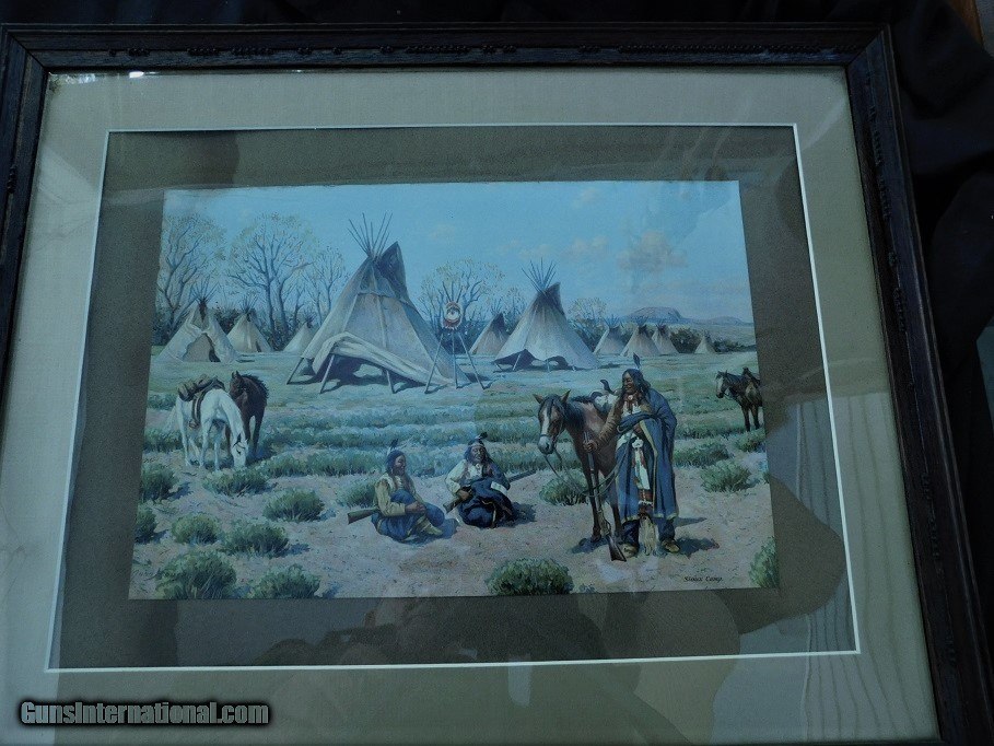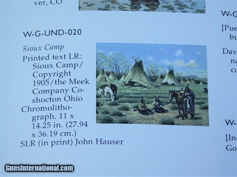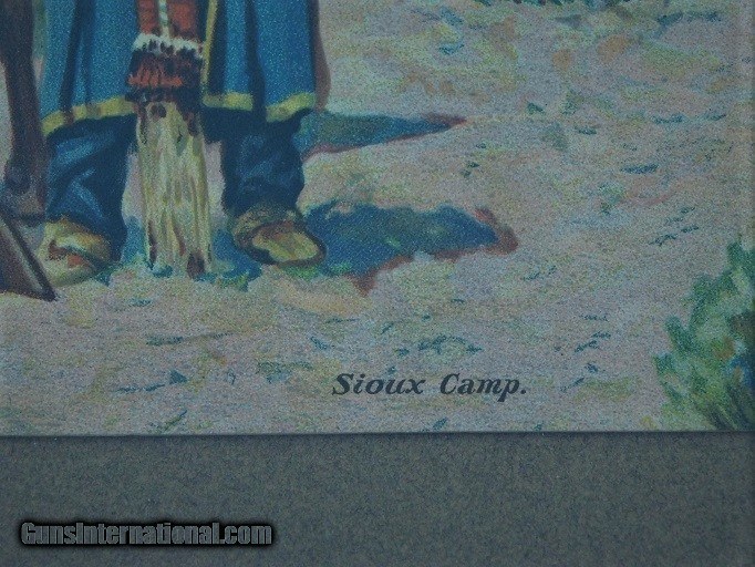 Description: Original John Hauser " SIOUX CAMP " 1905 Chromolithograph by The Meek Company Coshocton Ohio, actual chromo size 14 X 9-1/2, overall frame sixe 17-1/2 by 22 inches. Frame & matt seem to be original to the Chromograph. As pictured in the book Straight White Shield page 211. A Life & Works of John Hauser 1859-1913. Has been in the same family since its purchase. Delivery to be determined at sale along with delivery cost. Feel free to ask any questions and or make a reasonable offer. SOLD |