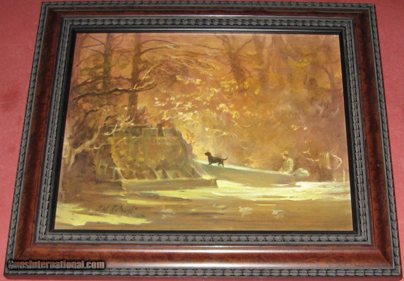 Description: An original oil on board by noted artist Joseph Sulkowski.The scene depicts a duck hunter and his lab motoring into a blind in a flooded timber bottom.The image size is 91/2" long and 8" high.Framed in a carved walnut frame.A nice piece for your office,den,or gunroom.Priced at more than half what the artist would charge to replace it. SOLD |