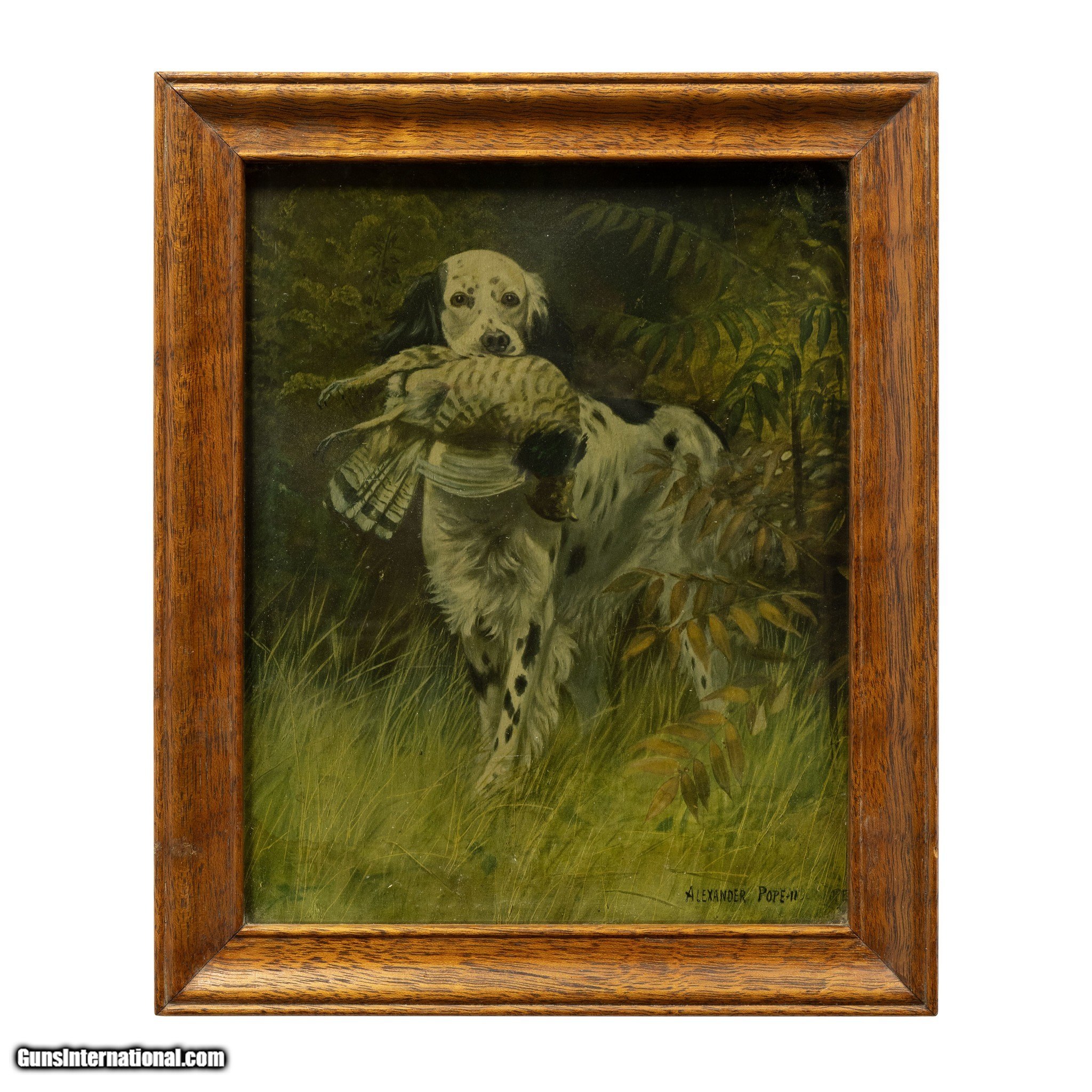 Description: Vintage framed print of English Setter holding a grouse by Alexander Pope. 9" x 10 1/2" Early 20th Century SOLD |