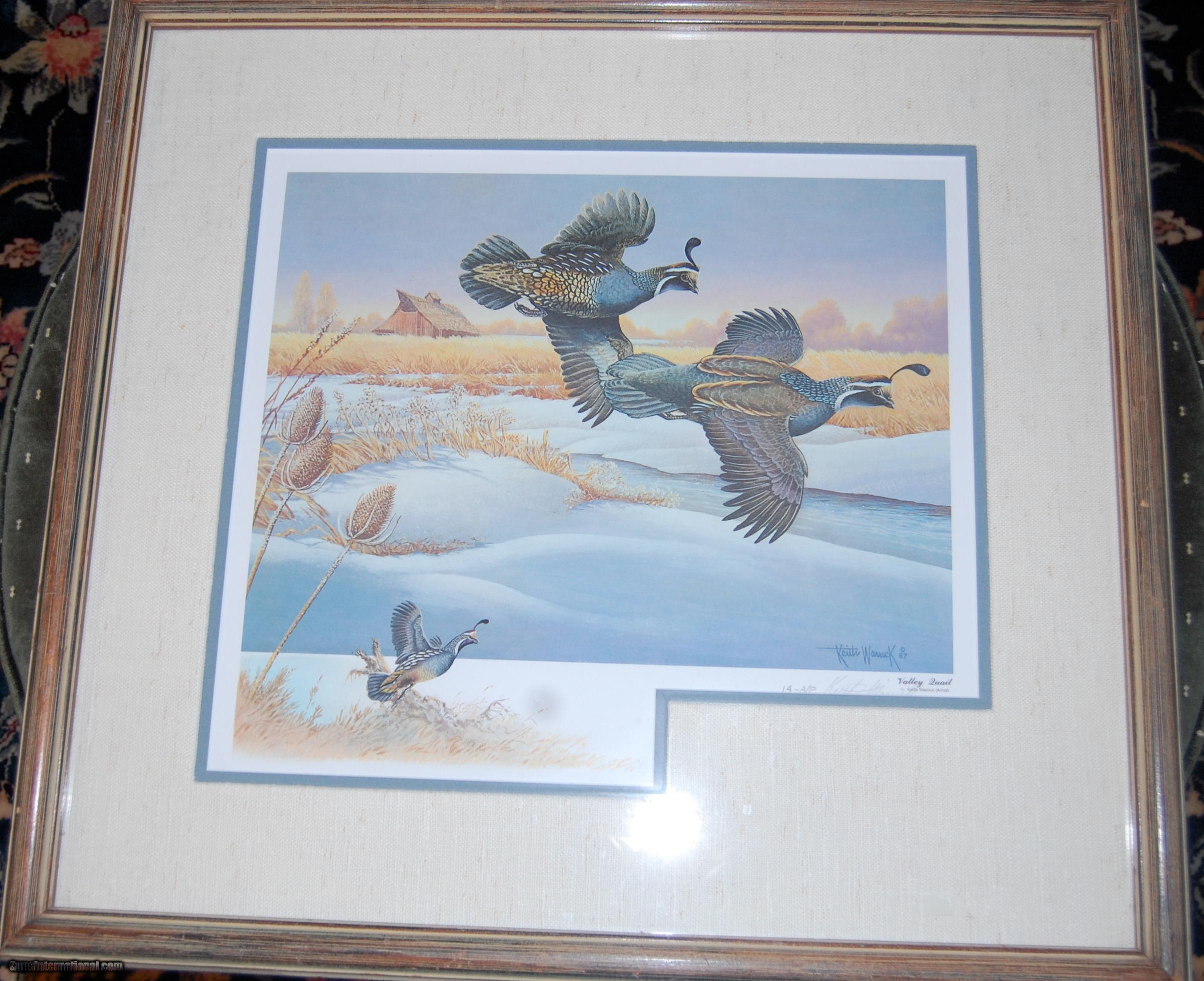 Description: Limited edition print of valley quail by Keith Warrick.Beautifully framed and matted.Signed and numbered #14.The image size is 14"x15".Valley quail are seldom seen in sporting art.Priced at less than the framing cost. SOLD |
