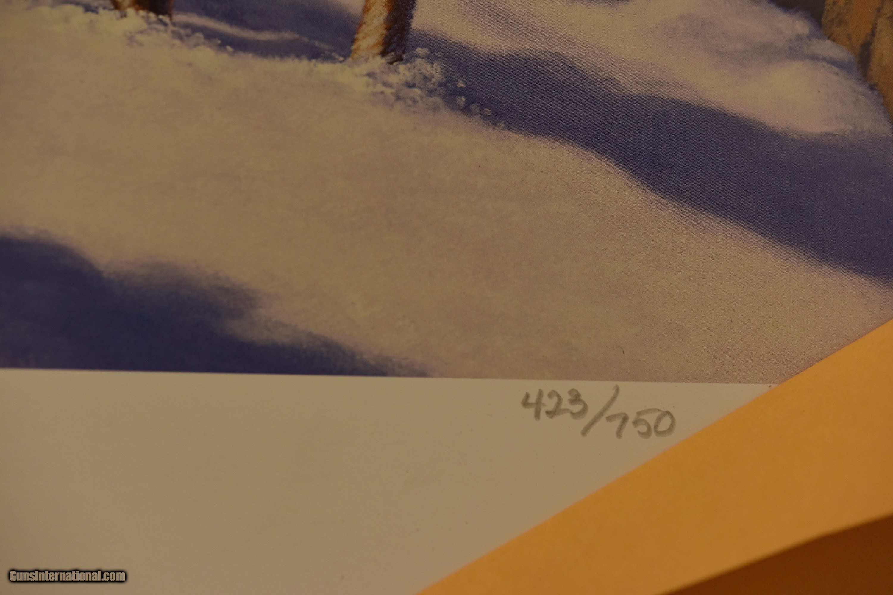 Description: If you are a trophy mule deer hunter, you have probably heard of these these giant bucks. Brent Todd realistically painted "Popeye", "Morty", and "Goliath" together from individual photos of each of these three Booners! This print is a limited edition of 750 that sold out years ago, and is only available on the secondary market. Overall diminsions are 21.5" X 27". A truely beautiful art print. SOLD |