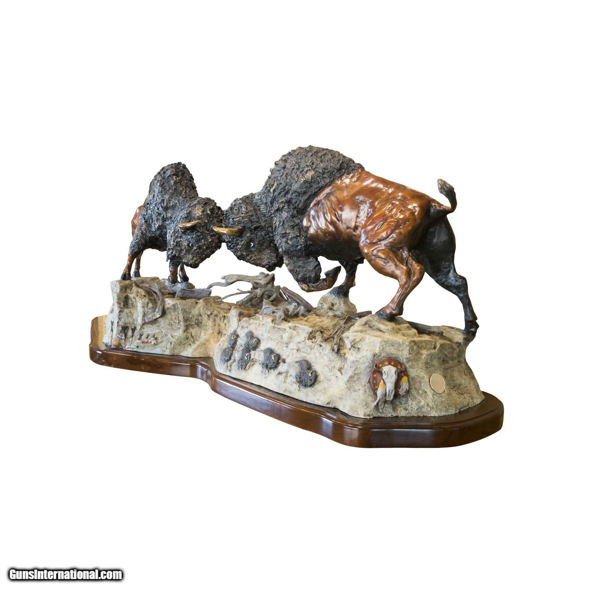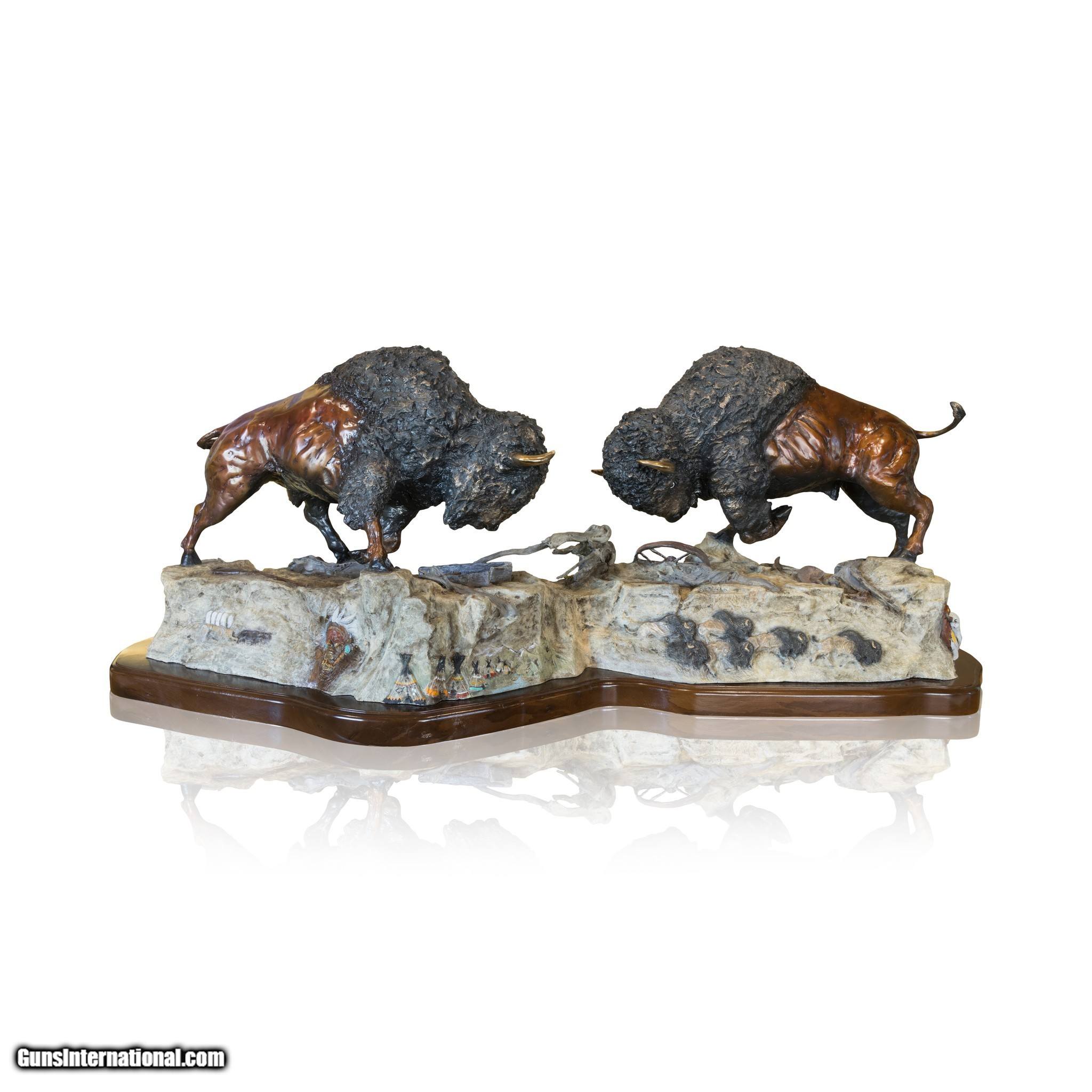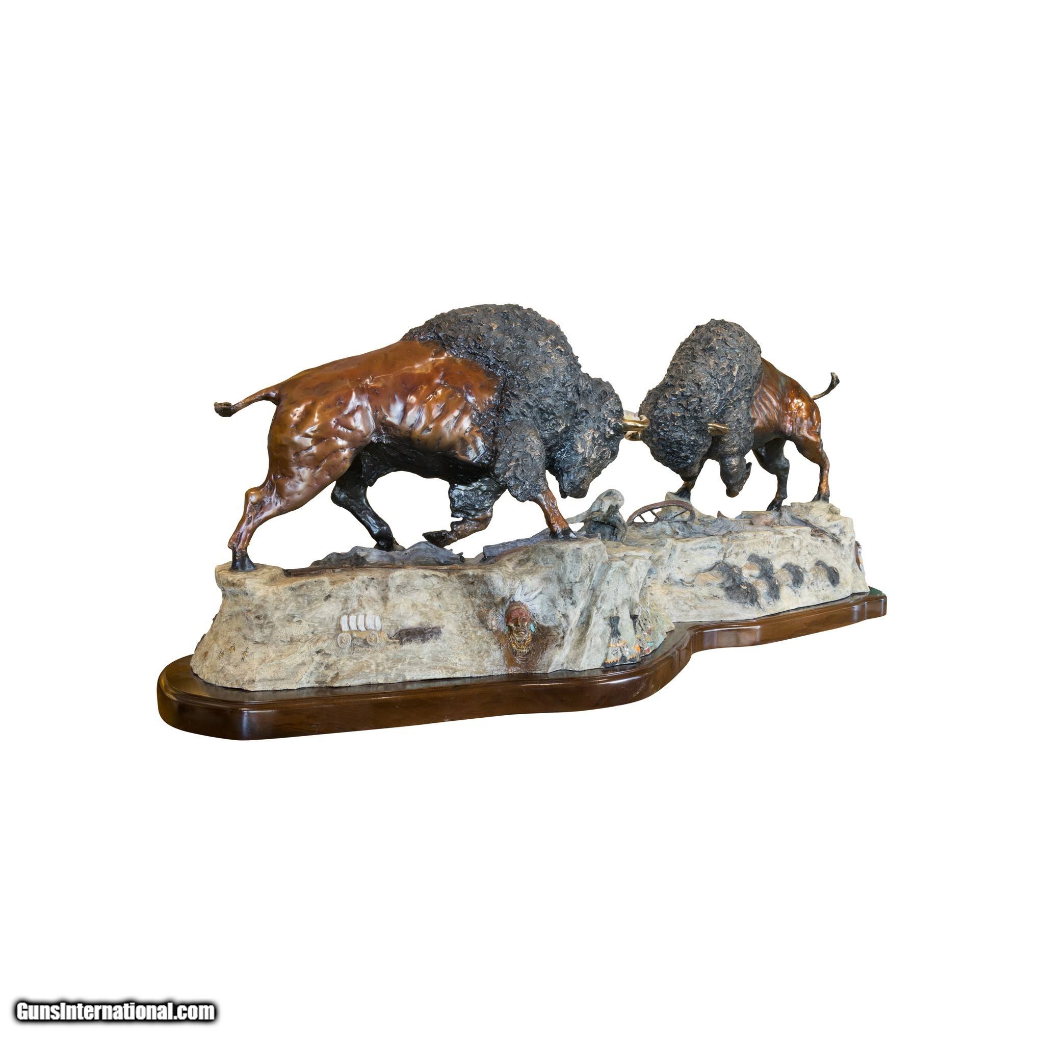 Description: Limited edition 12/150. Polychrome patina with pictorials around bottom. One sterling buffalo coin embedded in base. Piece portrays two bronze buffalo standing eye to eye, horns down and at the ready, tails swishing in anticipation. This is a stunning piece that is impossible to overlook, brimming with movement and life. Perfect for the southwestern or cowboy home. Size: 59" x 19" x 23" including base. Artist Bio: Laran Ghilgieri mastered his craft the old-fashioned way: through apprenticeship. His great-grandfather, Battista Ghiglieri, carved the stately marble lions of the New York Stock Exchange and fostered three more generations of master sculptors in his family: Laran’s grandfather, Angelo, Is best known for his massive marble of a Franciscan priest in Bakersfield, CA, and Laran’s prolific father, Lorenzo, gifted Pope John Paul II, Mikhail Gorbachev and the King of Spain with bronzes of St. Francis of Assisi, in the spirit of peace. Laran Ghiglieri studied under his father for more than 20 years. Together, they explored the richness of the world, from the Vatican to Indian reservations. SOLD |