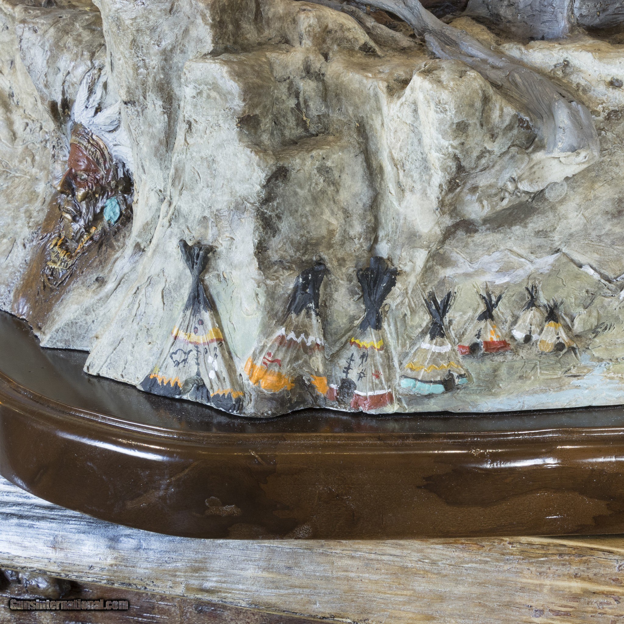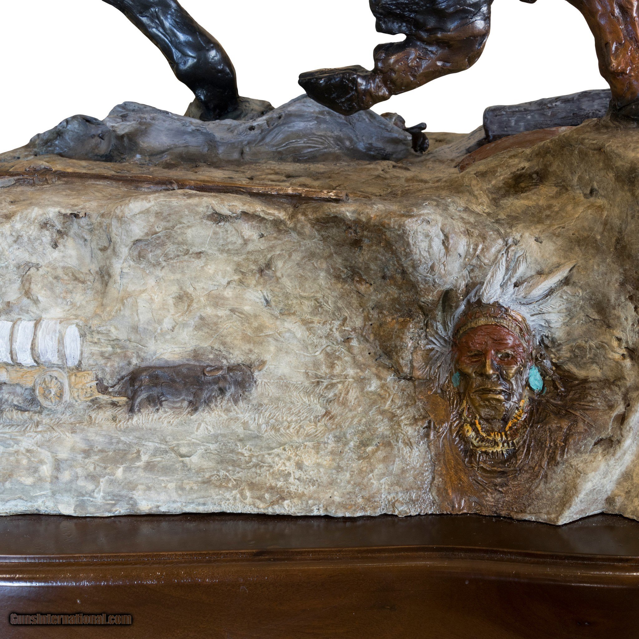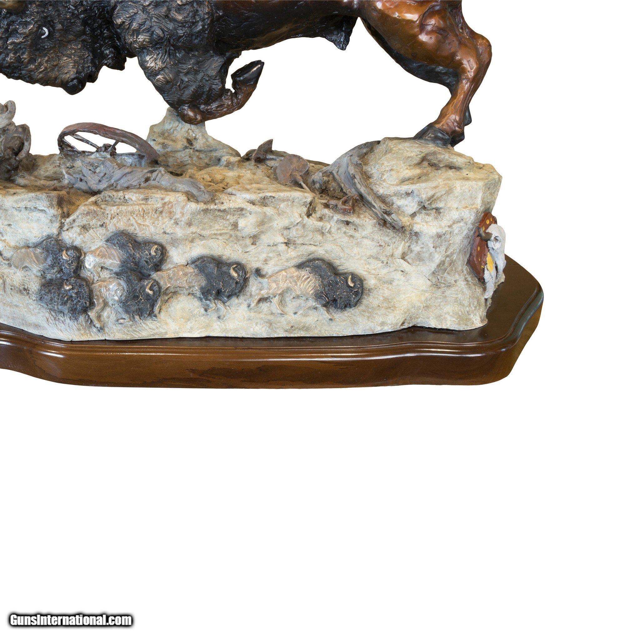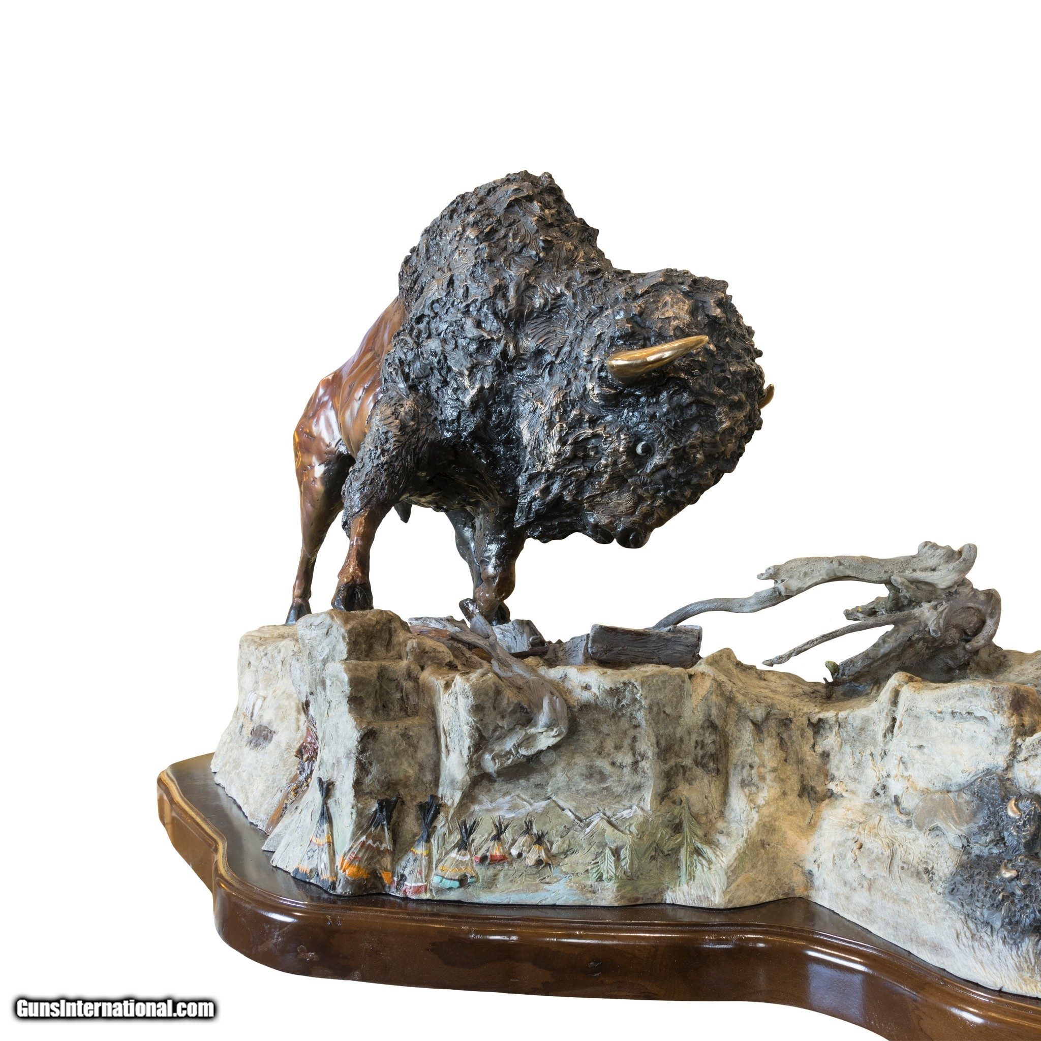Description: Limited edition 12/150. Polychrome patina with pictorials around bottom. One sterling buffalo coin embedded in base. Piece portrays two bronze buffalo standing eye to eye, horns down and at the ready, tails swishing in anticipation. This is a stunning piece that is impossible to overlook, brimming with movement and life. Perfect for the southwestern or cowboy home. Size: 59" x 19" x 23" including base. Artist Bio: Laran Ghilgieri mastered his craft the old-fashioned way: through apprenticeship. His great-grandfather, Battista Ghiglieri, carved the stately marble lions of the New York Stock Exchange and fostered three more generations of master sculptors in his family: Laran’s grandfather, Angelo, Is best known for his massive marble of a Franciscan priest in Bakersfield, CA, and Laran’s prolific father, Lorenzo, gifted Pope John Paul II, Mikhail Gorbachev and the King of Spain with bronzes of St. Francis of Assisi, in the spirit of peace. Laran Ghiglieri studied under his father for more than 20 years. Together, they explored the richness of the world, from the Vatican to Indian reservations. SOLD |
