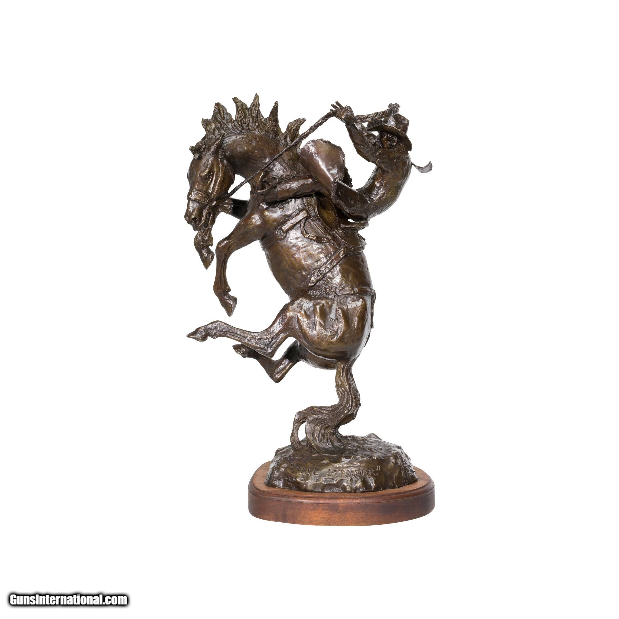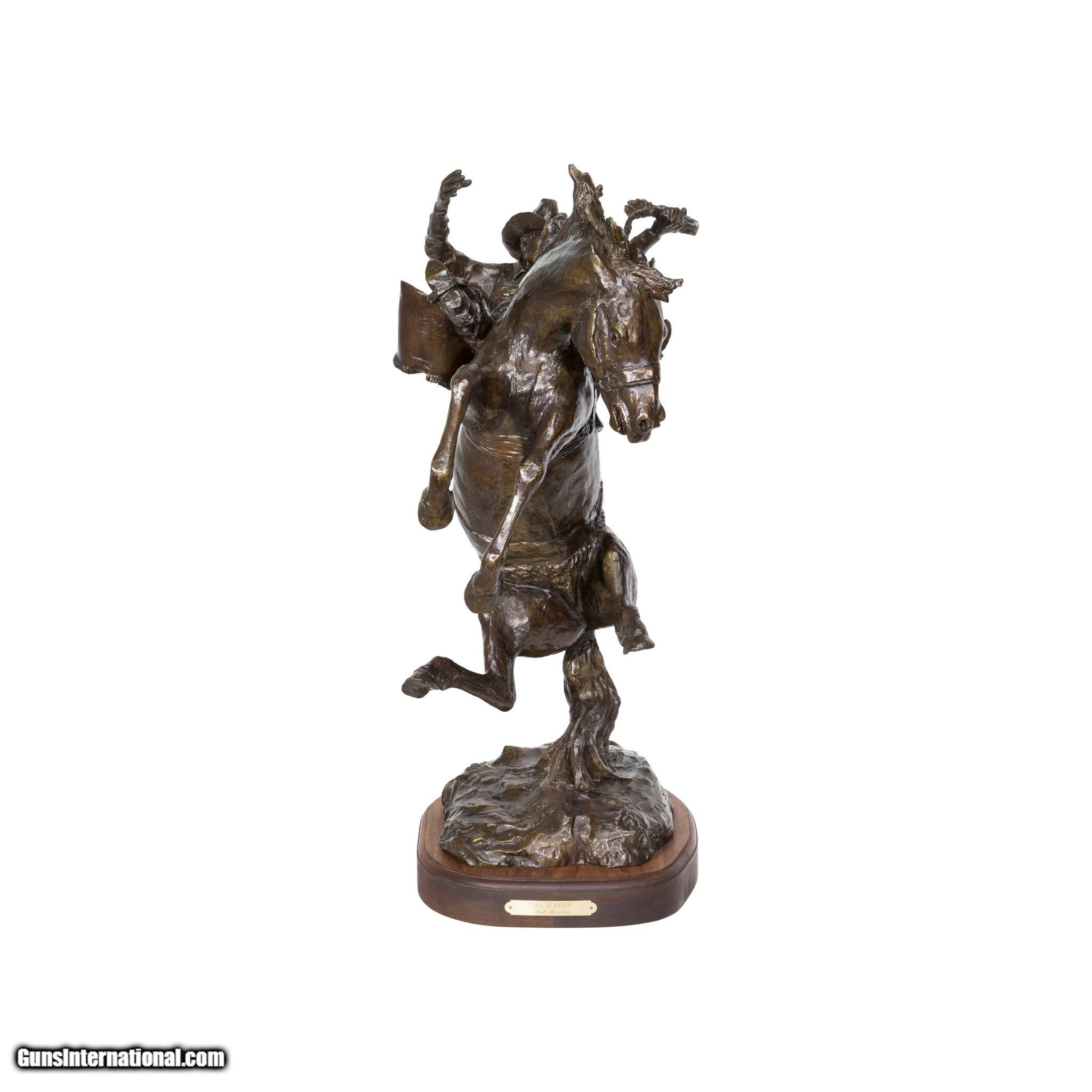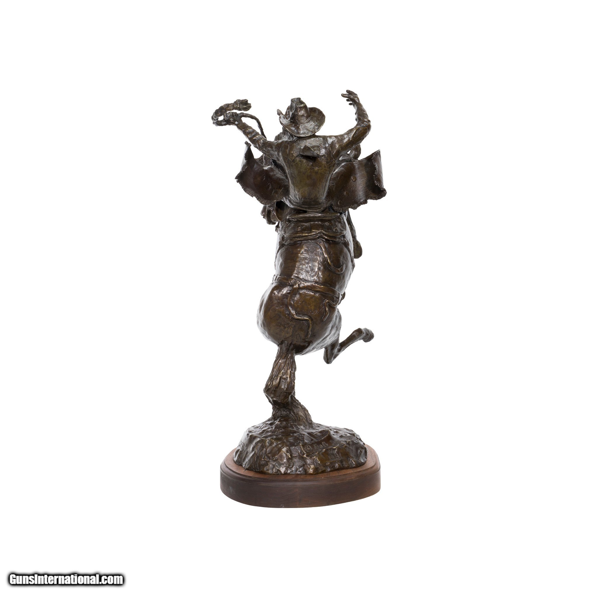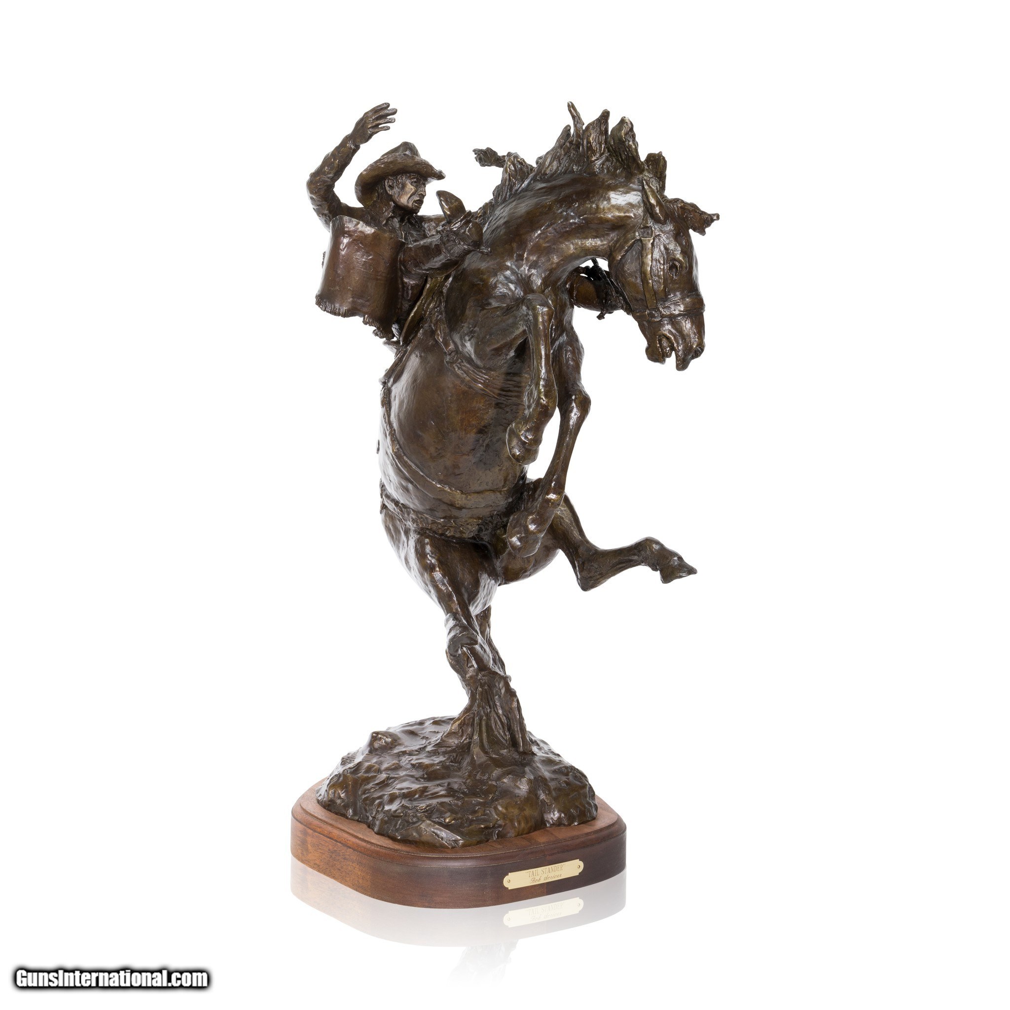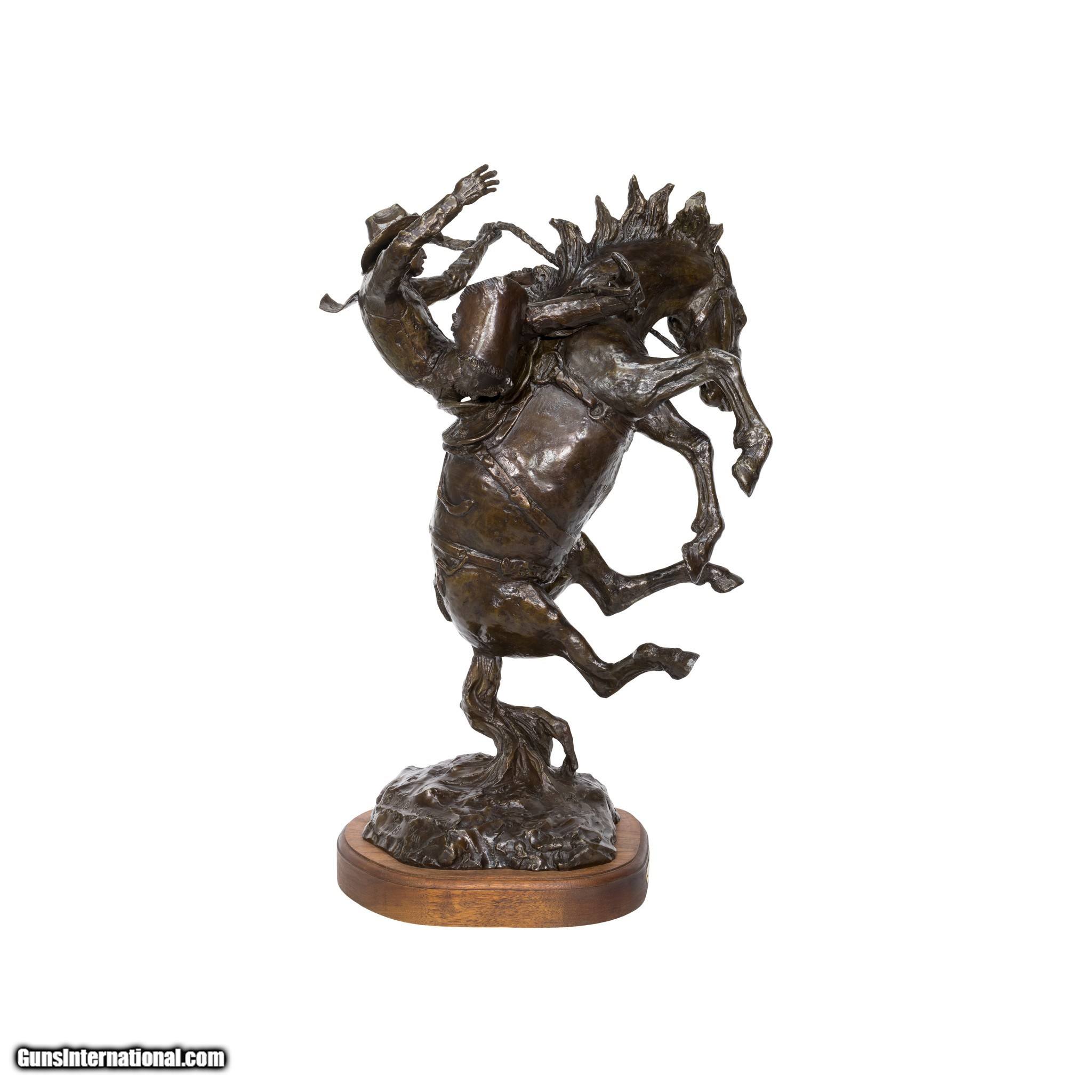 Description: (1914 - 1999) Limited edition bronze. Western cowboy themed bronze portraying a cowboy on horseback. Horse is rearing up and faling over, sendin the cowboy off his back. Dynamic and fun piece that would compliment a western or southwestern themed home nicely. Size: 24" x 15" x 10 SOLD |