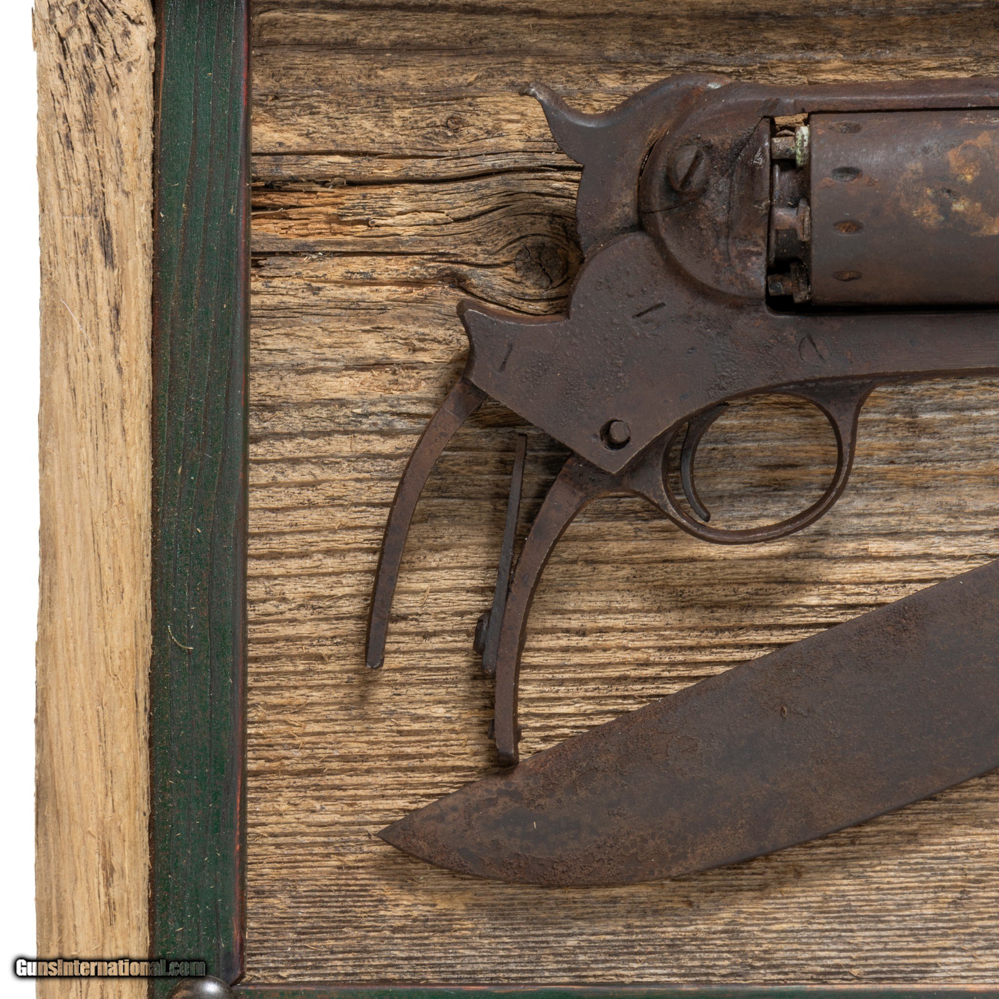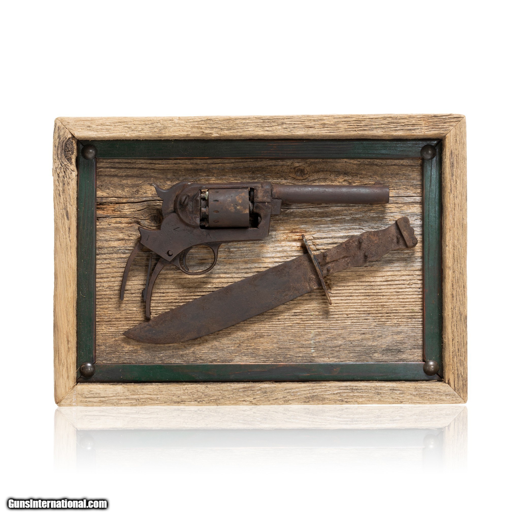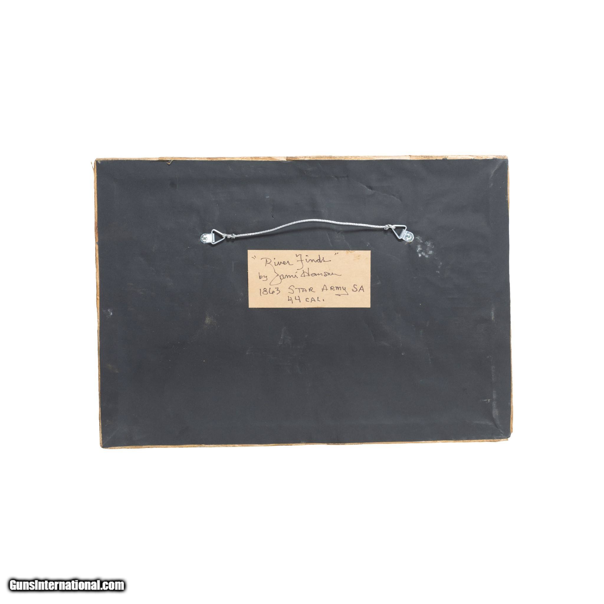 Description: 1863 Star Army revolver .44 caliber and frontier knife. Found by a diver in the Spokane River. Framed in shadowbox. Great for display in a Western or Southwestern style home, rustic cabin, or lodge. Size: Shadowbox 16" x 11" x 2" Family Owned & Operated Cisco’s Gallery deals in the rare, exceptional, and one-of-a-kind pieces that define the history of America and the Old West. Our pieces range from American Indian to Cowboy Western and include original items of everyday life, commerce, art, and warfare that tamed America’s frontier. Our 14,000 square foot gallery opened in 1996 in beautiful Coeur d’Alene, Idaho. Personal Service Cisco’s operates on old fashioned values – honesty and integrity, and all of our items are backed by our money back guarantee. We appreciate the opportunity to earn your business. Whether you desire assistance with a jewelry purchase, choosing a gift, identification, or even selling – we hope to be your trusted source. SOLD |