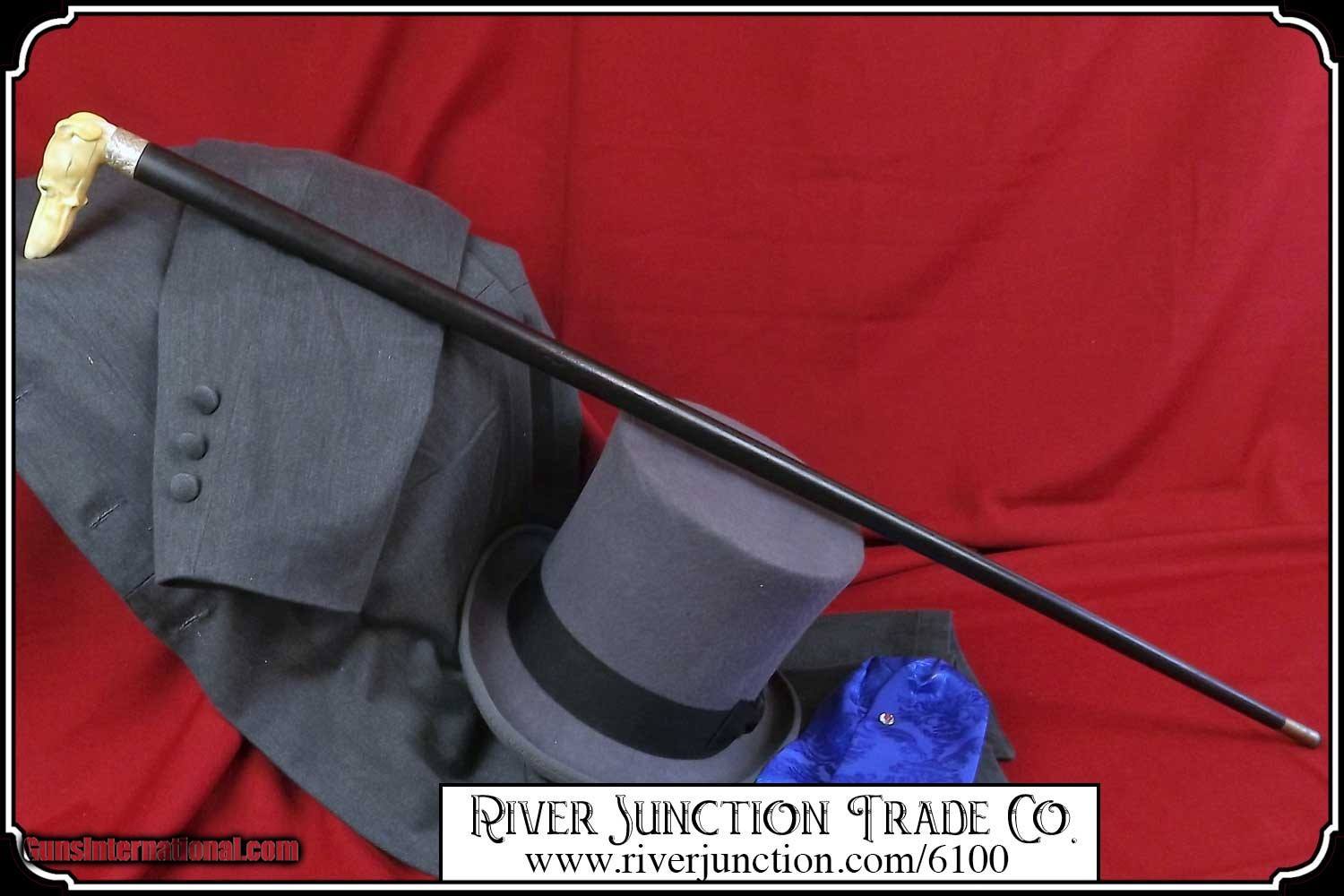 Description: A beautifully carved Hound head walking stick made of a dark black hard wood shaft with a brass finial. This piece features a Dog head as the pommel and has been carved by quite a skilled craftsmen. There is no obvious chips, only a few cracks, but all are stable and have been there for a century and likely will be for a century more. Late 19th century. A naturalistic carving depicting a Grey Hound-head looking racing dog. Distinguished by a creamy and uniform patina covering this piece with character and allure. This beautiful quality ivory handle is 1 1/4 inches high x 3 1/2 inches long and 1 1/8 inches wide, embellished with inset glass eyes. There is a silver collar. The O.L. is 35 inches, it has minimal signals of use, surviving in pristine condition without dents or chips. Other items shown are not included. Payment: Item, can be ordered on line with a credit card or paypal on our sight. Just Google (riverjunction) and type in the River Junction Trade Co. item number (6100) in the search box. Before you checkout you will see shipping cost and total. OR If you prefer: Pay by cash, postal money order, cashiers check, personal & business checks. We wait for checks to clear. We always answer questions and entertain offers. Have questions? Call me 563-880-4588. Jim SOLD |