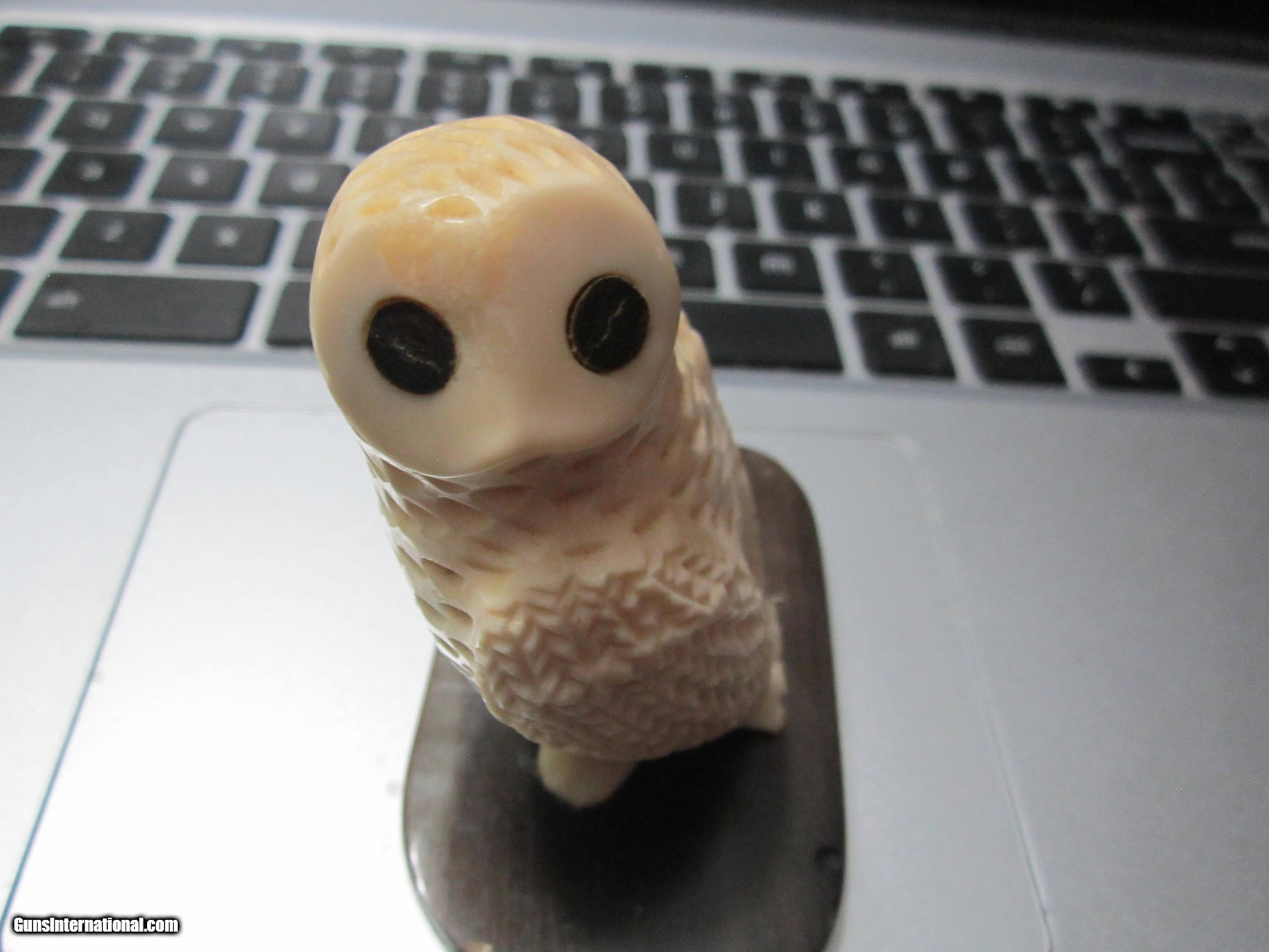 Description: .If you Buy more than one carving I will discount each $50.00......A finely Carved Snow Owl on Baleen Pedestal, Inuit 1950's Artist/carver signed 3. inch 3.985 ounce. Baleen eyes. As good as they get. Great starter or addition to your collection. email any questions. I promise fast shipping. Check or Money order O.K. $18.95 s/h. The piece you see is the piece you will receive. Need another photo? Let me know. SOLD |