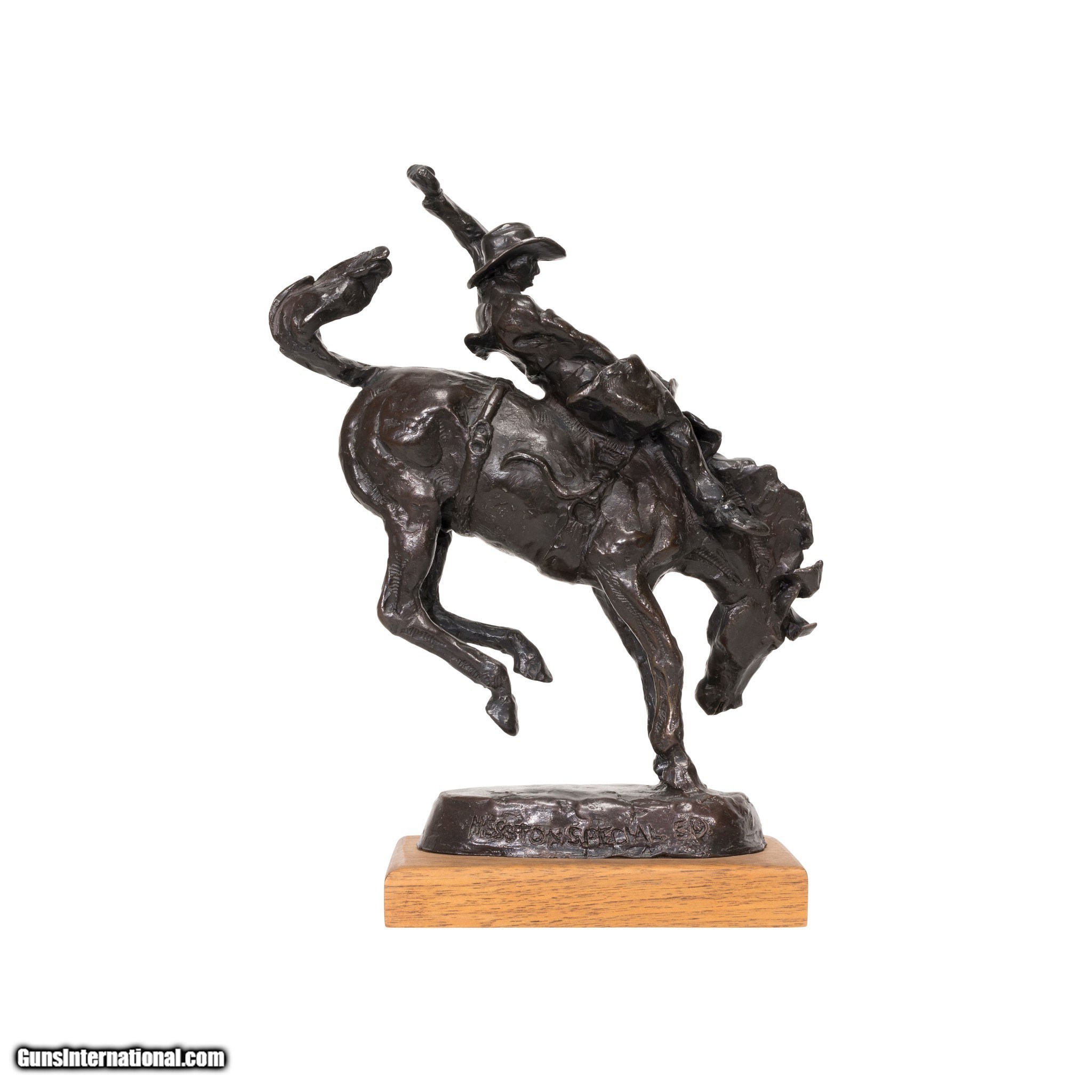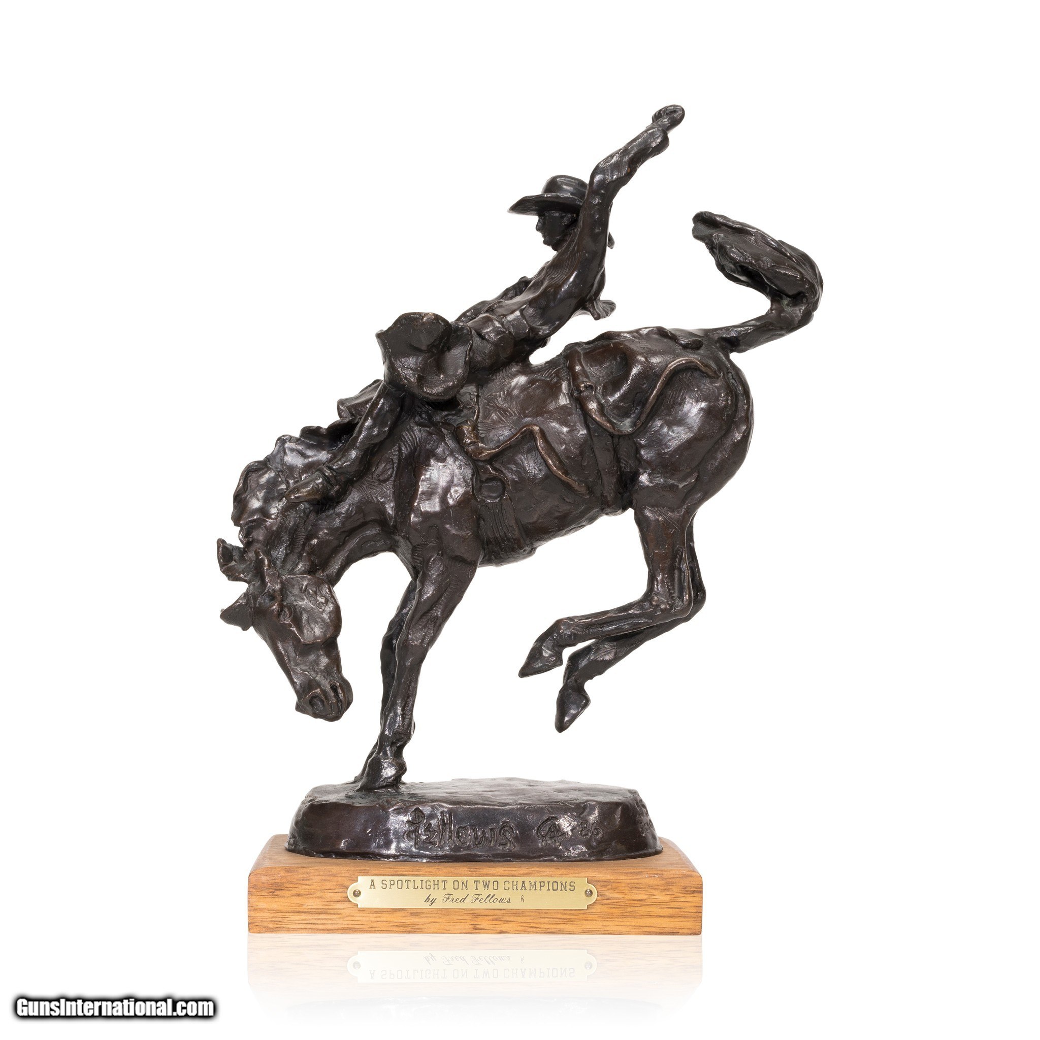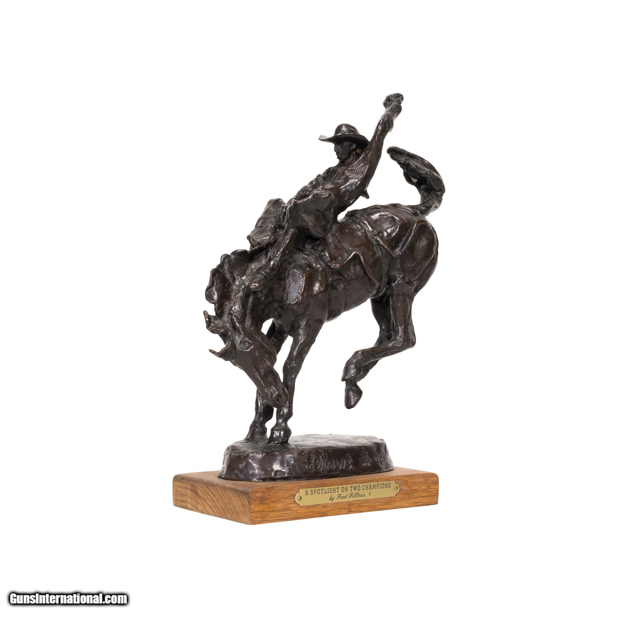 Description: "A Spotlight on Two Champions" bronze statue by Fred Fellows. Statue portrays a cowboy on horse back riding a bucking horse. The cowboy is bronc riding with one hand lifted in the air and the other grasped firmly on the saddle horn. This is a limited edition statue that is numbered 15/500. Was made for a 1986 trophy for the Hesston Cup. Well done bronze that is perfect for the cowboy or western home. Size: 10 1/2"H x 8" SOLD |