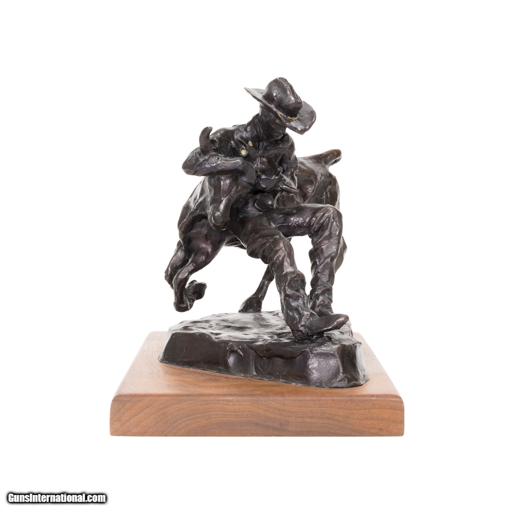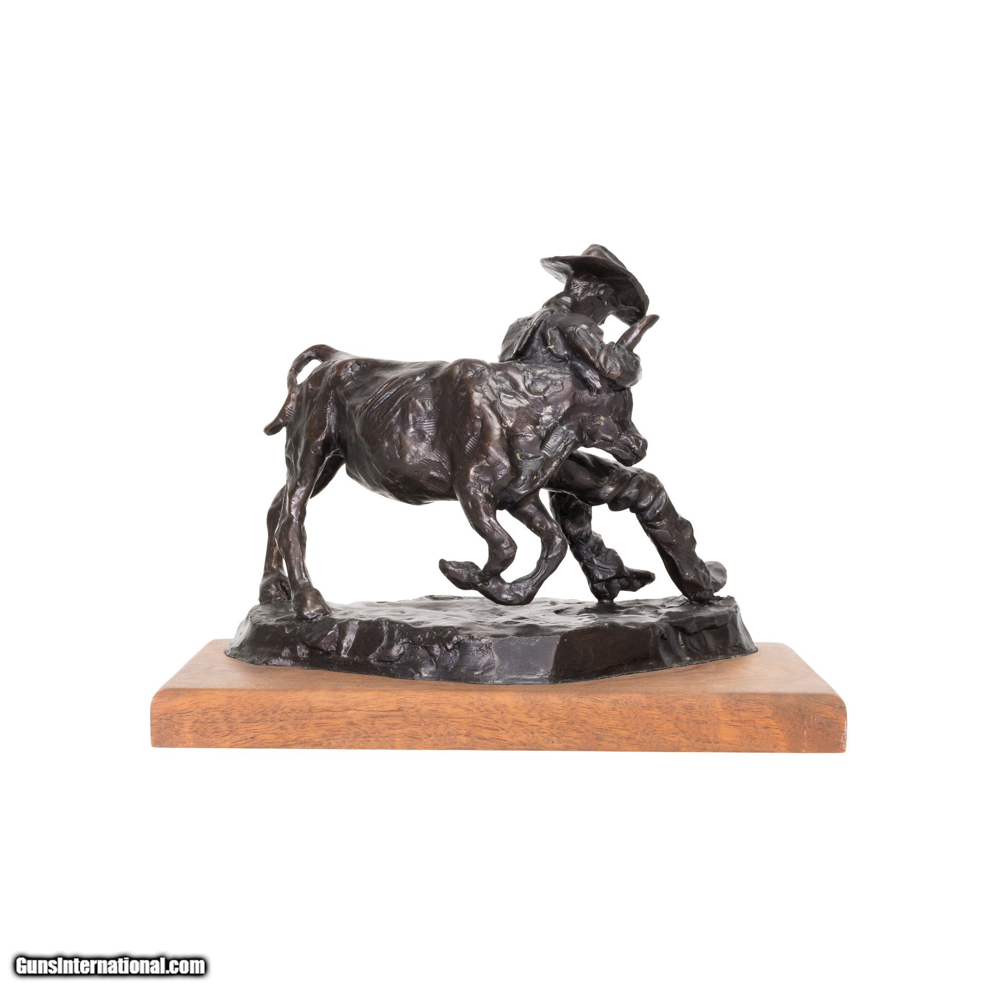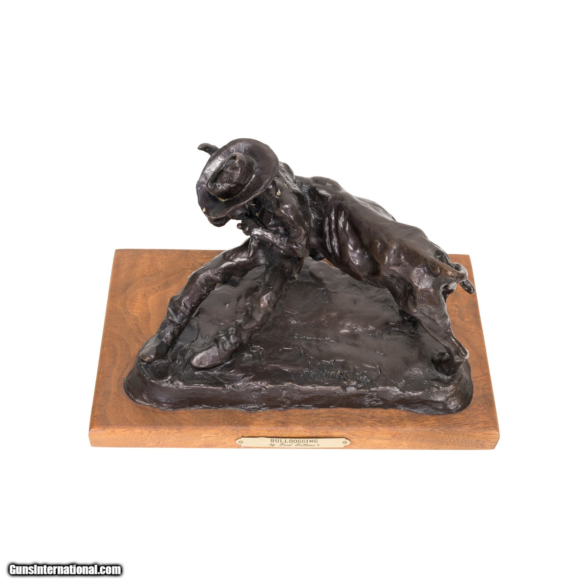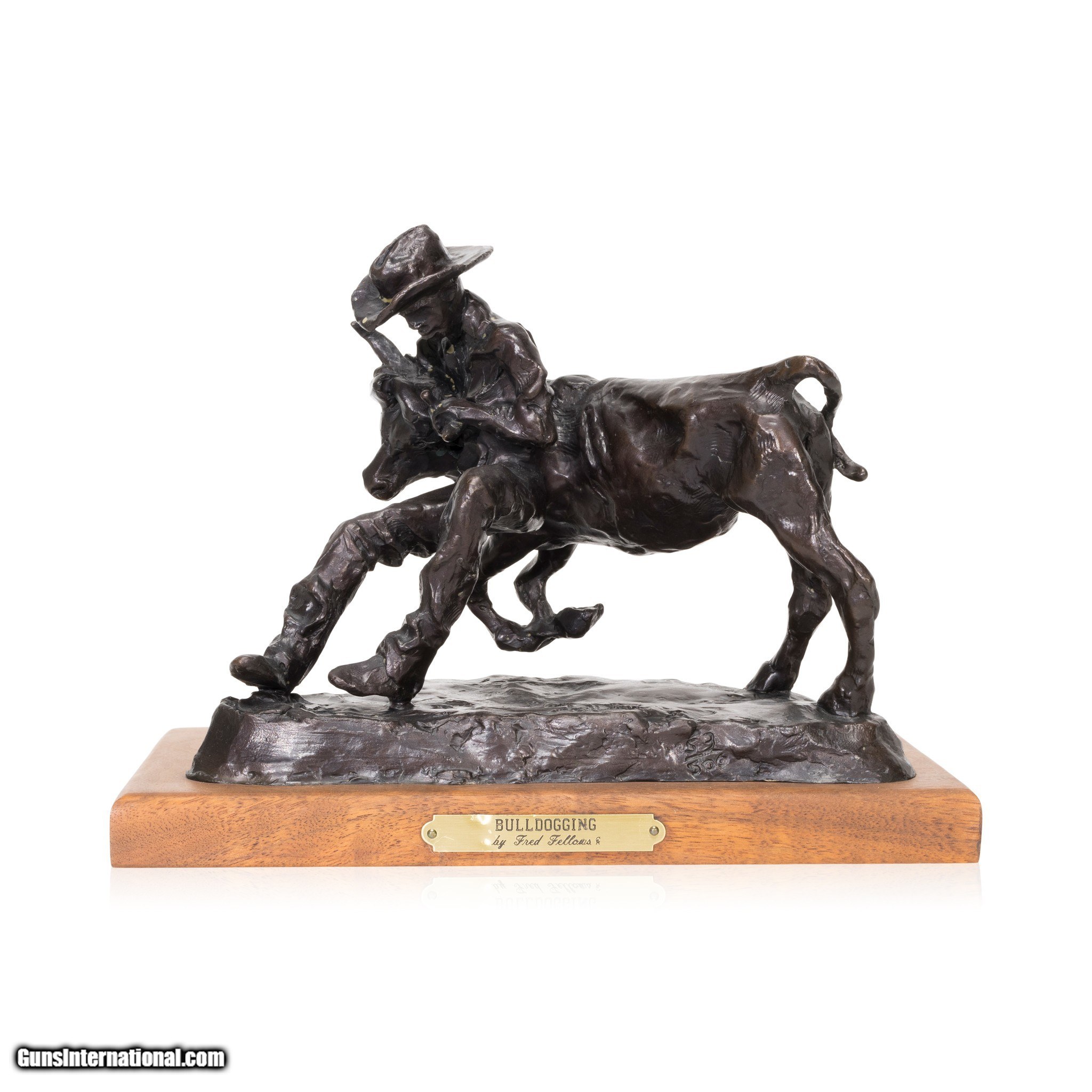 Description: "Bull Doggin' Bronze by Fred Fellows. Statue portrays a cowboy wrestling or 'bull dogging' a calf. He has a hold of both horns and is grappling the young bull into submission. Limited edition bronze, numbered 453/500. MAde as a trophy for the Hesston Corp. Perfect addition for any cowboy or western home. Size: 7” x 8” x 4” including base SOLD |