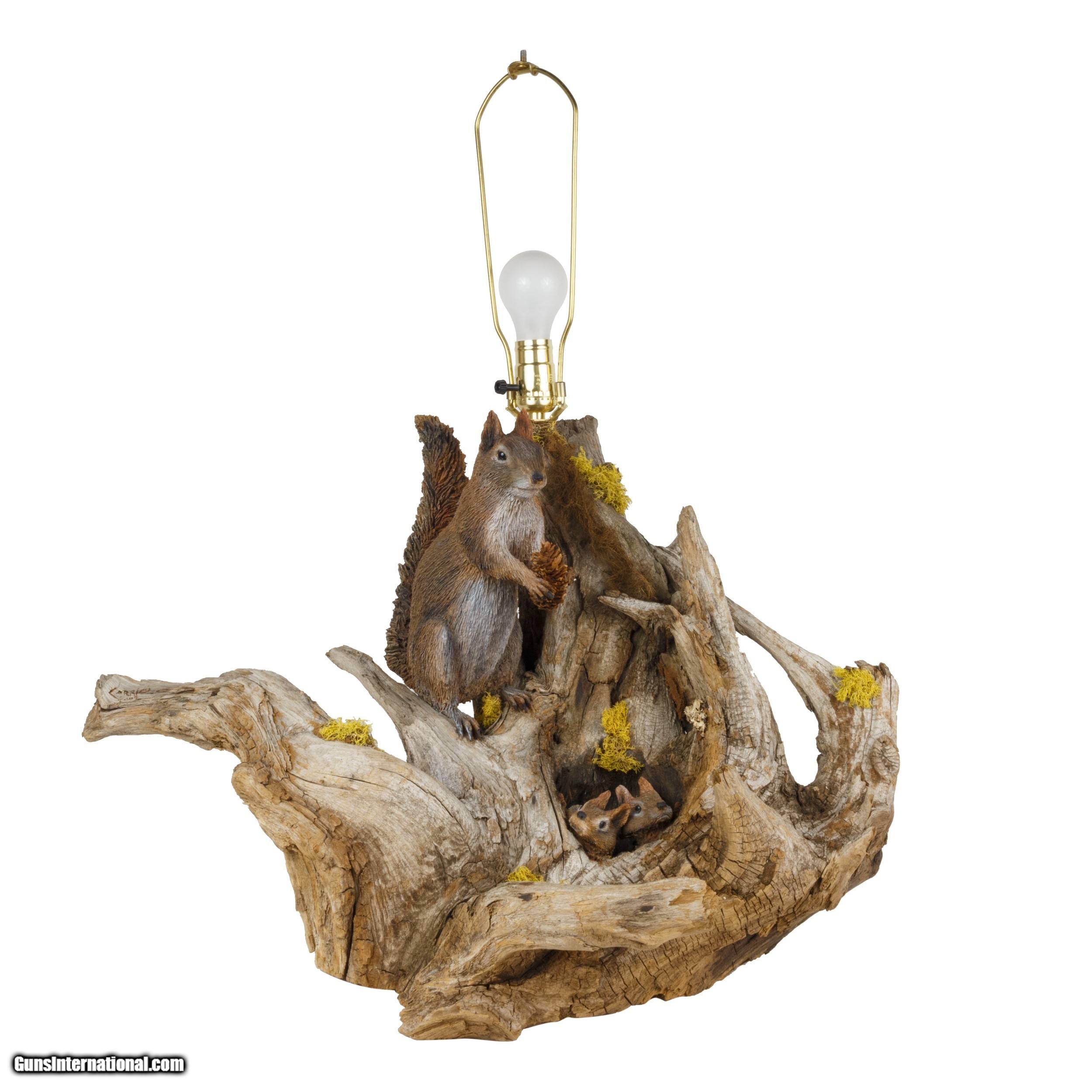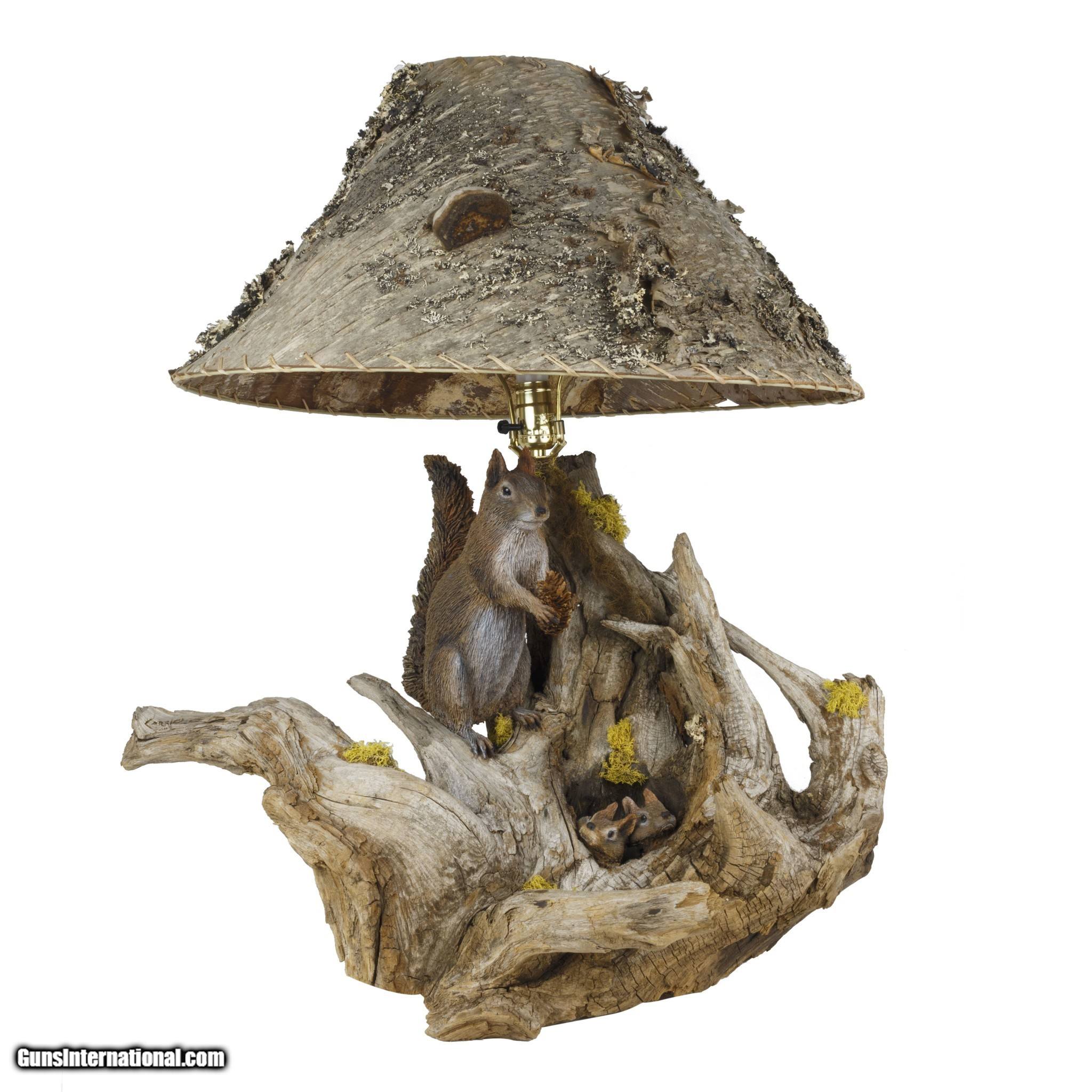 Description: Hand carved red squirrel table lamp with mother holding pinecone and two babies in their den. This lamp features realistic carvings on natural driftwood mounting with rustic birchbark shade with antler finial. This is an original piece signed and dated by North Idaho artist Paul Carrico. A whimsical piece perfect for rustic homes, hunting lodges, or cabins. Base 20" x 24", shade diameter 24", overall 31"H. SOLD |