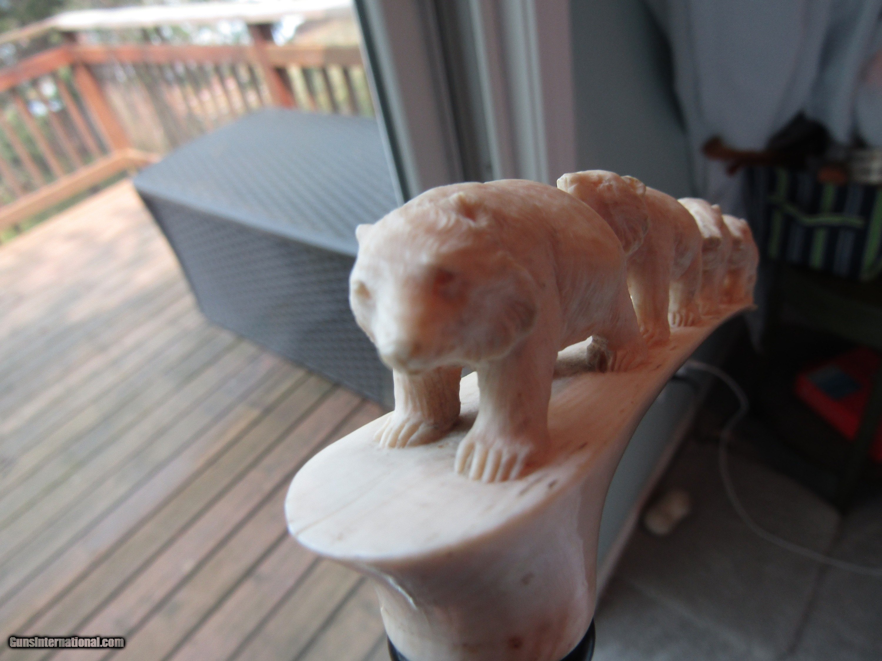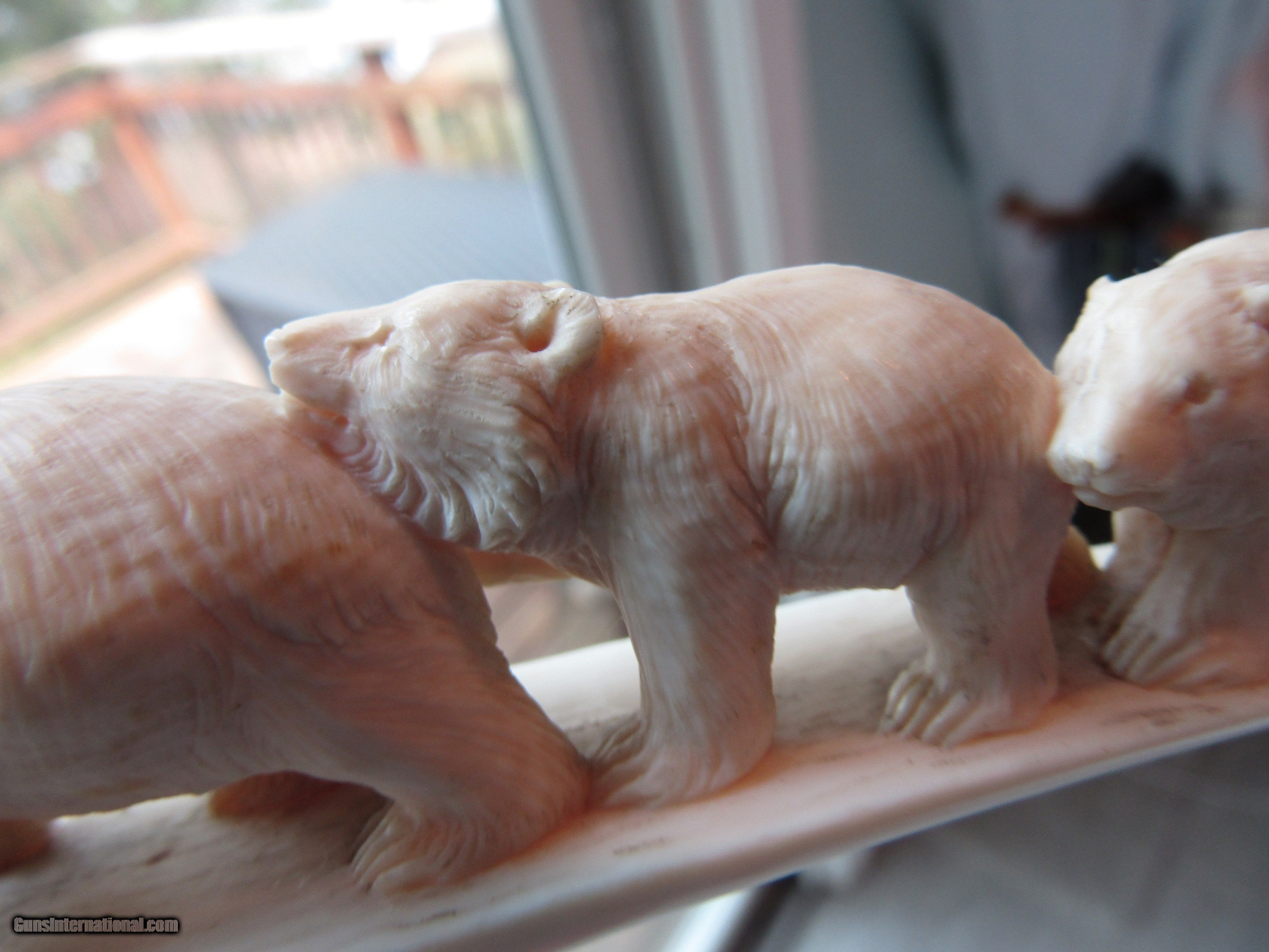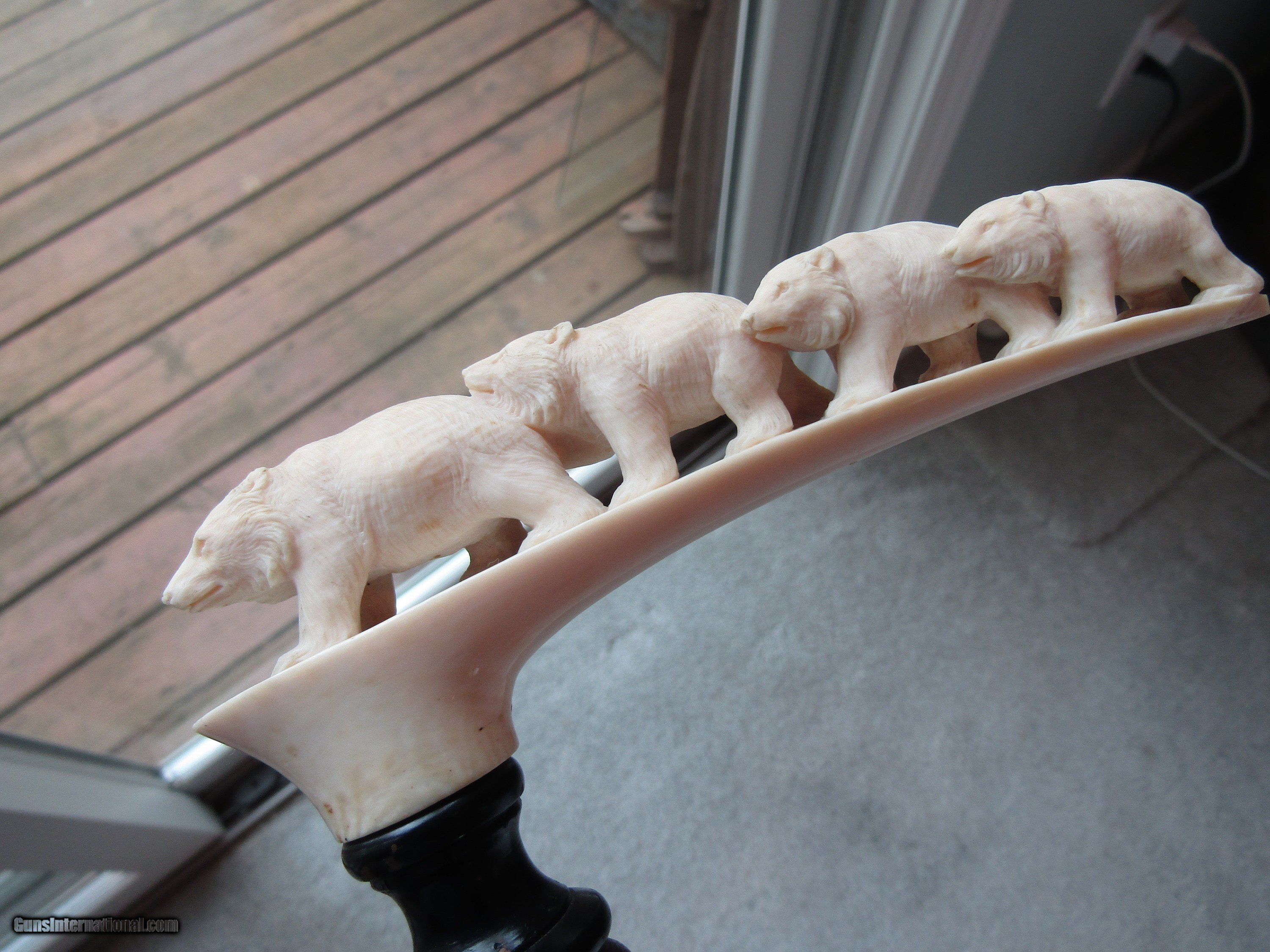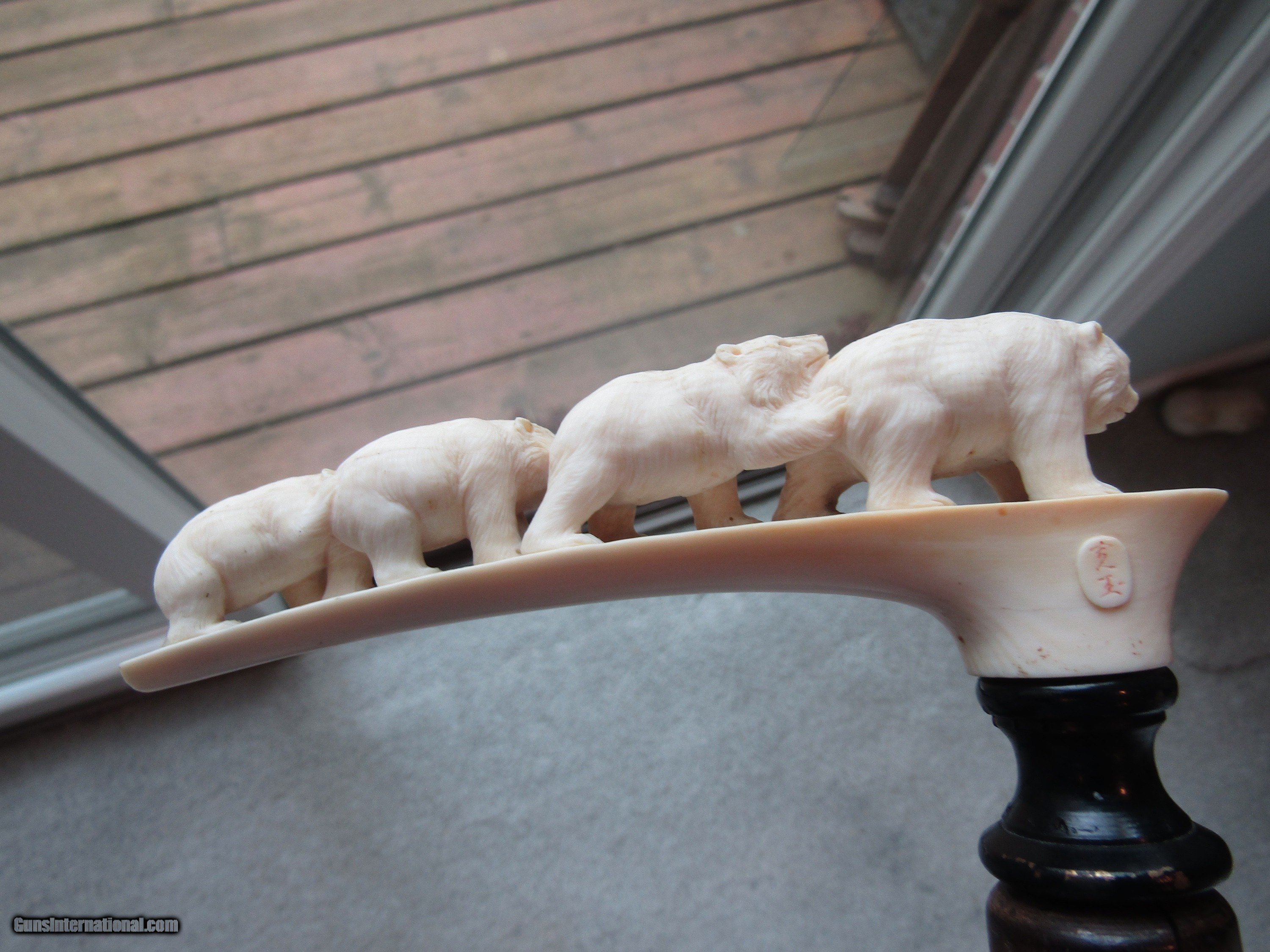 Description: This was bought from a collection, that had a pistol cane, and was being sold at the same time, it is signed in japanese early iI beleive, it has a small crack at the top of the stick, that effects nothing. The workman ship is amazing their is a mirco crack in the front , that again effects nothing an another tiny , tiny chip on the tail that you would have to look very close for to even see it. The four baers marching along as a family is cute, really is good to above good condition. I wish I could read japanese , if anyone can translate please help me out , DAN 859-533-5445 SOLD |