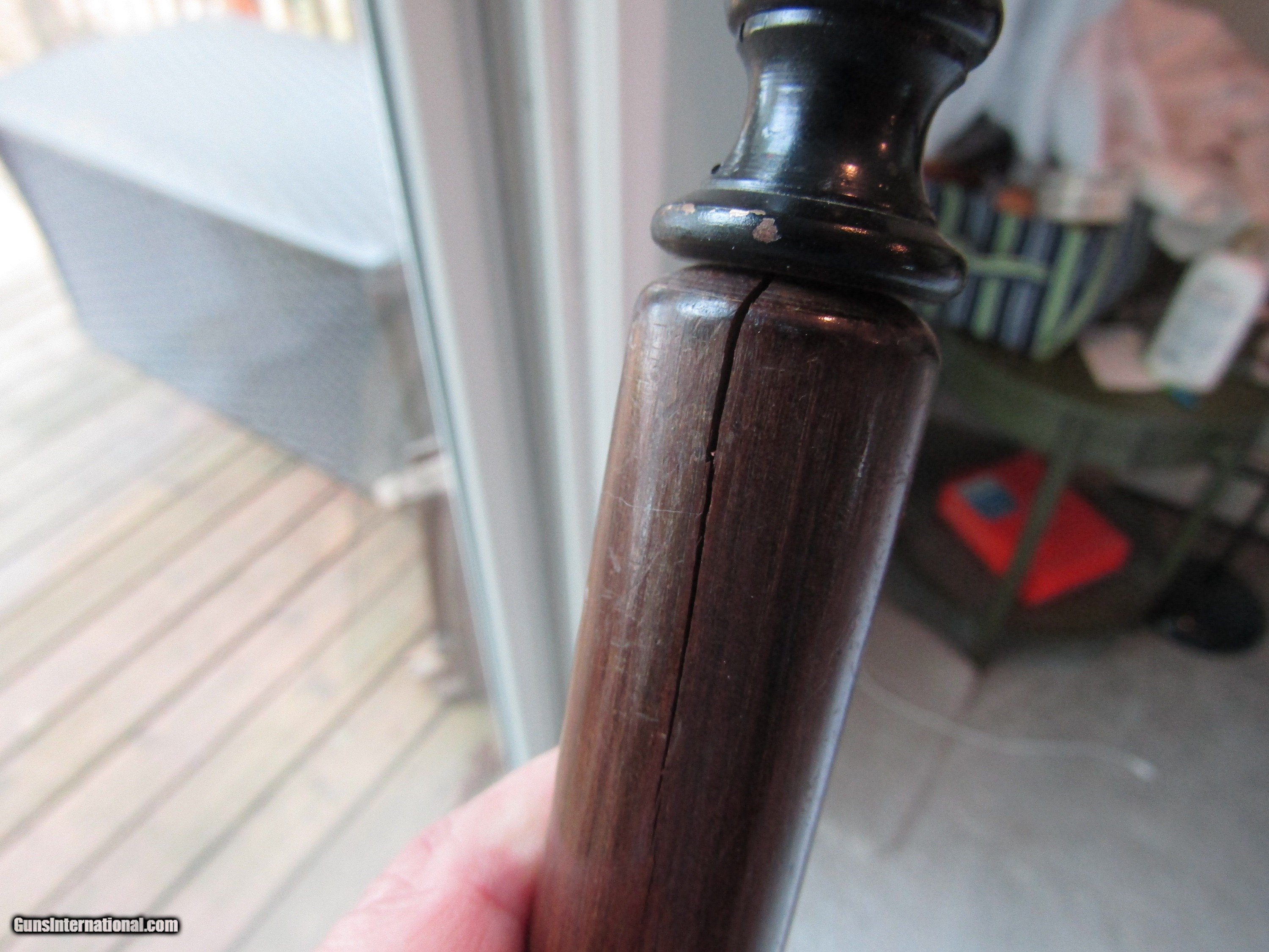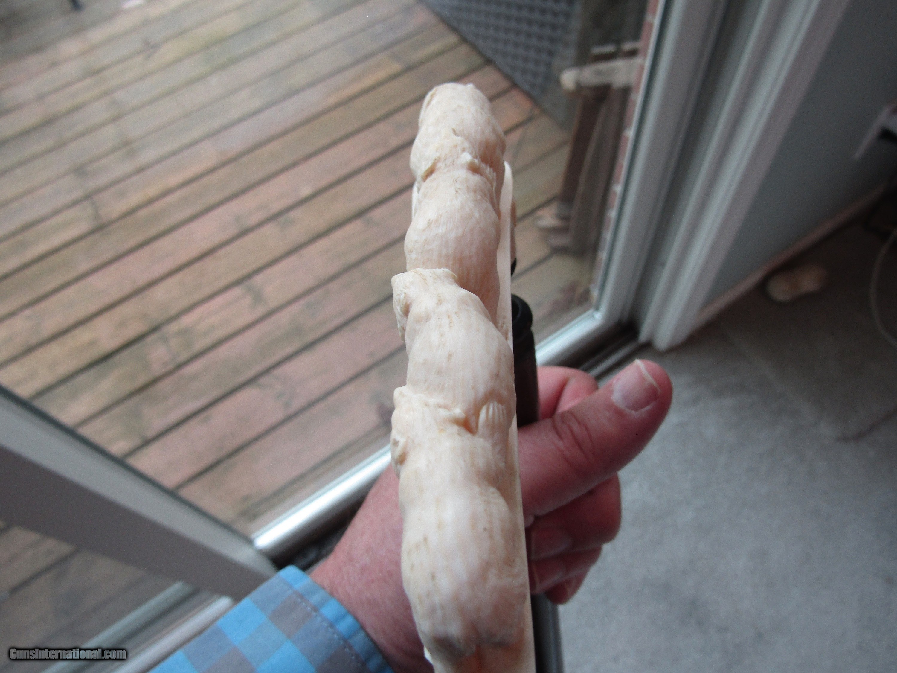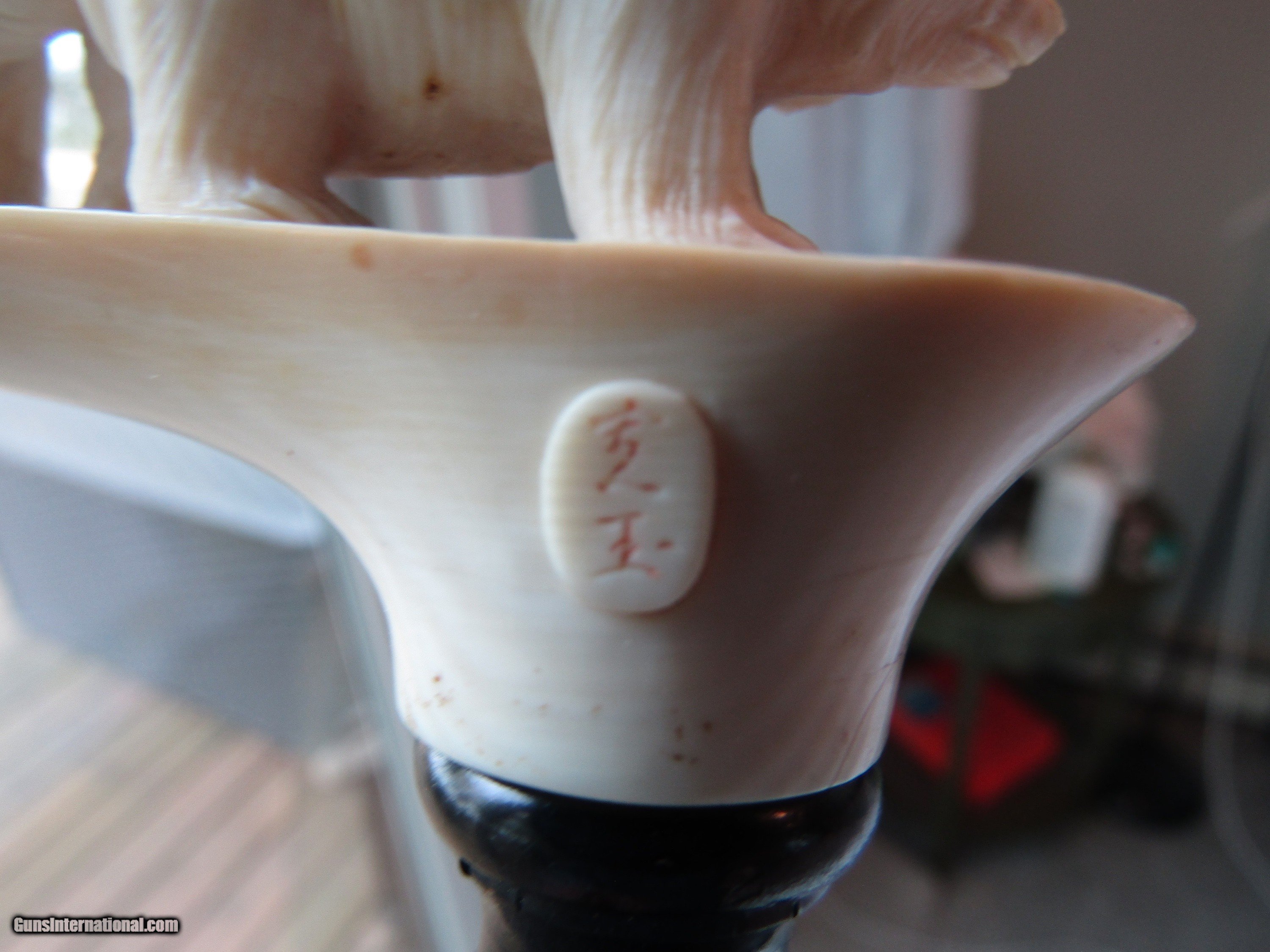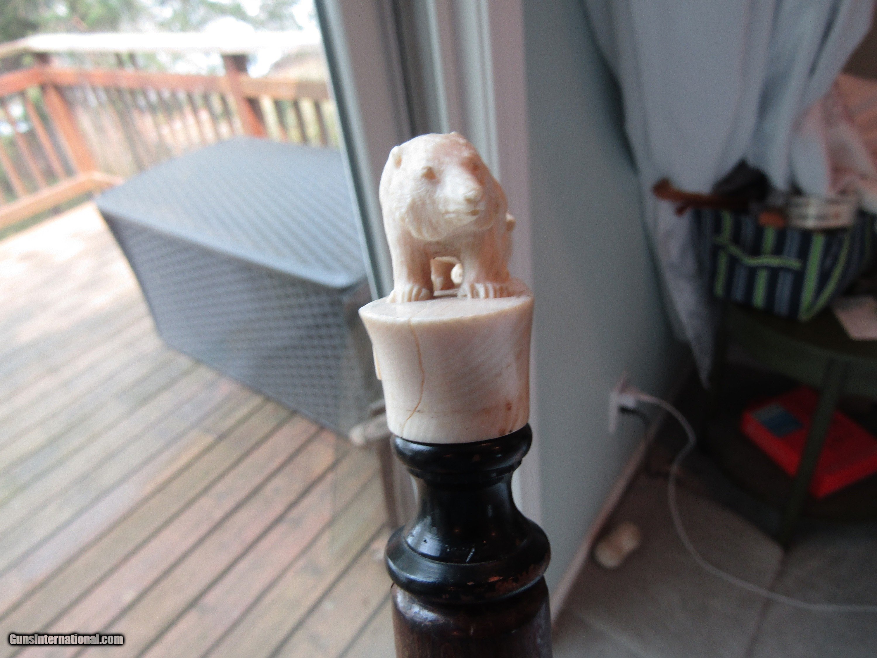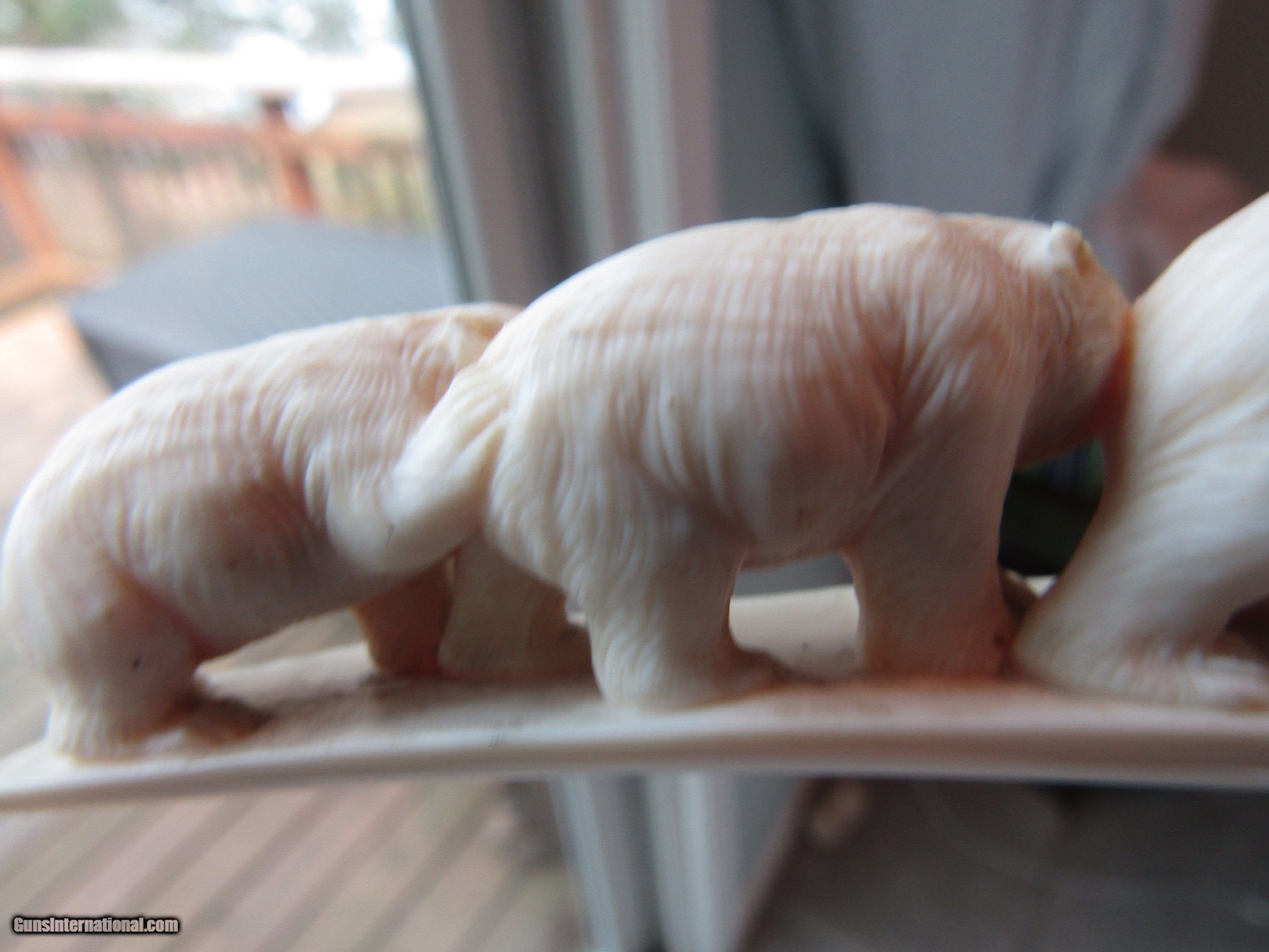 Description: This was bought from a collection, that had a pistol cane, and was being sold at the same time, it is signed in japanese early iI beleive, it has a small crack at the top of the stick, that effects nothing. The workman ship is amazing their is a mirco crack in the front , that again effects nothing an another tiny , tiny chip on the tail that you would have to look very close for to even see it. The four baers marching along as a family is cute, really is good to above good condition. I wish I could read japanese , if anyone can translate please help me out , DAN 859-533-5445 SOLD |