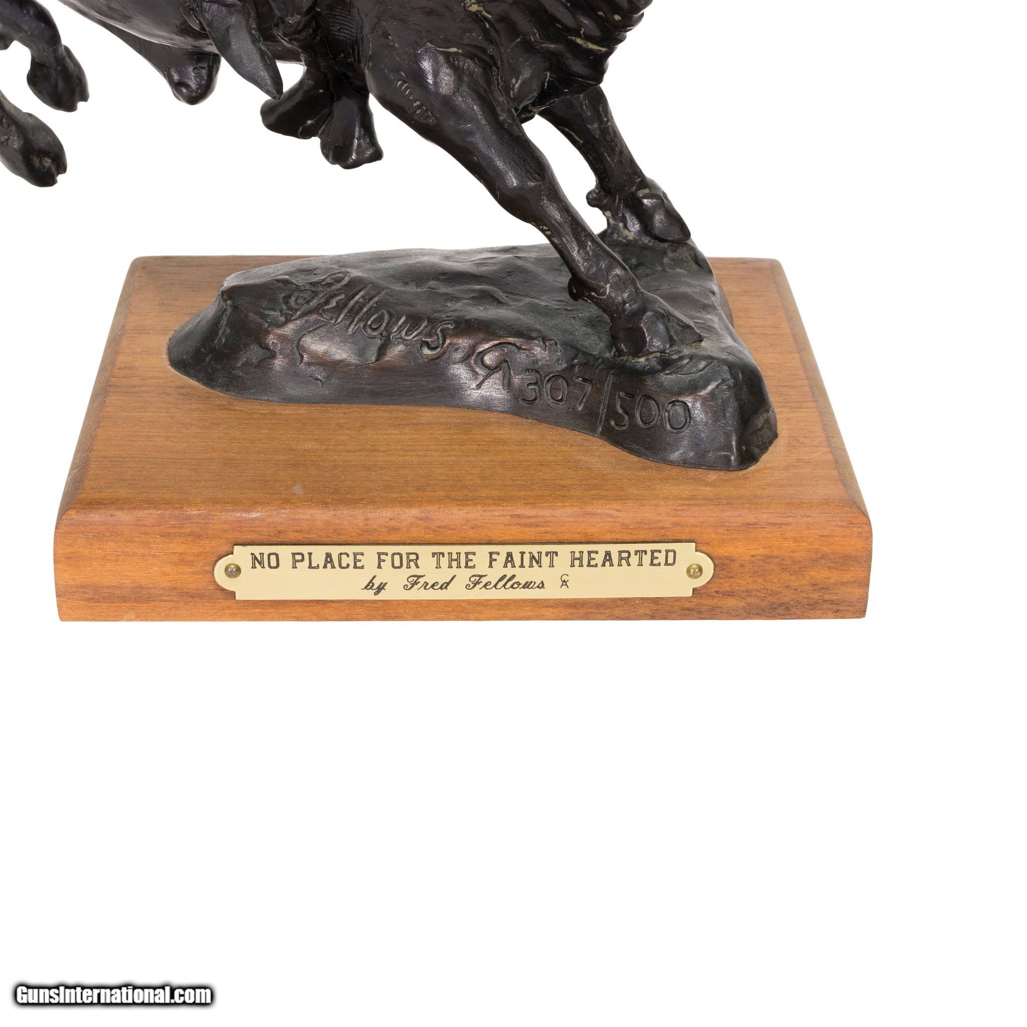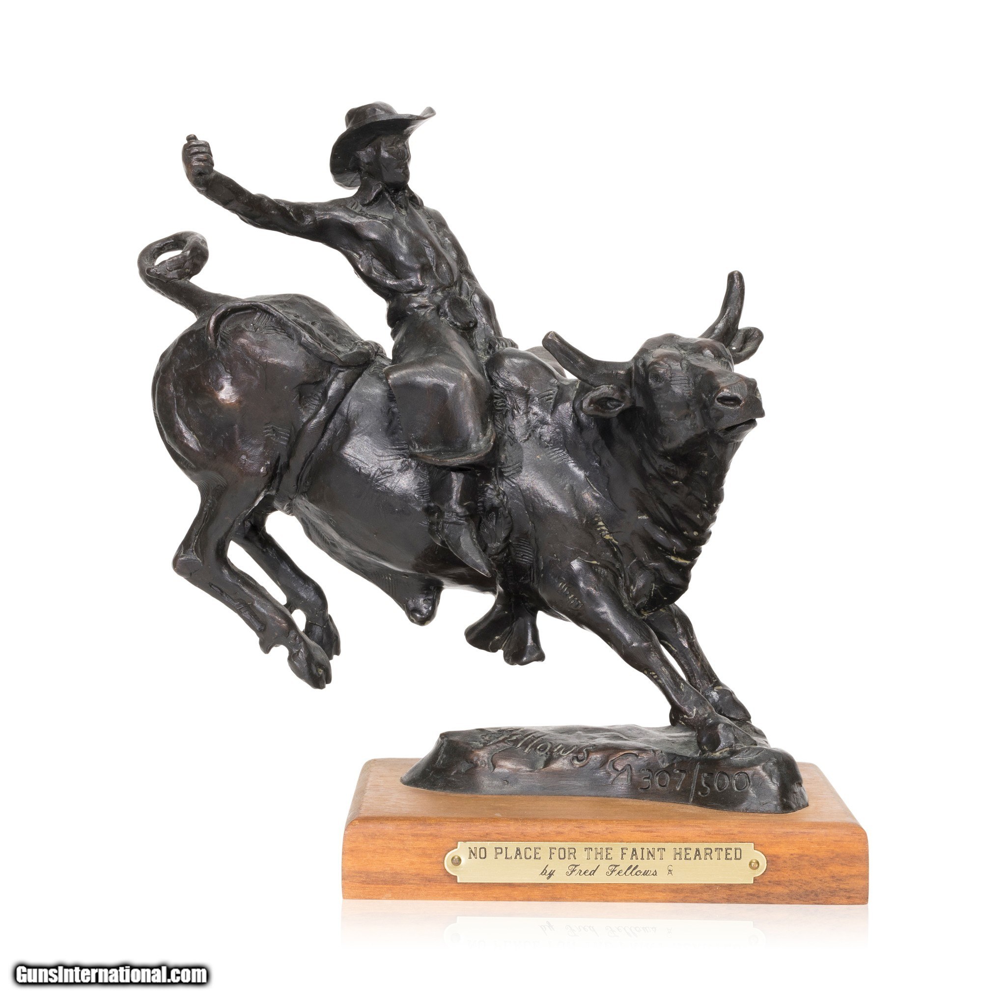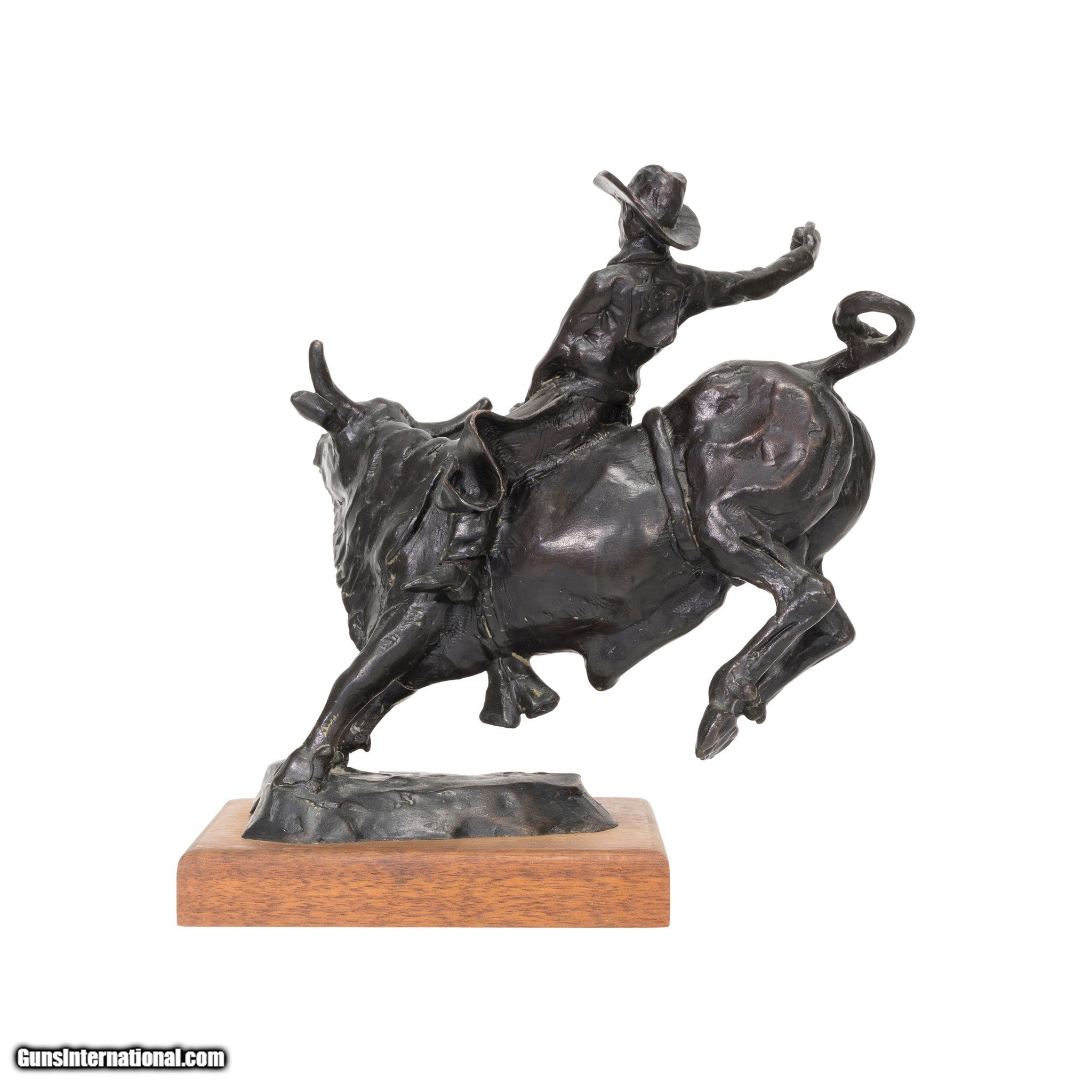 Description: No Place for the Fainthearted bronze by Fred Fellows. Piece portrays a cowboy bull riding. The bulls front hooves are on the ground and he is kicking his hind legs up into the air. The cowboy is moving with him, griping the saddle with one hand and the other hand in the air. This is a limited edition bronze, numbered 307/500. Made as a trophy for the Hesston Corp. Perfect addition to a cowboy or western themed home. Size: 10" including base x 8" SOLD |