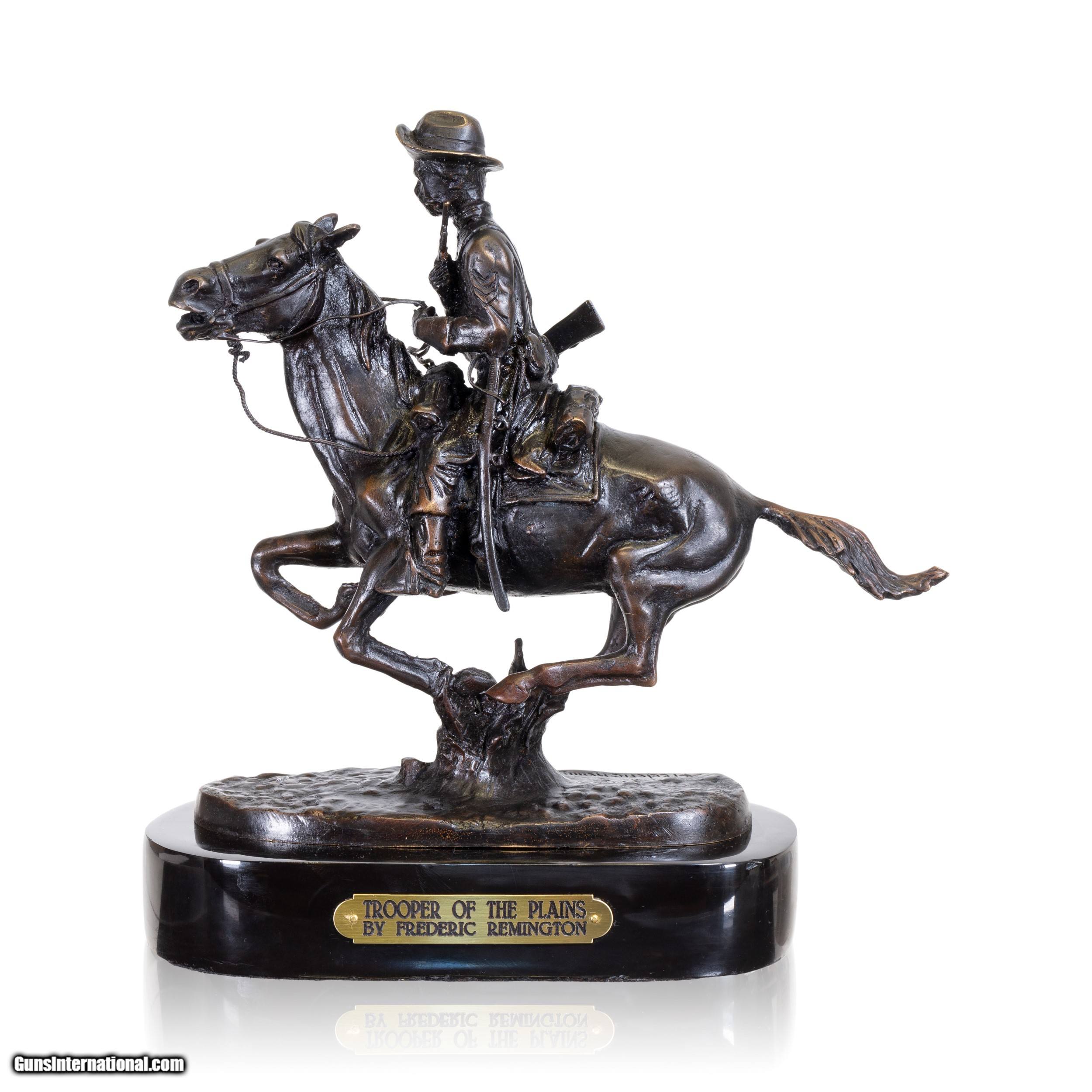 Description: Frederic Remington (1861-1909) depicted the life of the cowboy during the 1880s and 1890’s better, perhaps, than any other artist of his time. He thought of himself as a true citizen of the American West. A native of Canton, New York, Remington left college at the age of 19, looking for adventure in the West. Remington operated his own ranch in Kansas, and in 1886 he gave it up as a failure and came back to the East. The experience served him well in his later career as an artist. “What success I have had,” Remington once told a newspaper reporter, “has been because I have a horseman’s knowledge of a horse. No one can draw equestrian subjects unless he is an equestrian himself.” As an artist, Remington first made a name for himself as an illustrator and painter, and began sculpting only 14 years before his death in 1909. “I was impelled to try my hand at sculpture by a mental desire to say something in the round as well as in flat. Sculpture is the most perfect expression of action. You can say it all in clay.” The first Remington in clay was “Bronco Buster,” completed in 1885. Among his admirers were Theodore Roosevelt, who once said that “Remington portrayed a most characteristic and yet vanishing type of American life. The soldier, the cowboy, the rancher, the Indian, the horses and the cattle of the plains will live in his pictures and bronzes, I verily believe for all time.” Free shipping. Sizes (Mini) 9 1/2"H x 10"L, (Medium) 11 1/2"H x 11 1/2"L, (Regular) 21 1/2"H x 24"L PERIOD: Contemporary ORIGIN: Cisco's SIZE: Multiple Sizes Available SOLD |